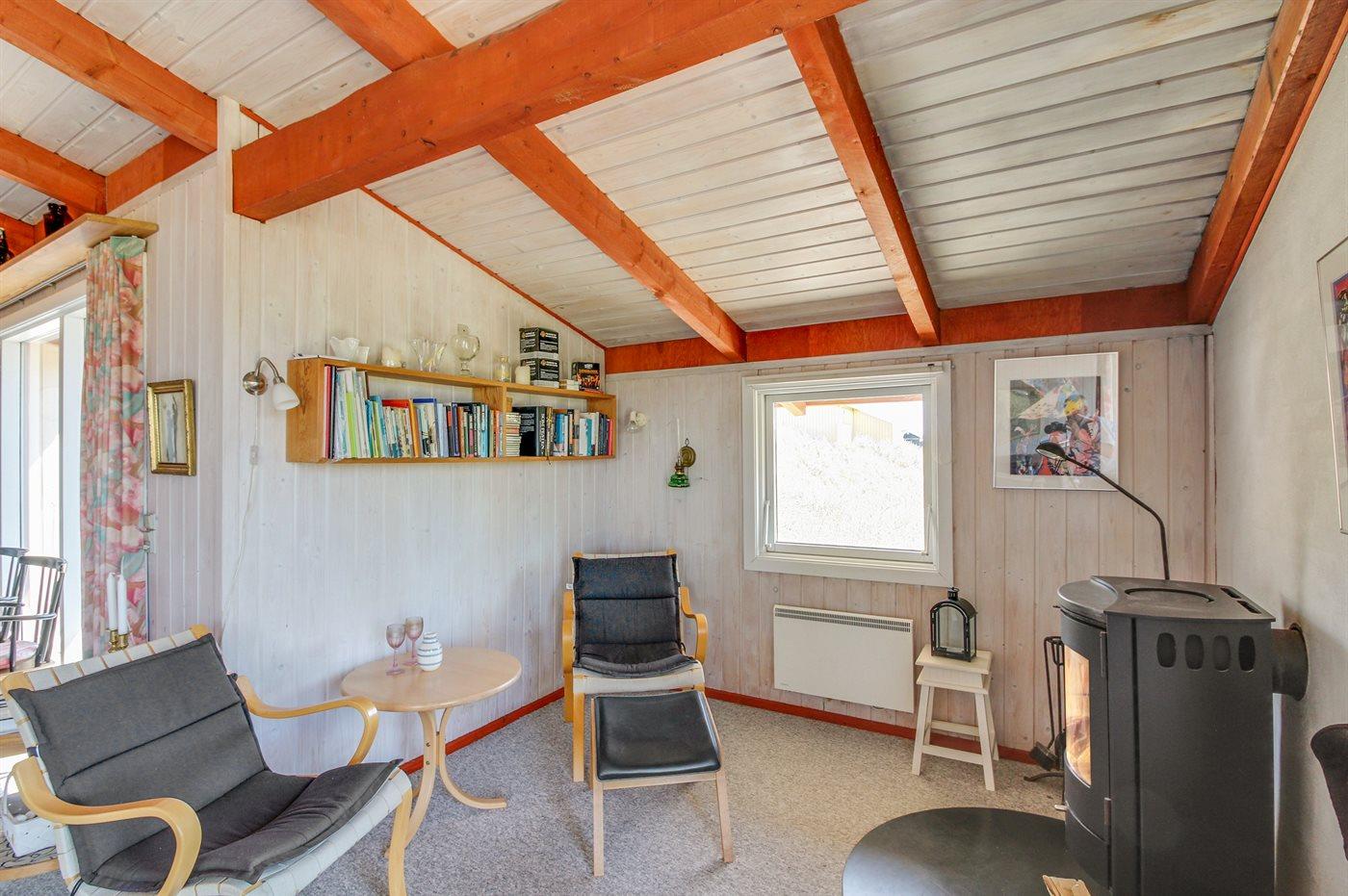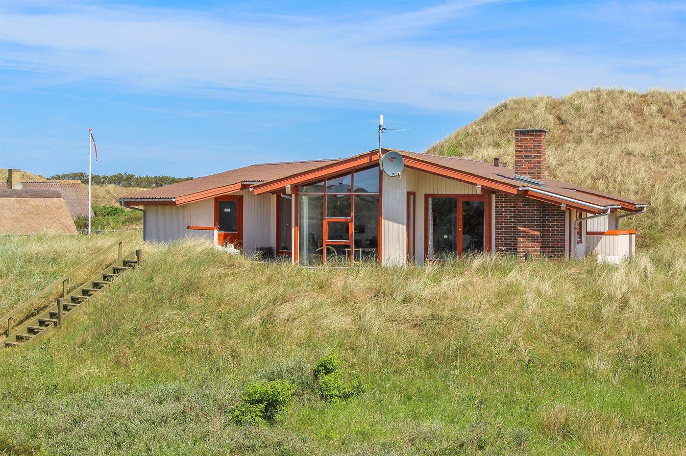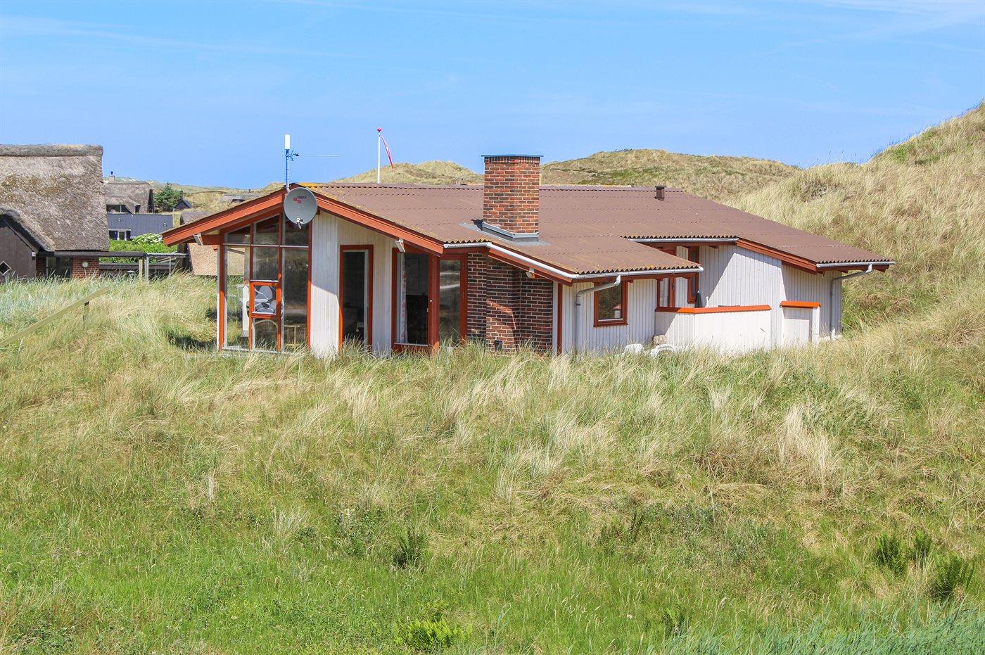 Dejligt sommerhus med en flot beliggende på en meget stor og kuperet grund med flot udsigt over klitområdet, havet og fjorden fra toppen af grunden. Få trappetrin op til huset.