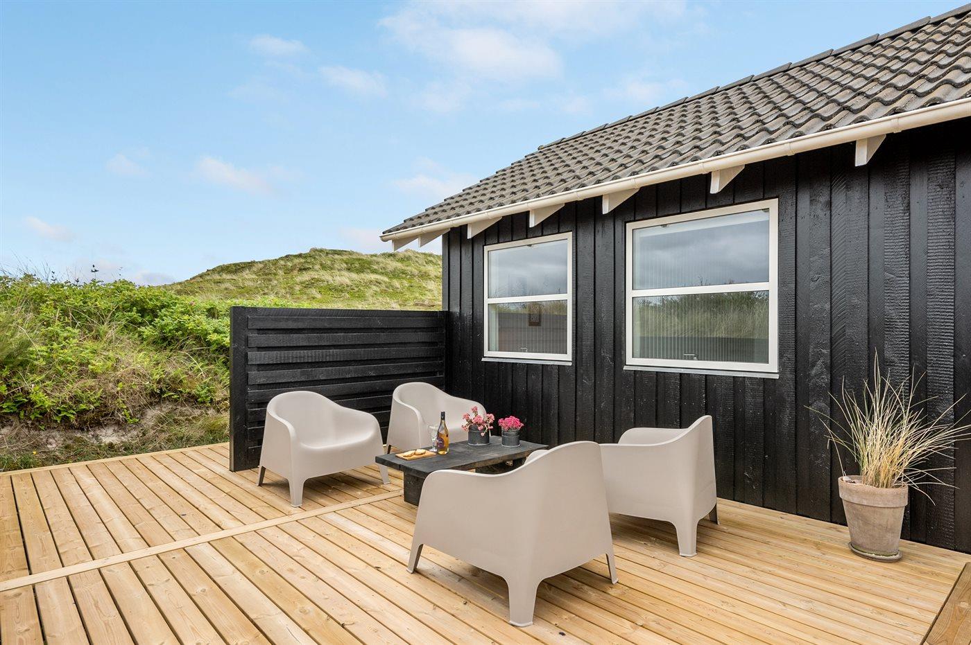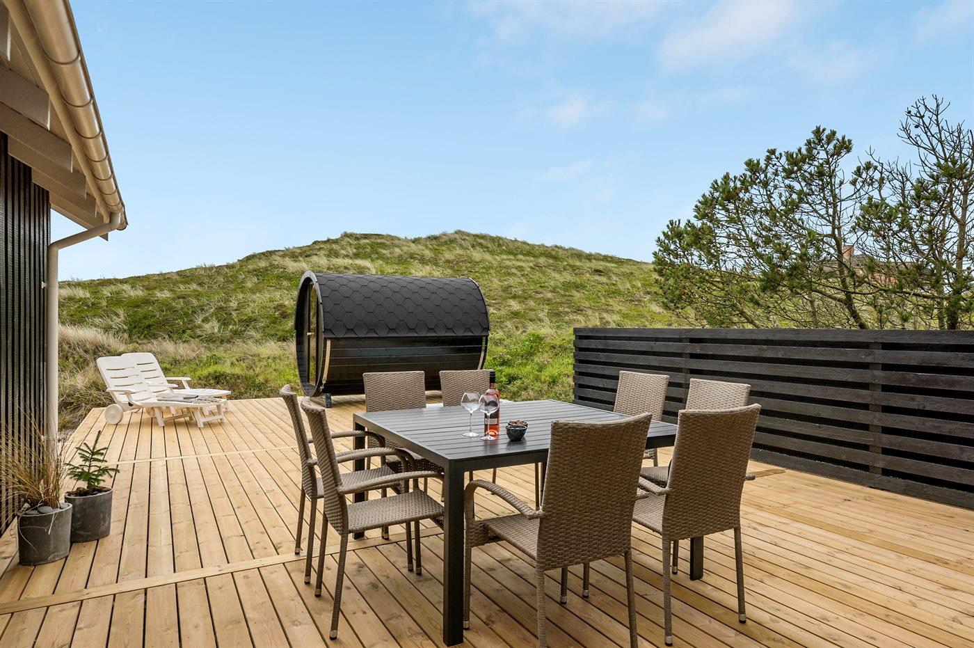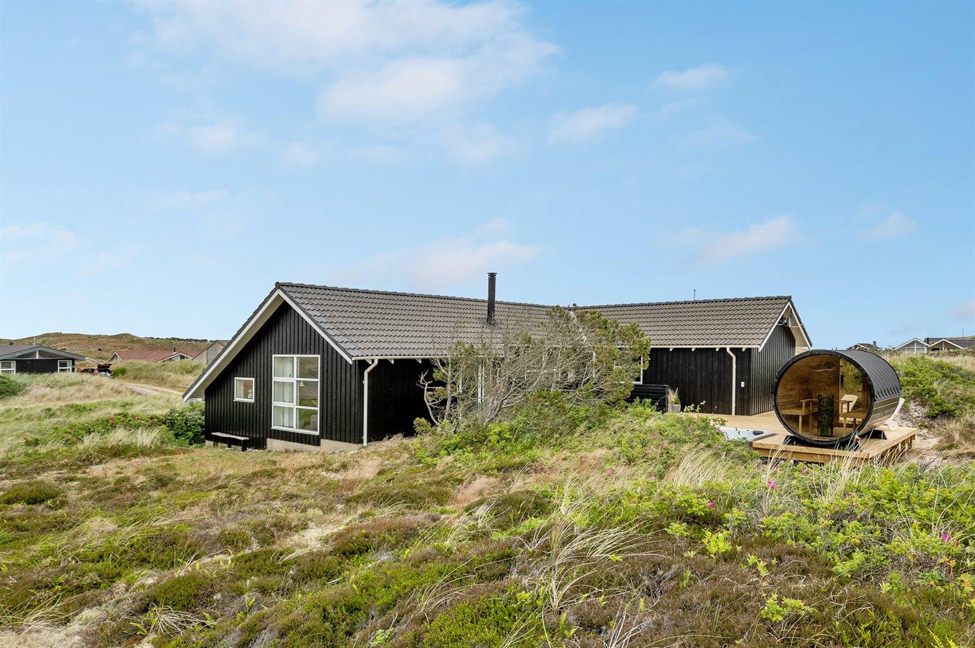 Dette dejlige sommerhus er beliggende på en meget stor og kuperet klitgrund, hvor der fra grunden er udsigt til både havet og fjorden. Til huset hører et unikt, stort terrasseareal med masser af havemøbler, en dejlig udendørs spa til 5 personer samt en tøndesauna med panoramaudsigt over klitterne, begge kan benyttes året rundt.