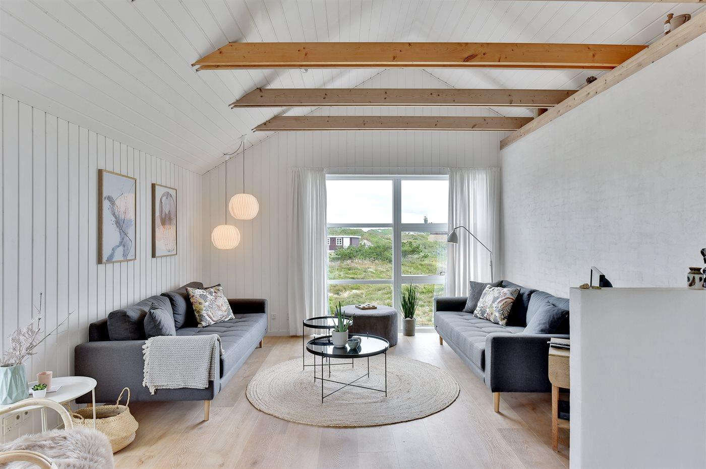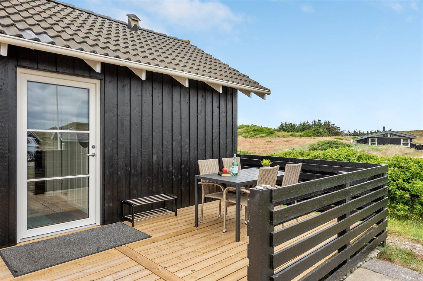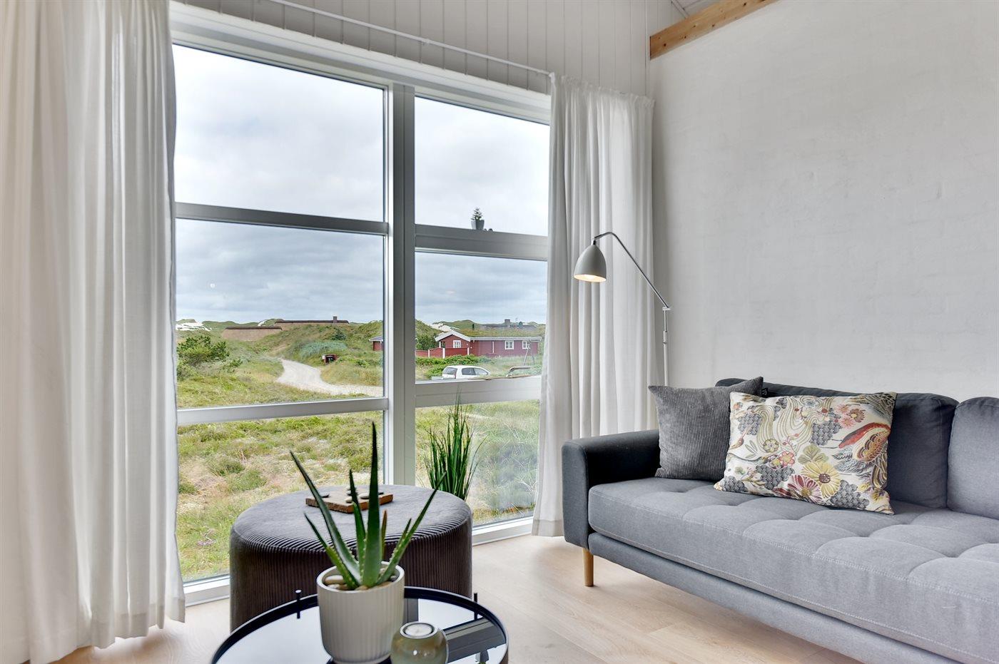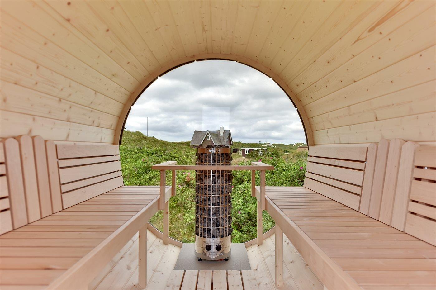 Dette dejlige sommerhus er beliggende på en meget stor og kuperet klitgrund, hvor der fra grunden er udsigt til både havet og fjorden. Til huset hører et unikt, stort terrasseareal med masser af havemøbler, en dejlig udendørs spa til 5 personer samt en tøndesauna med panoramaudsigt over klitterne, begge kan benyttes året rundt.
