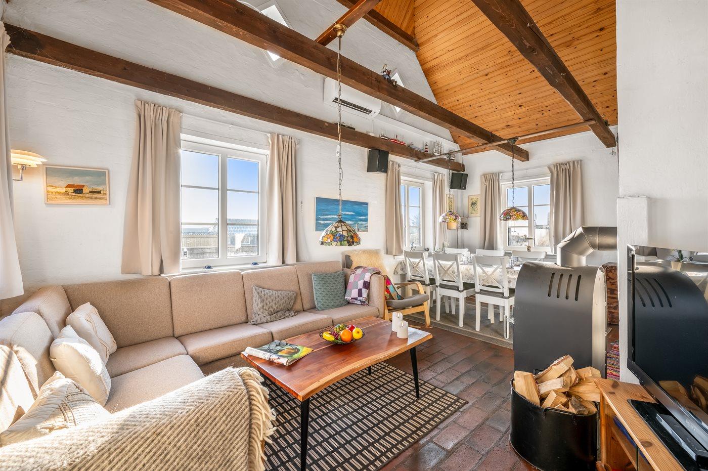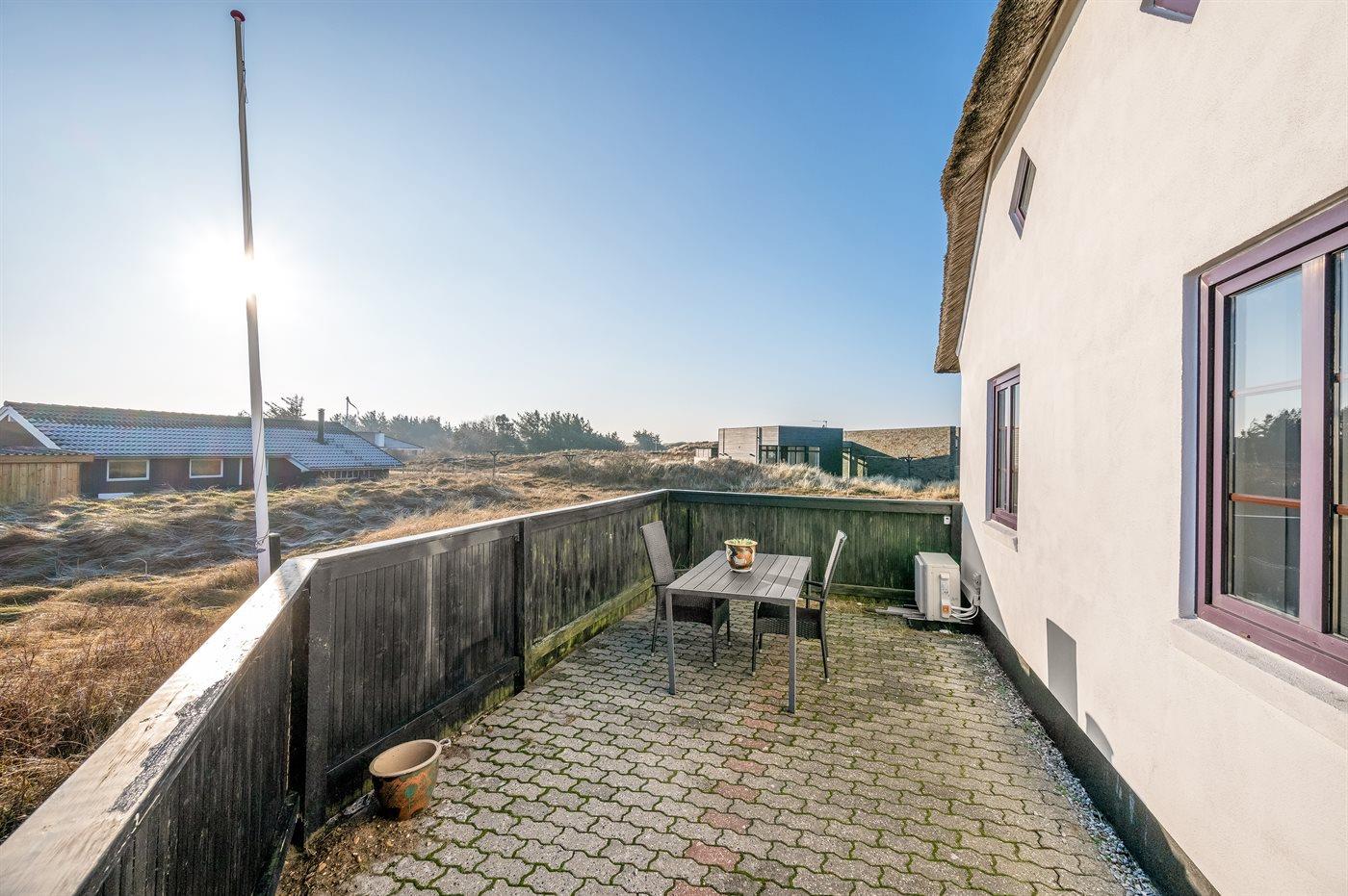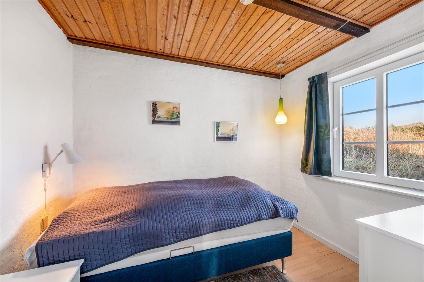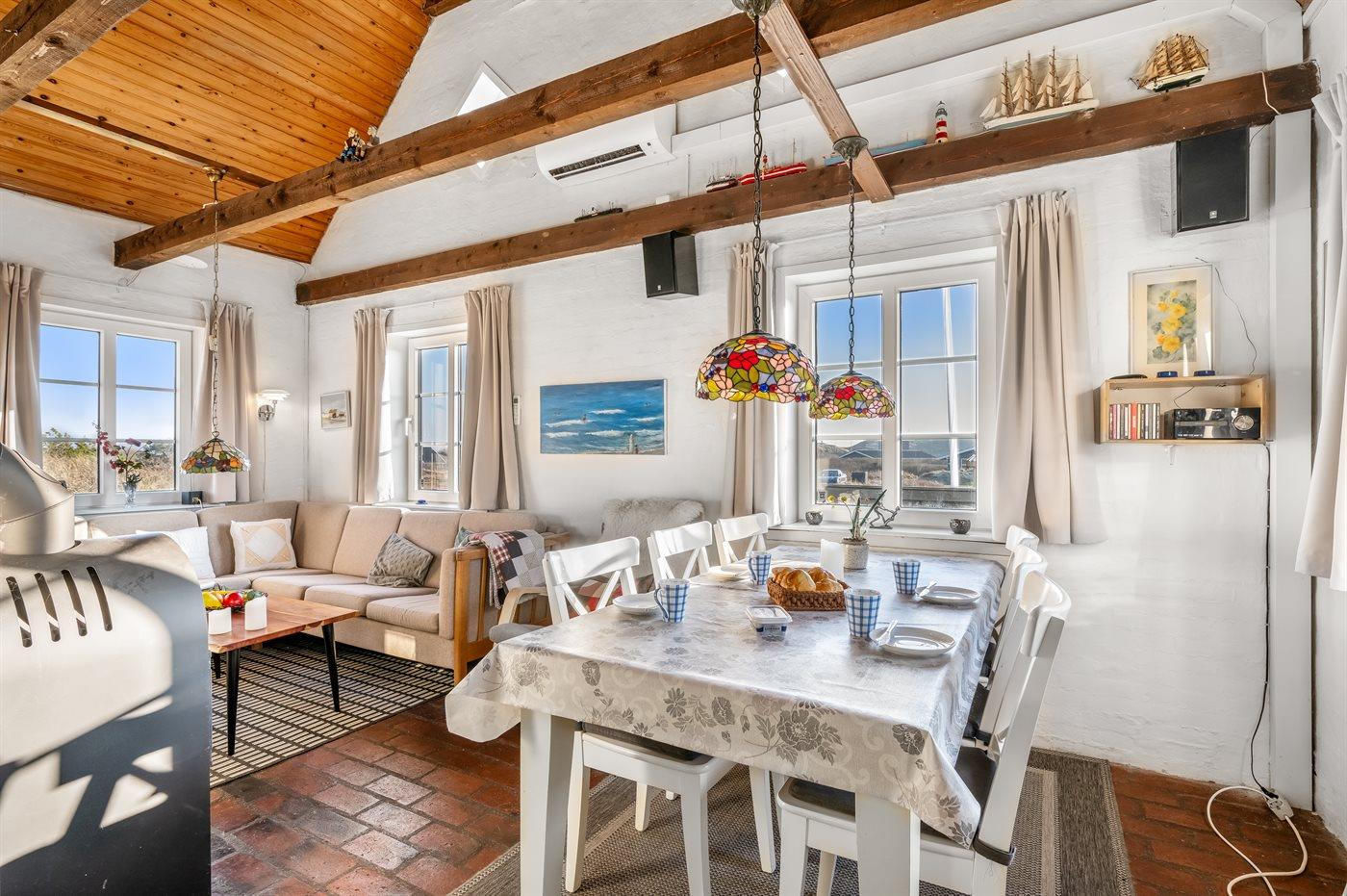 Charmerende sommerhus med stråtag beliggende på en meget stor og kombineret natur-/klitgrund med fjordudsigt fra hus og grund. Huset har smukke skrånende trælofter, malede stenvægge samt stengulve overalt - dog med trægulve på 1. sal.