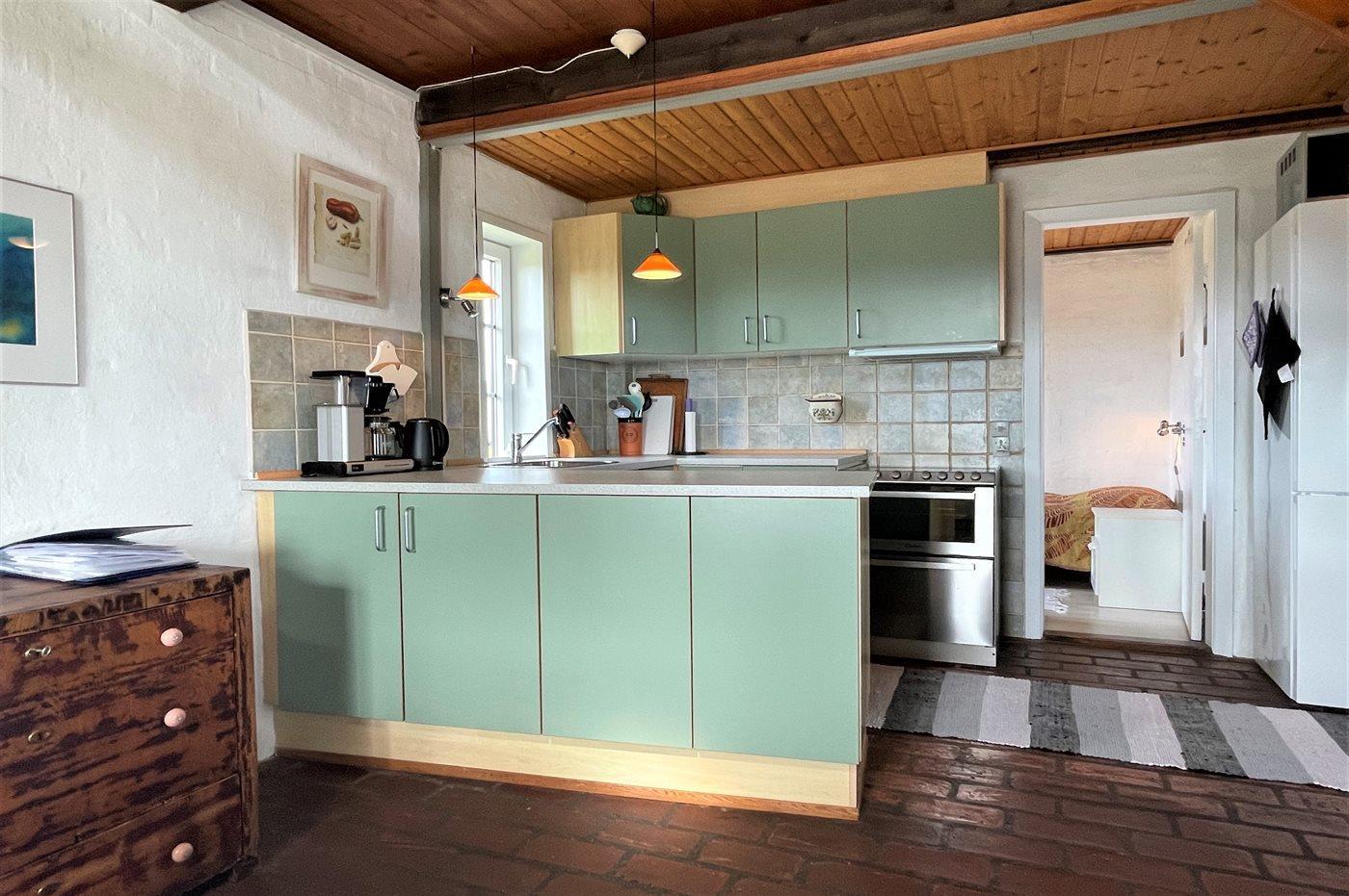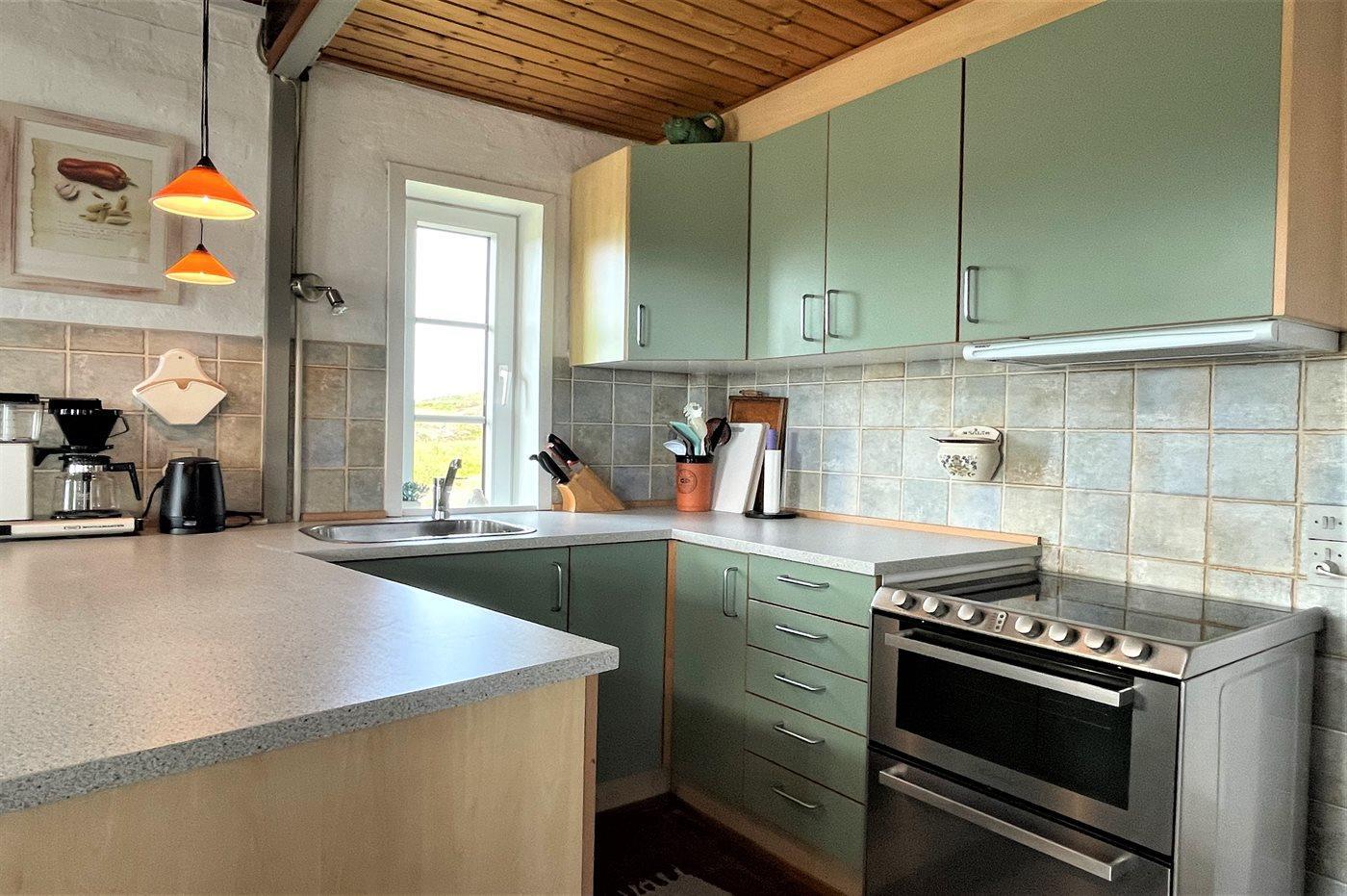 Køkkenet er udstyret med 1 køleskab. Der er 4 elkogeplader, bageovn, mikrobølgeovn samt opvaskemaskine.