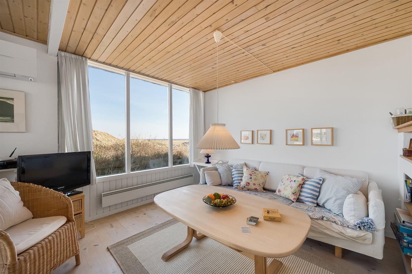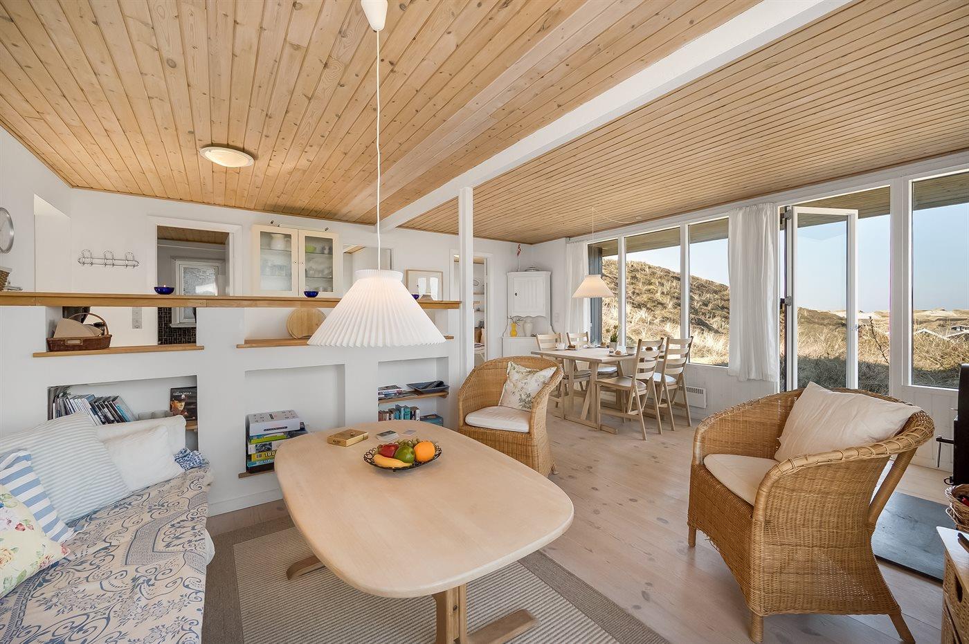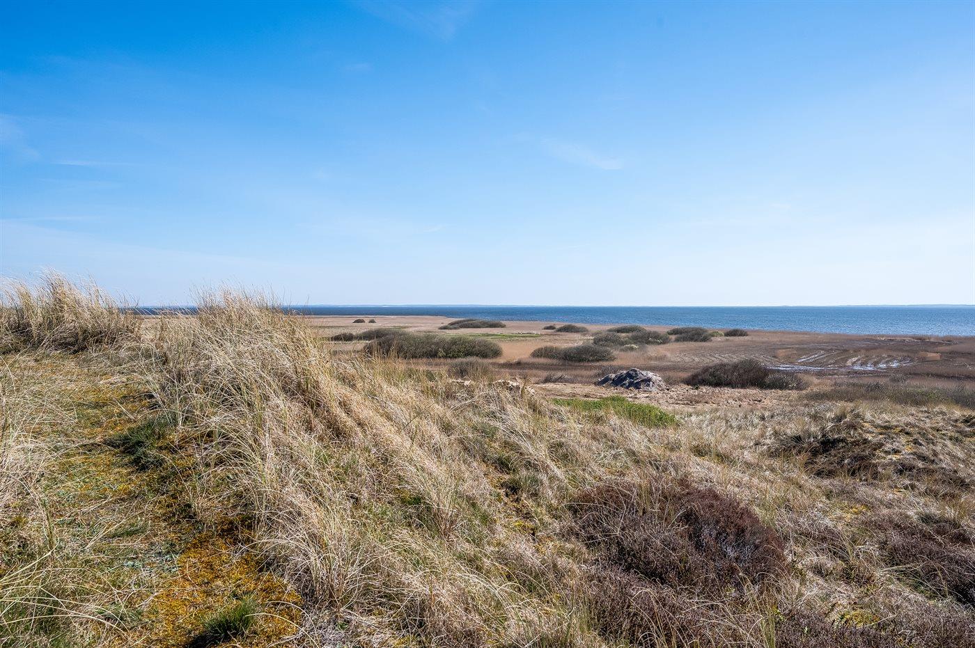 Hyggeligt sommerhus beliggende højt på en dejlig, meget stor og kuperet klitgrund. Der er udsigt over fjorden fra såvel hus som grund og havkig fra det højeste punkt på klitgrunden. Til huset hører åbent, ugenert terrasseareal.