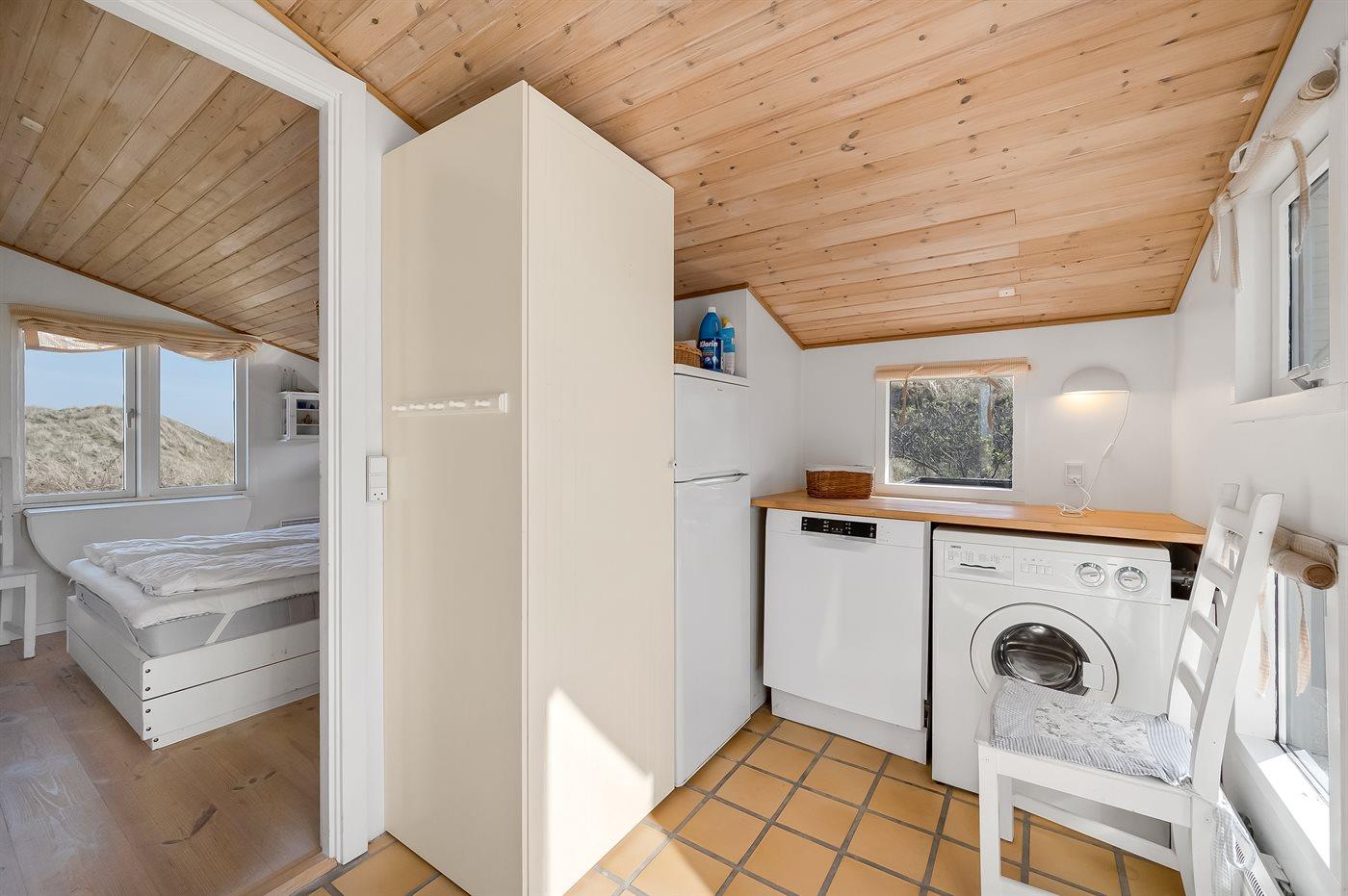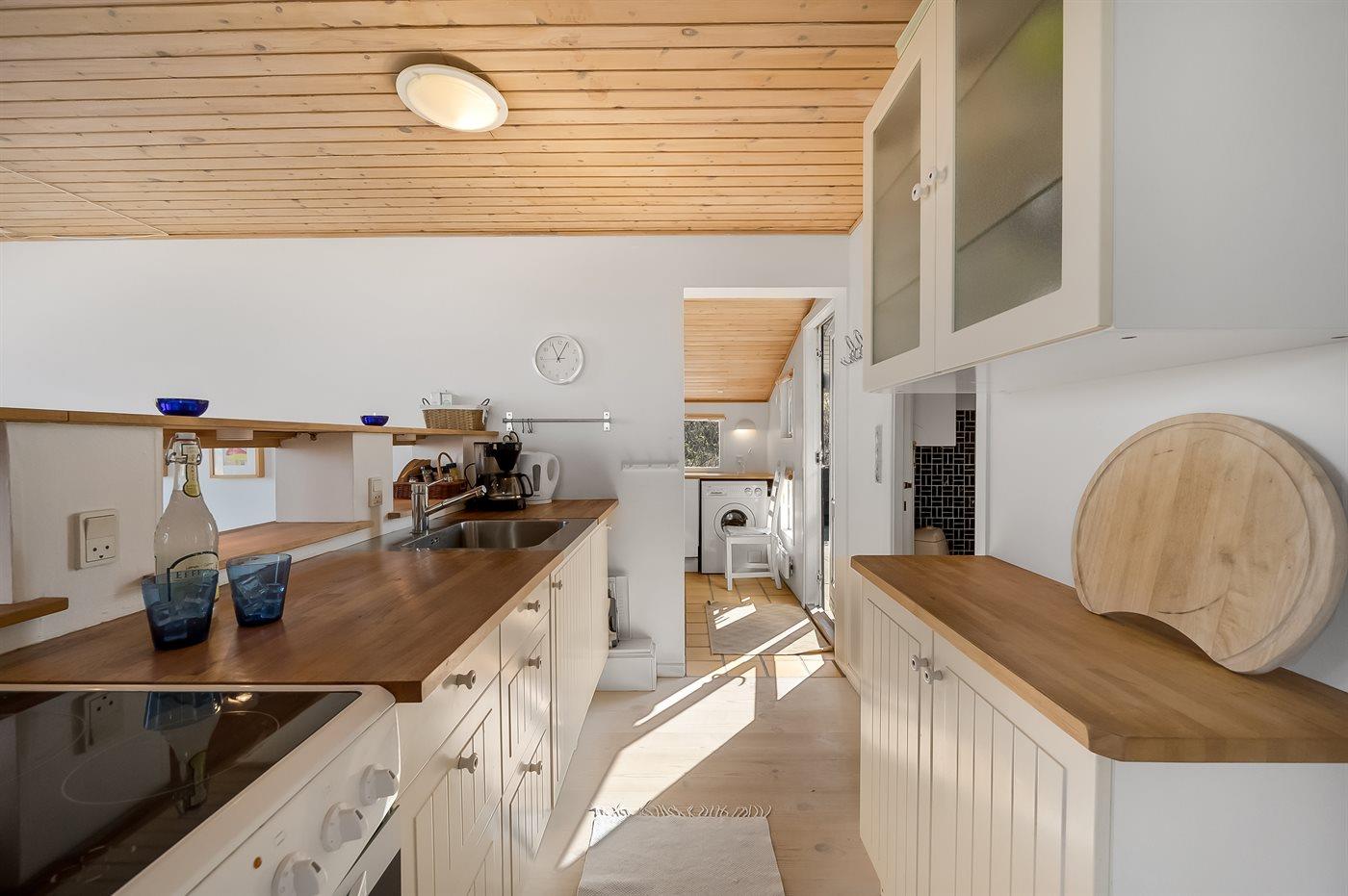 Køkkenet er udstyret med 1 køleskab. Der er 4 keramiske kogeplader, bageovn samt opvaskemaskine.