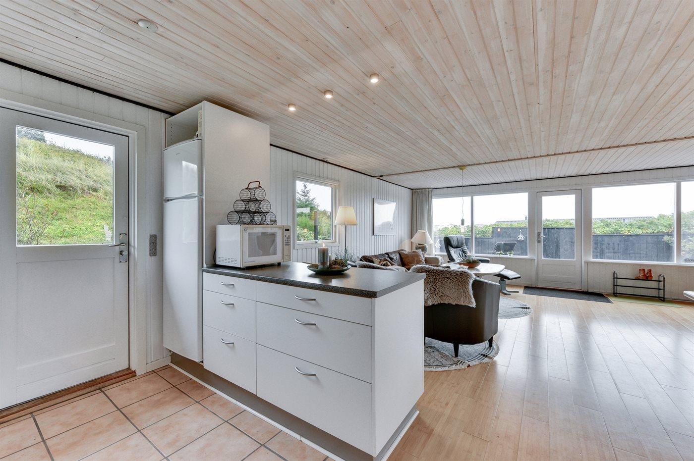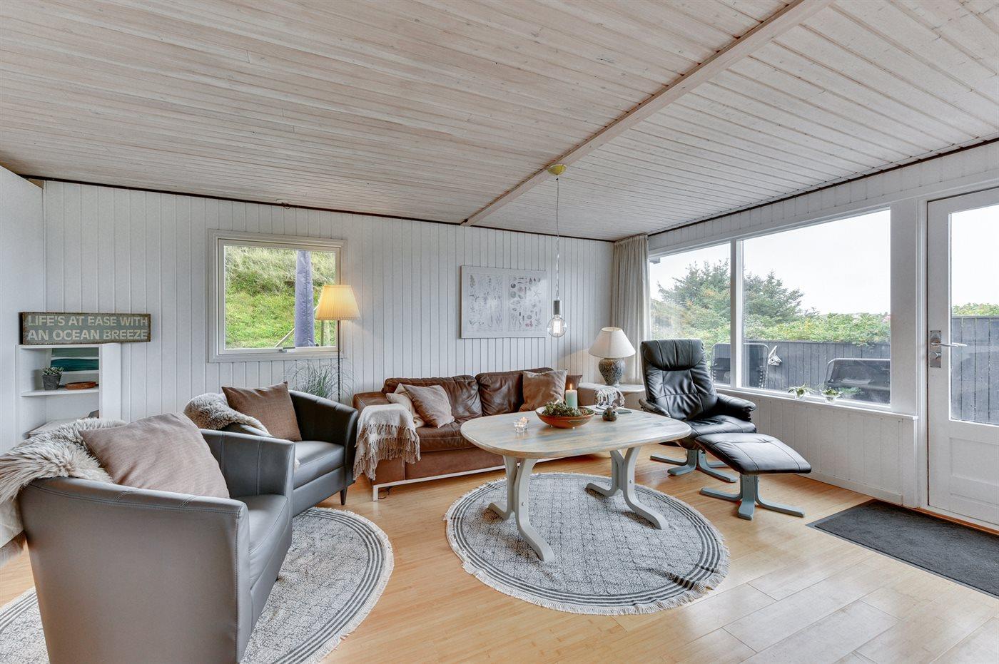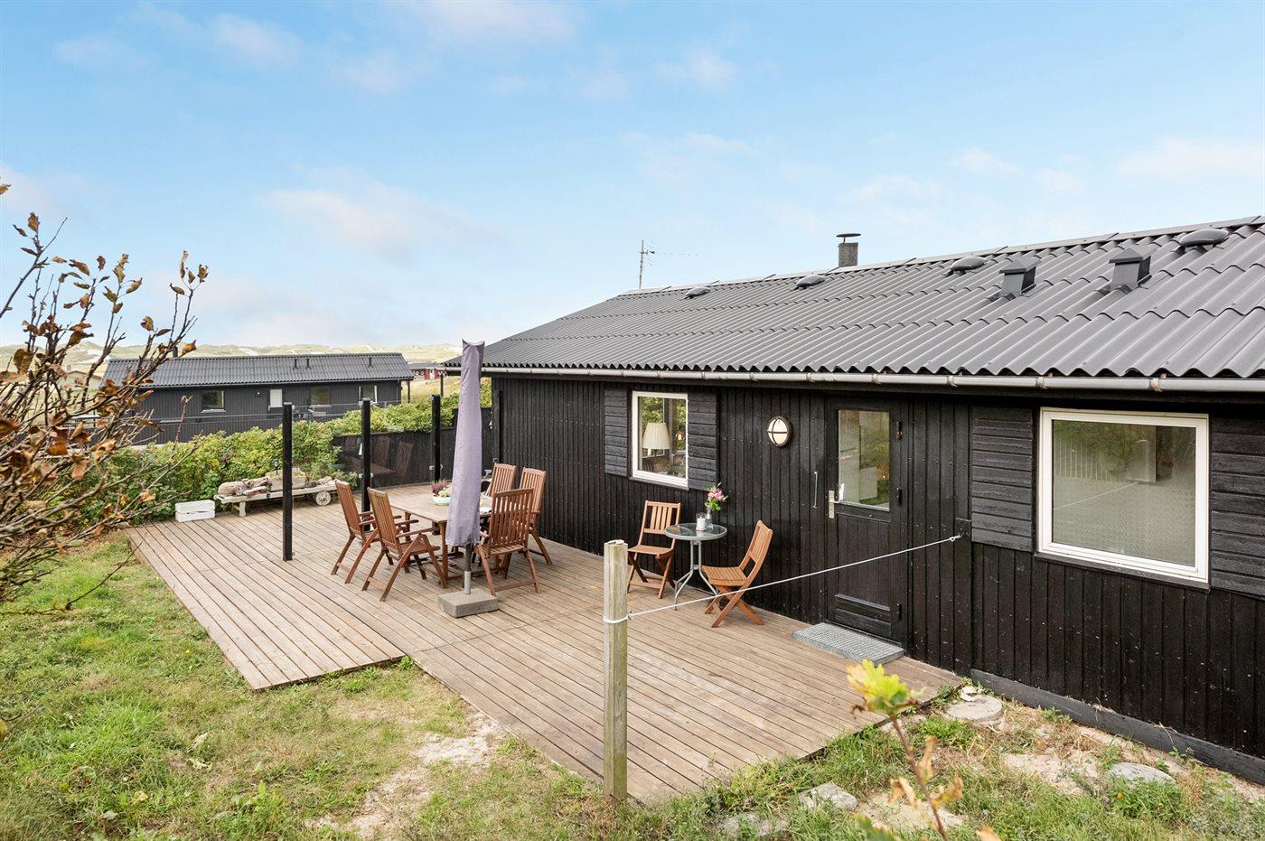 Højtbeliggende og hyggeligt sommerhus med en flot udsigt over klitterne midt mellem hav og fjord. Stedet er oplagt til strandferie, traveture med din firbenede ven og en tur til havnebyen Hvide Sande.