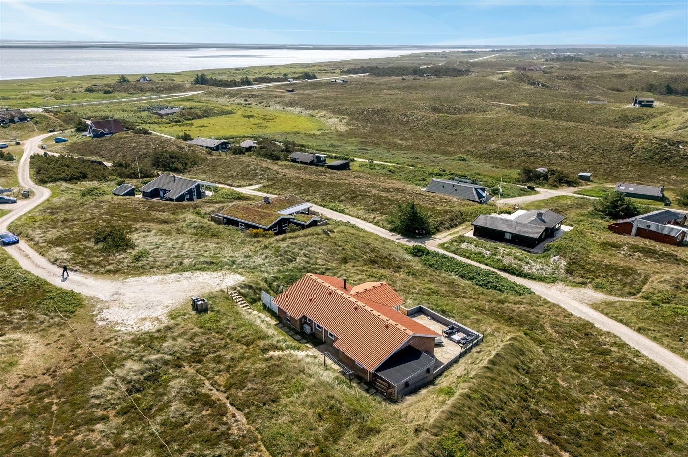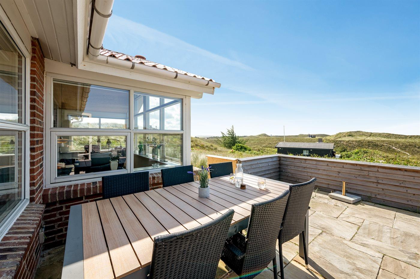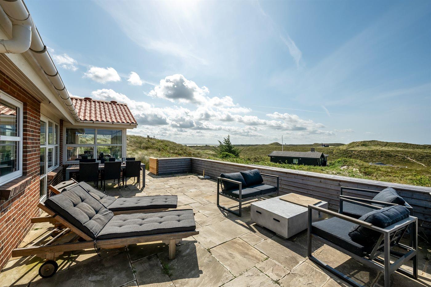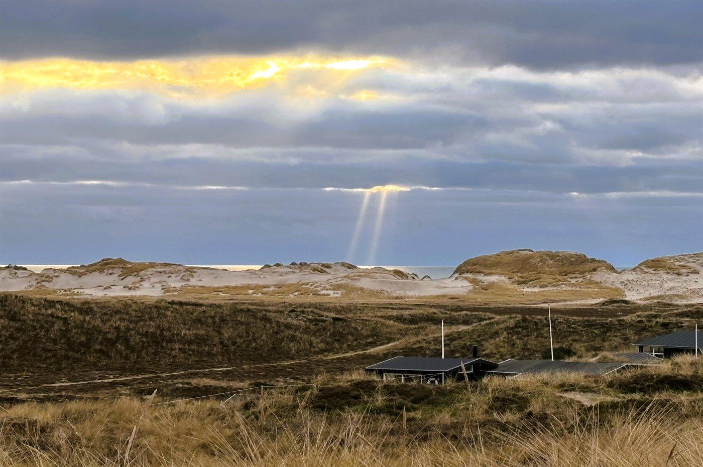 Når I sidder på sommerhusets store lukkede terrasse, har I mod vest udsigt over klitlandskabet, klitterne samt udsigt til Vesterhavet gennem klitternes lavninger. Mod øst har I den smukkeste udsigt over Ringkøbing Fjord, og kigger I mod syd, har I den smukkeste udsigt over det fredede vestjyske klitlandskab – en absolut wauw-oplevelse.