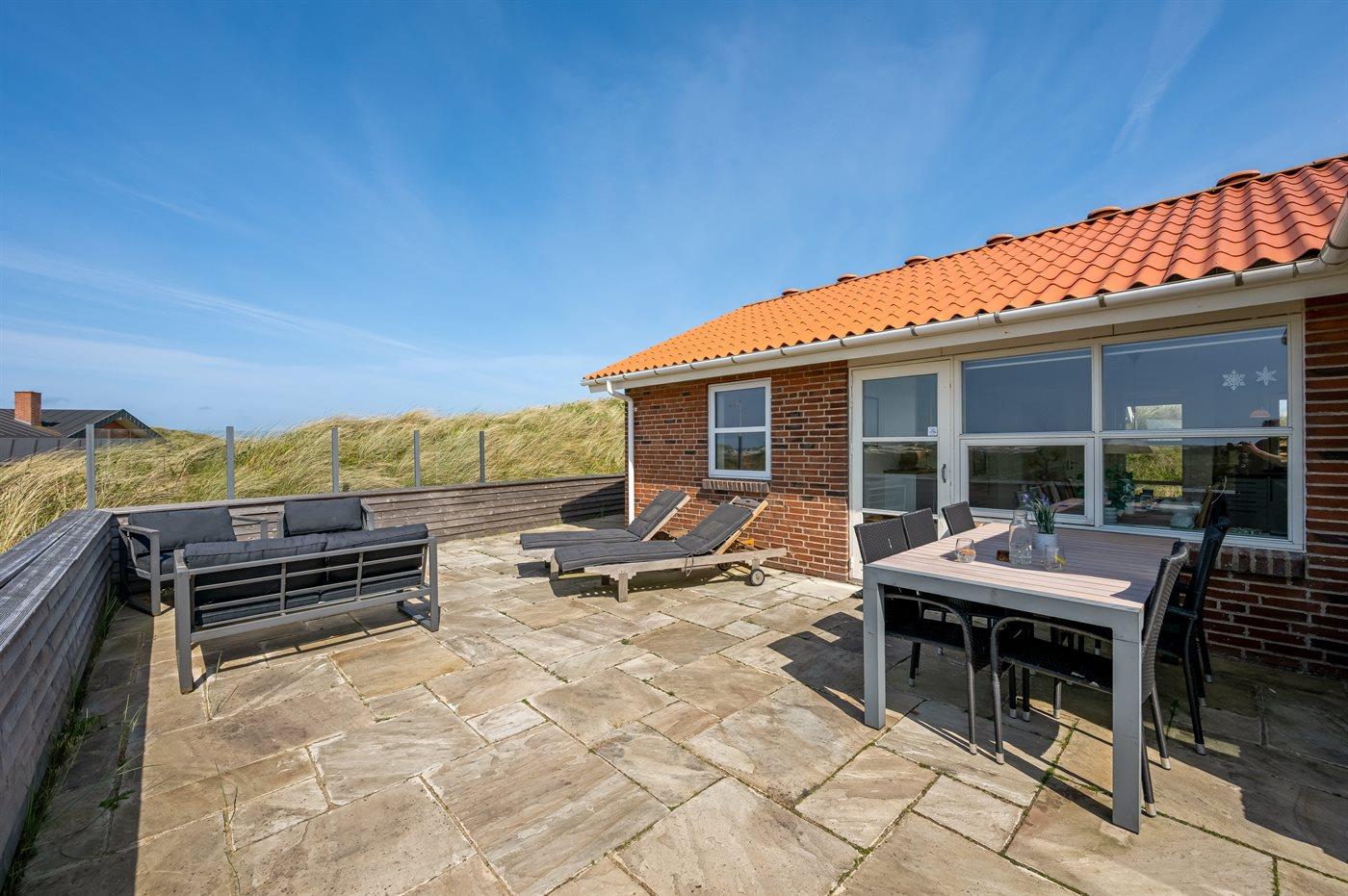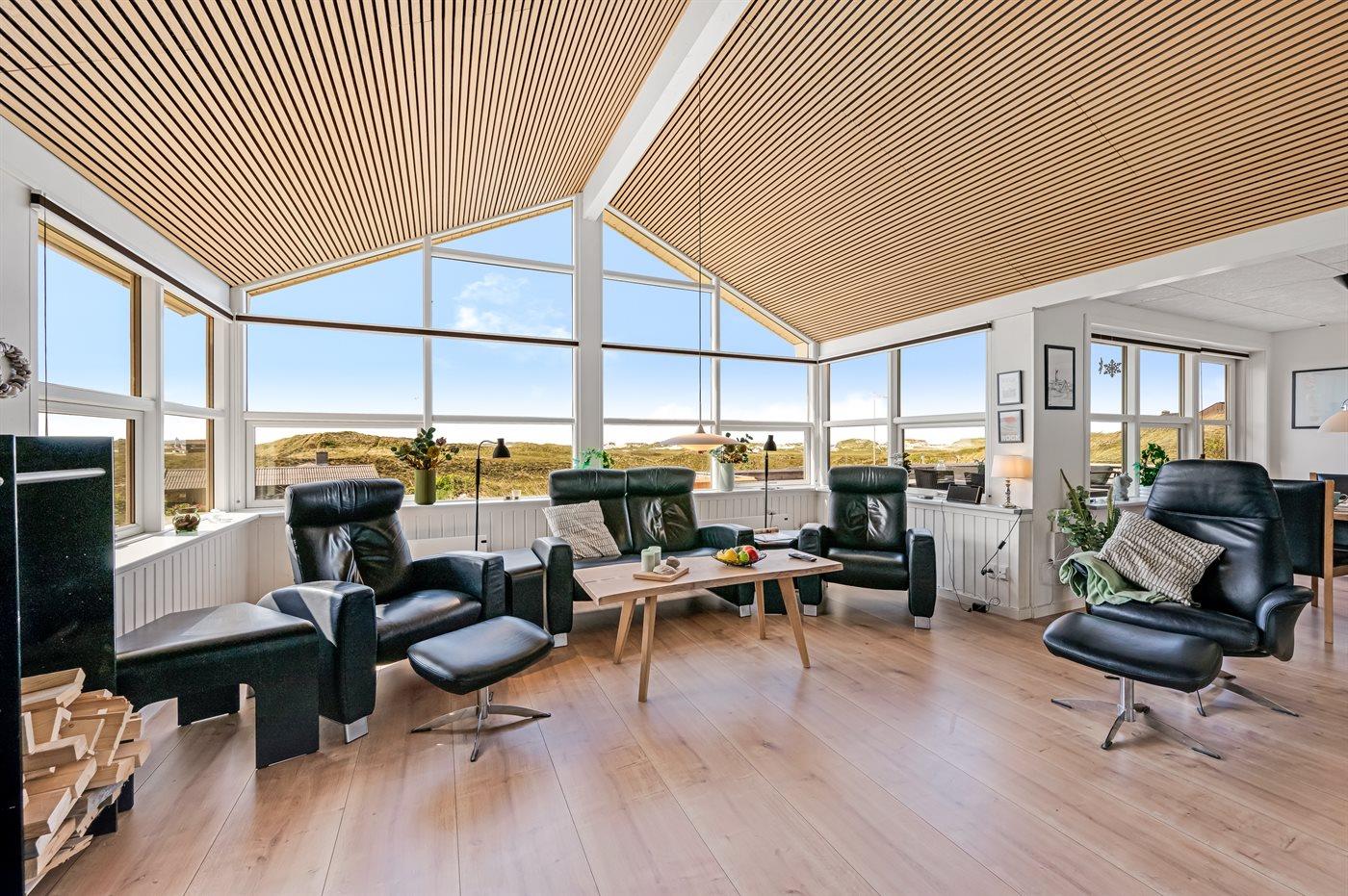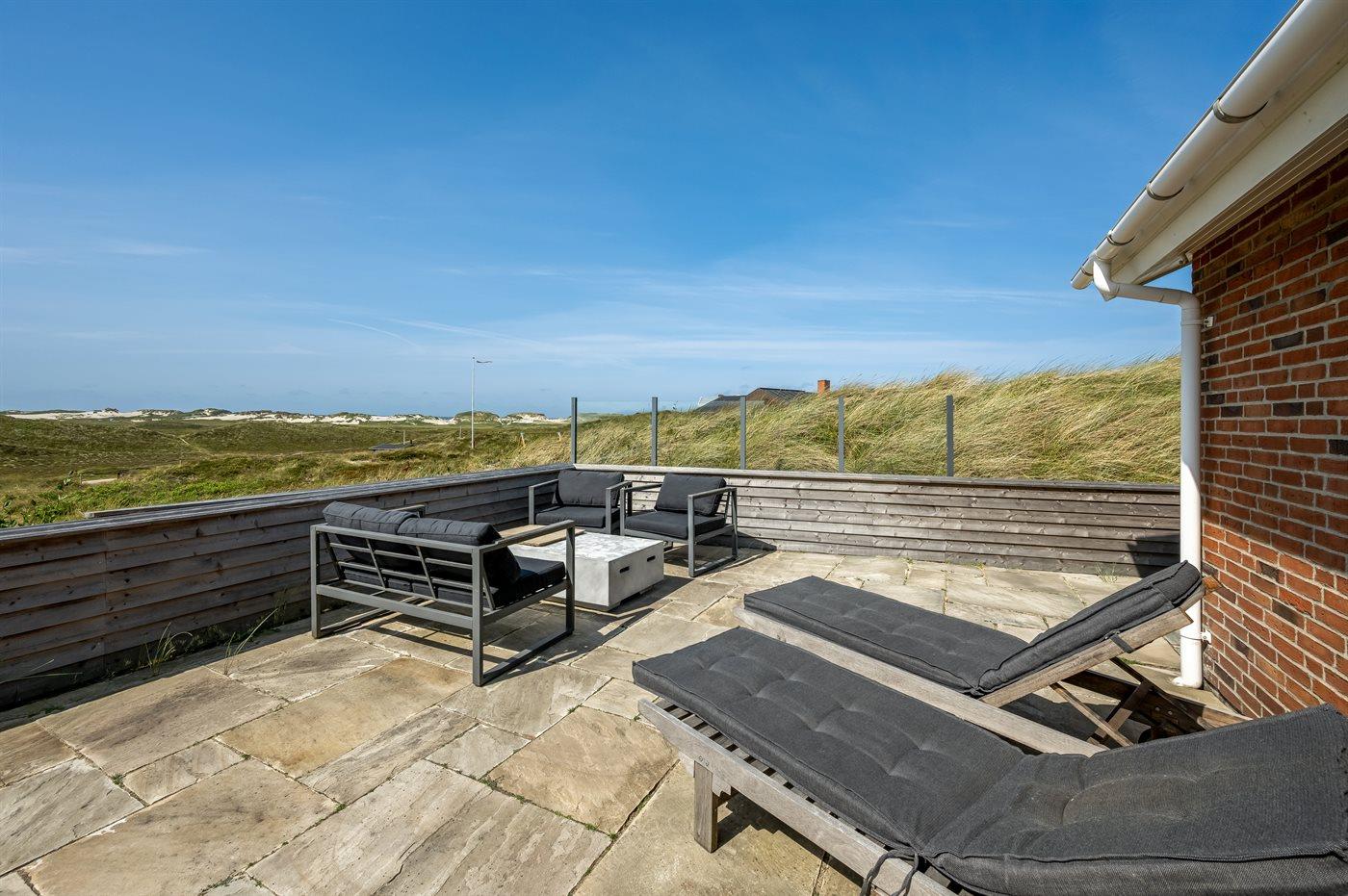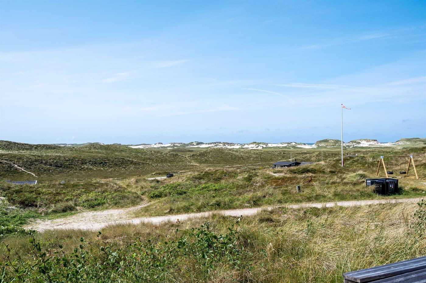 Når I sidder på sommerhusets store lukkede terrasse, har I mod vest udsigt over klitlandskabet, klitterne samt udsigt til Vesterhavet gennem klitternes lavninger. Mod øst har I den smukkeste udsigt over Ringkøbing Fjord, og kigger I mod syd, har I den smukkeste udsigt over det fredede vestjyske klitlandskab – en absolut wauw-oplevelse.