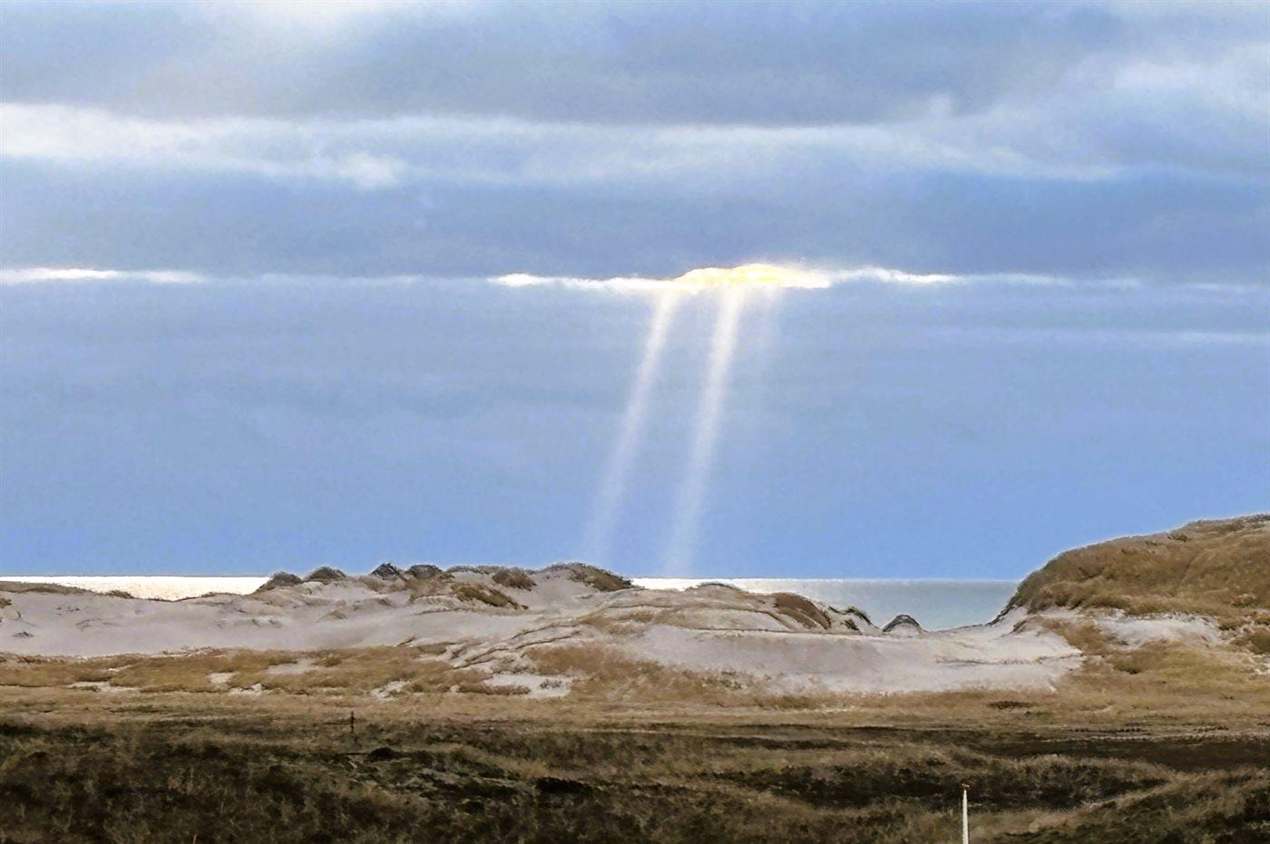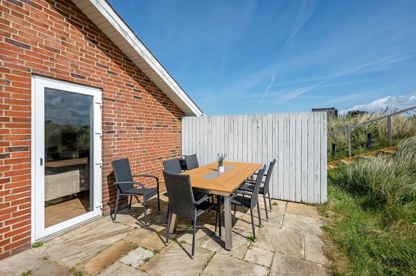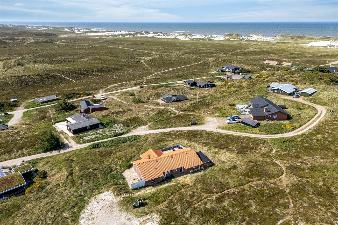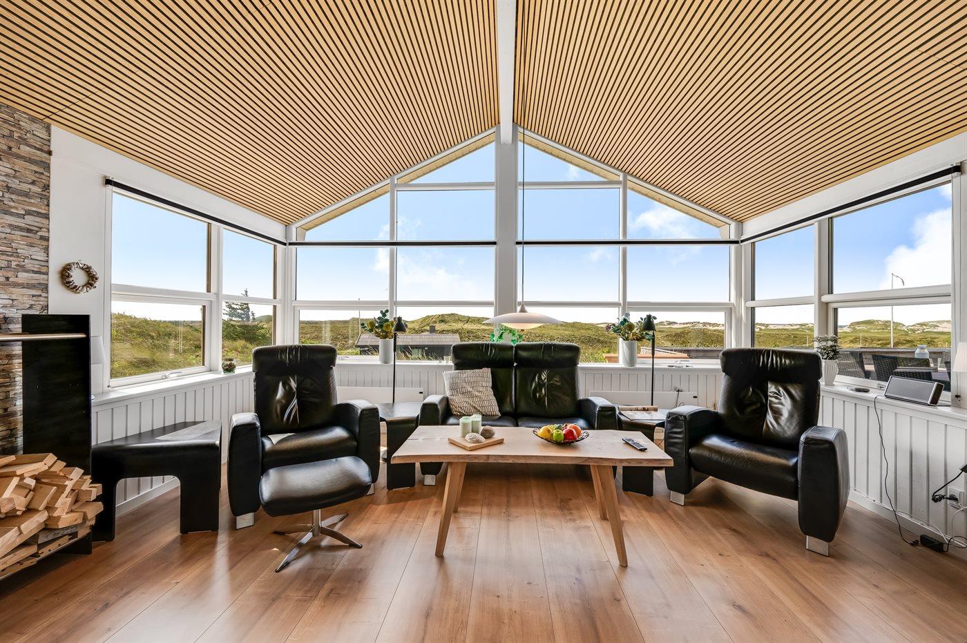 Når I sidder på sommerhusets store lukkede terrasse, har I mod vest udsigt over klitlandskabet, klitterne samt udsigt til Vesterhavet gennem klitternes lavninger. Mod øst har I den smukkeste udsigt over Ringkøbing Fjord, og kigger I mod syd, har I den smukkeste udsigt over det fredede vestjyske klitlandskab – en absolut wauw-oplevelse.