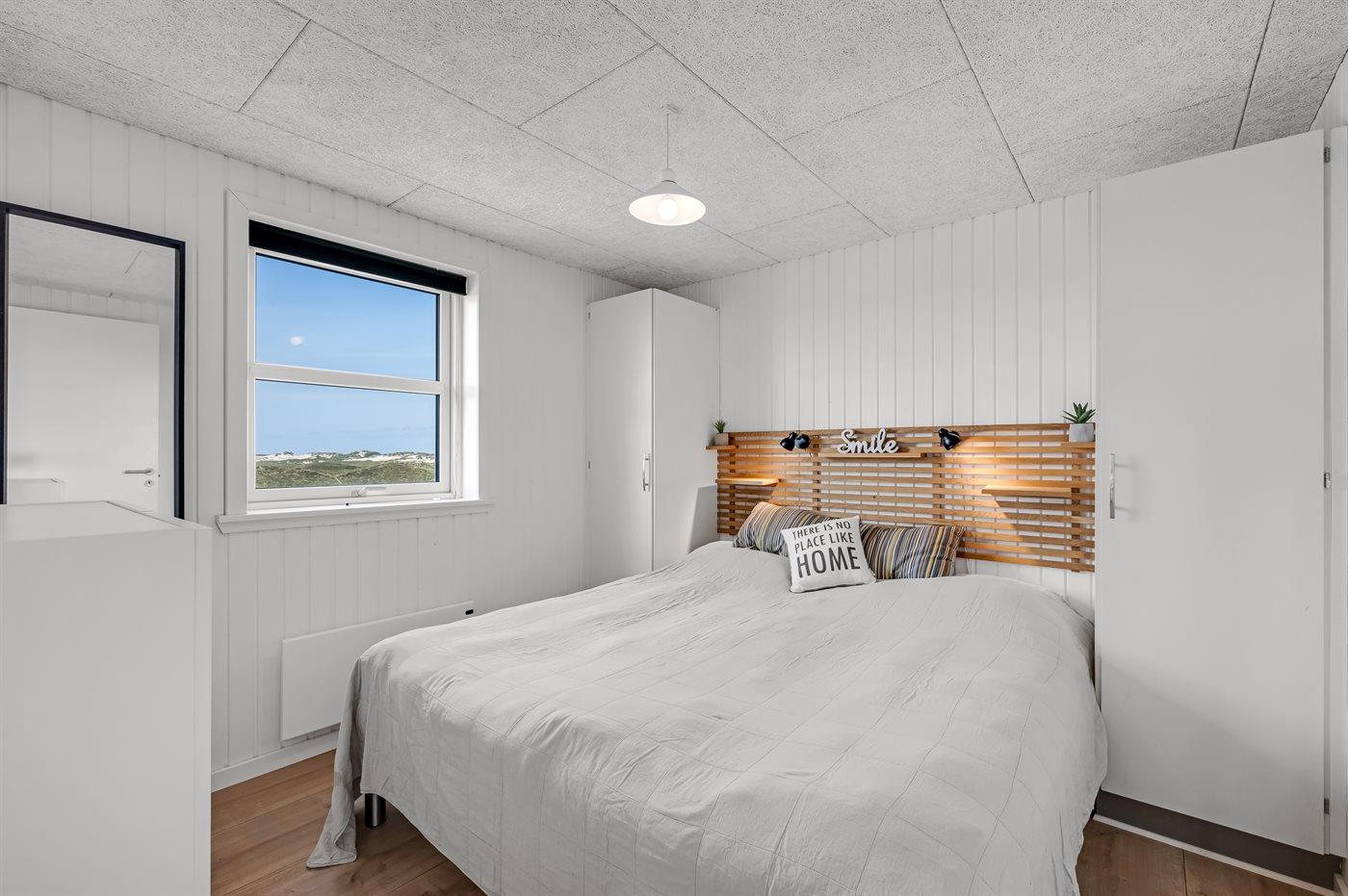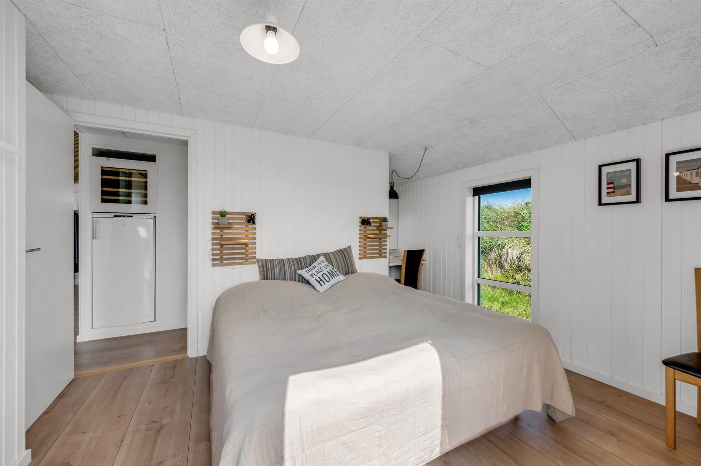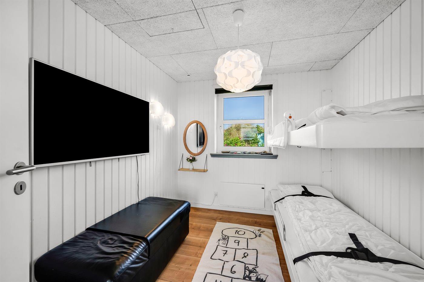 Sommerhuset har fire hyggeligt indrettede soveværelser, hvoraf de tre er med dobbeltsenge. Det fjerde soveværelse er indrettet med væghængte køjesenge, som giver ekstra gulvplads til leg og kreativitet for de yngste – bemærk at disse køjesenge kun er egnede til børn op til 11 år.