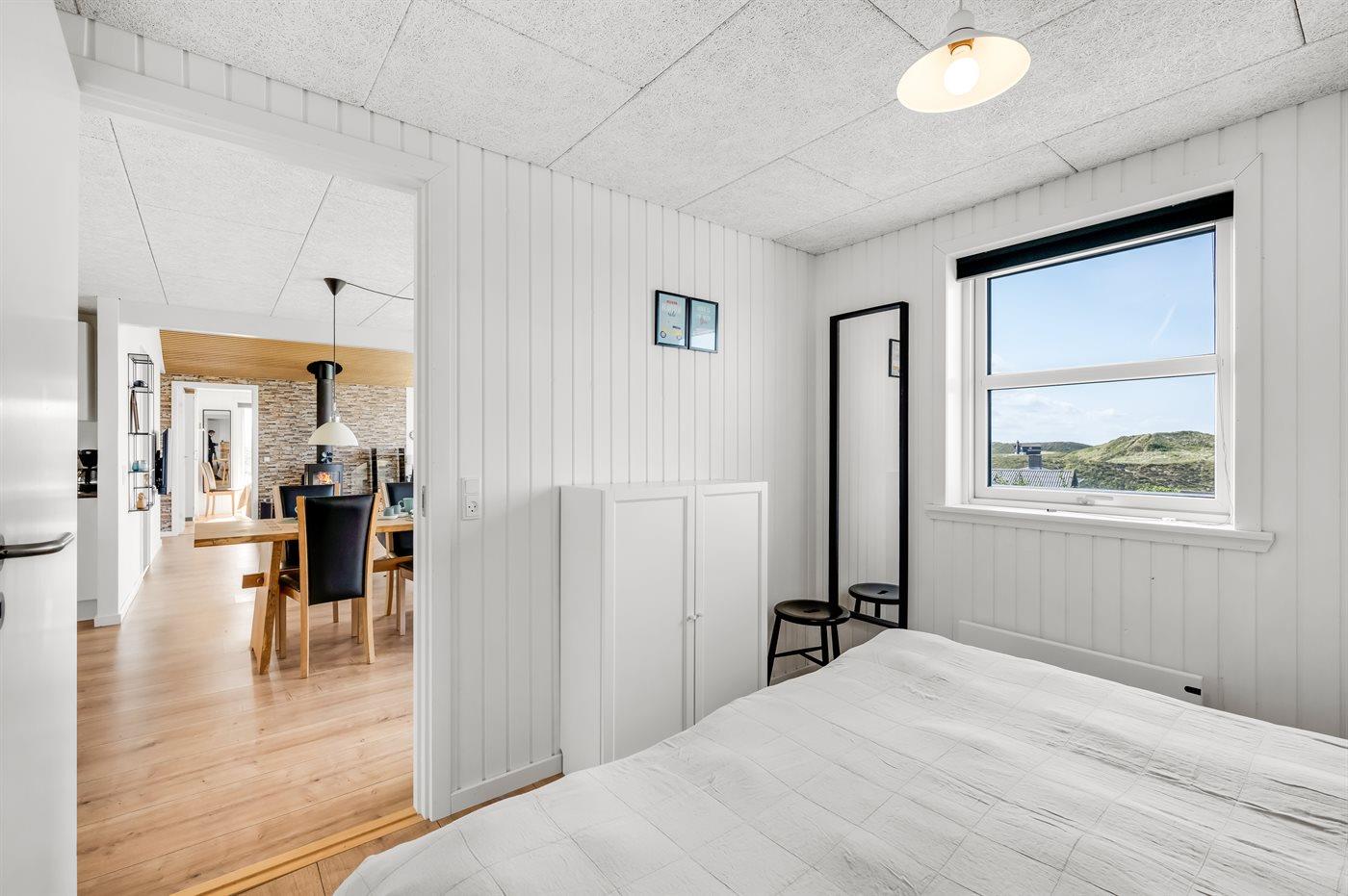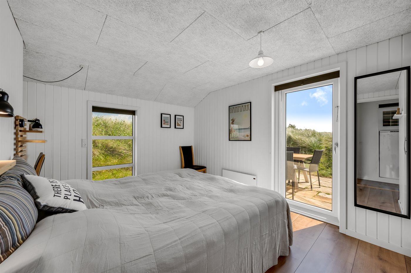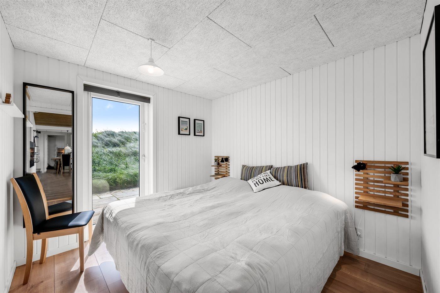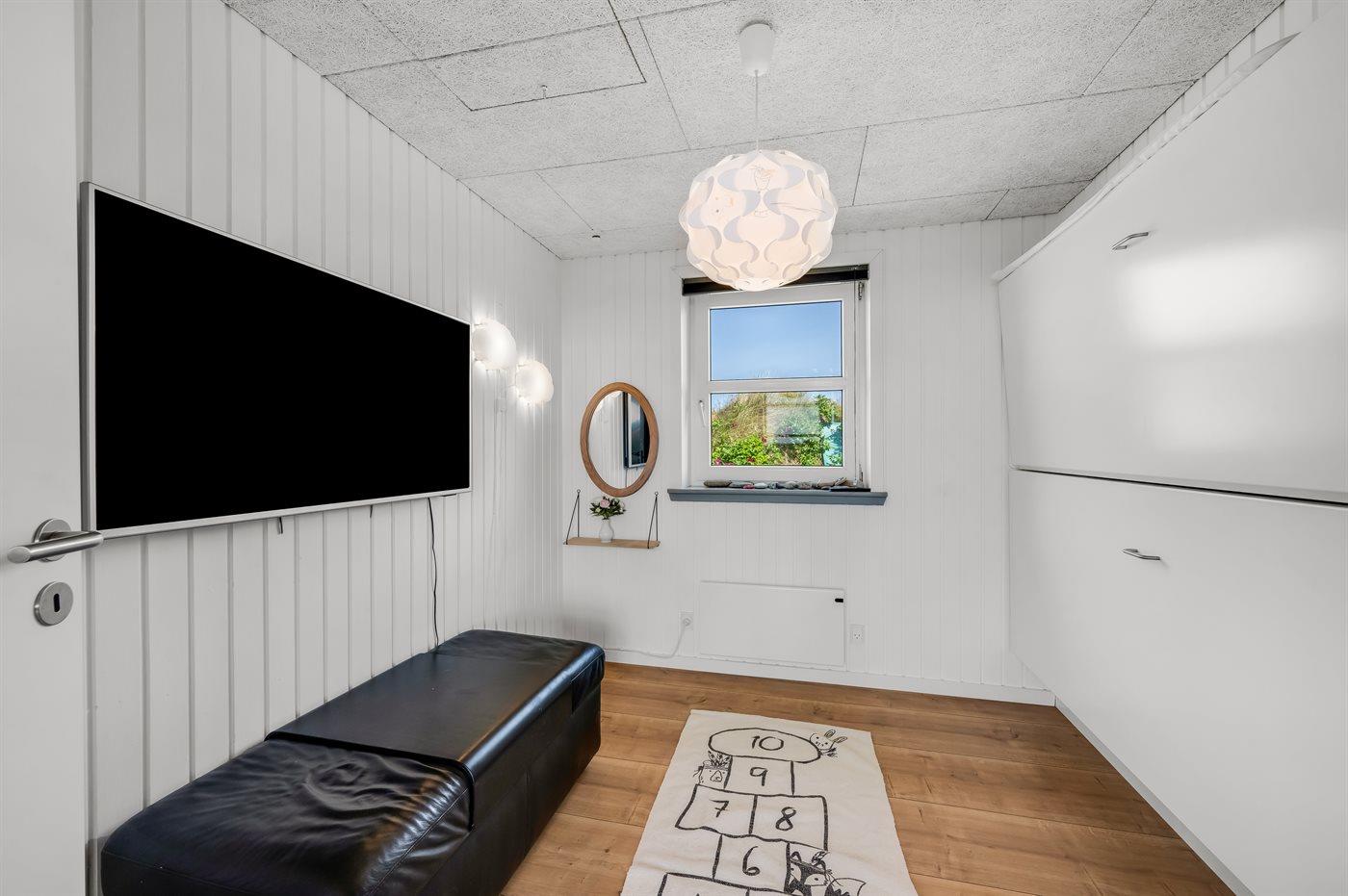 Sommerhuset har fire hyggeligt indrettede soveværelser, hvoraf de tre er med dobbeltsenge. Det fjerde soveværelse er indrettet med væghængte køjesenge, som giver ekstra gulvplads til leg og kreativitet for de yngste – bemærk at disse køjesenge kun er egnede til børn op til 11 år.
