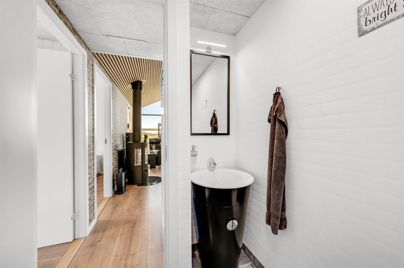 Sommerhusets to badeværelser befinder sig i hver sin ende af sommerhuset. I det største af badeværelserne kan I koble helt af fra hverdagen ved at sætte jer til rette i det varme vand i badekarret med en god bog…og måske et koldt glas vin??