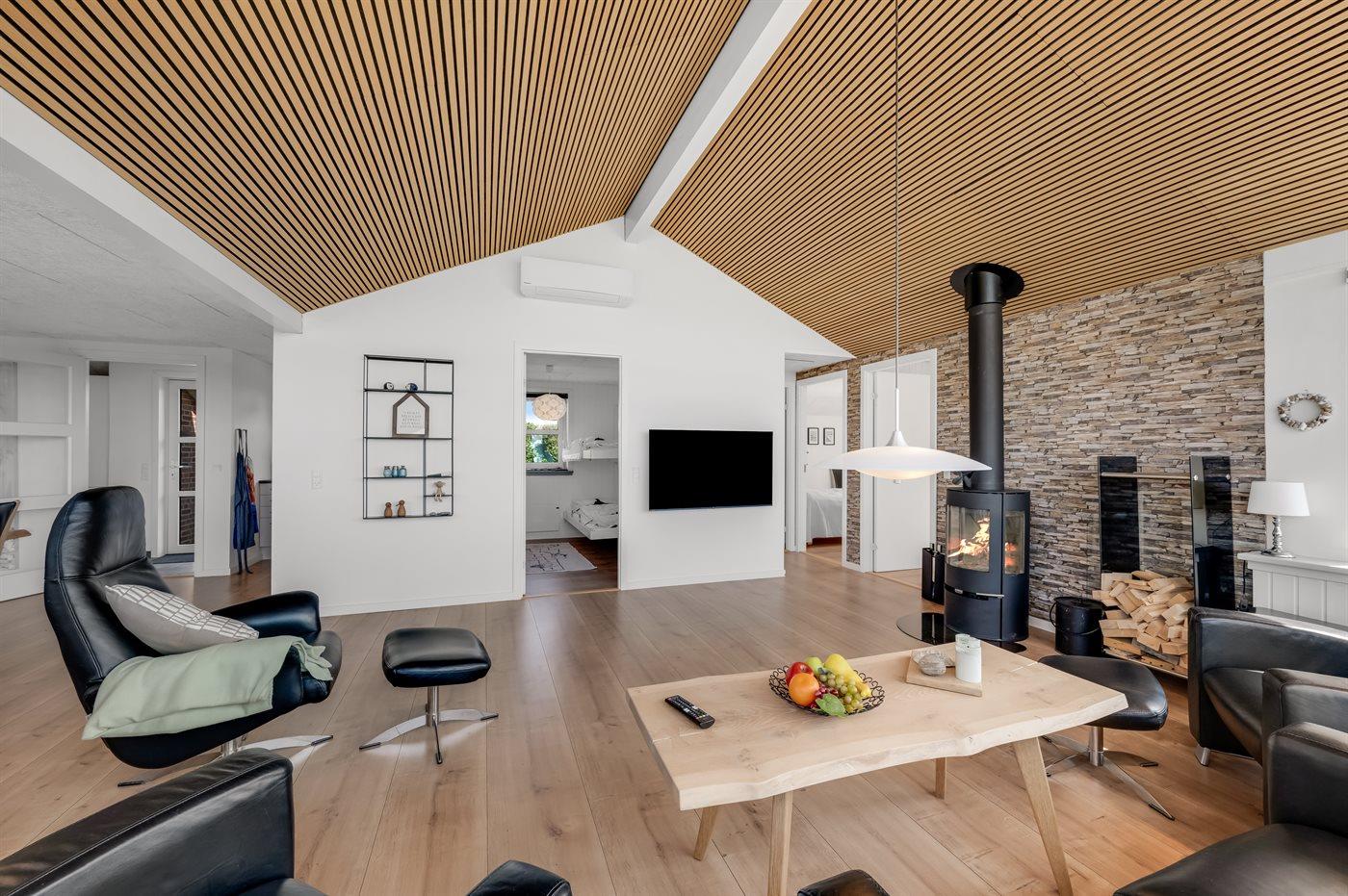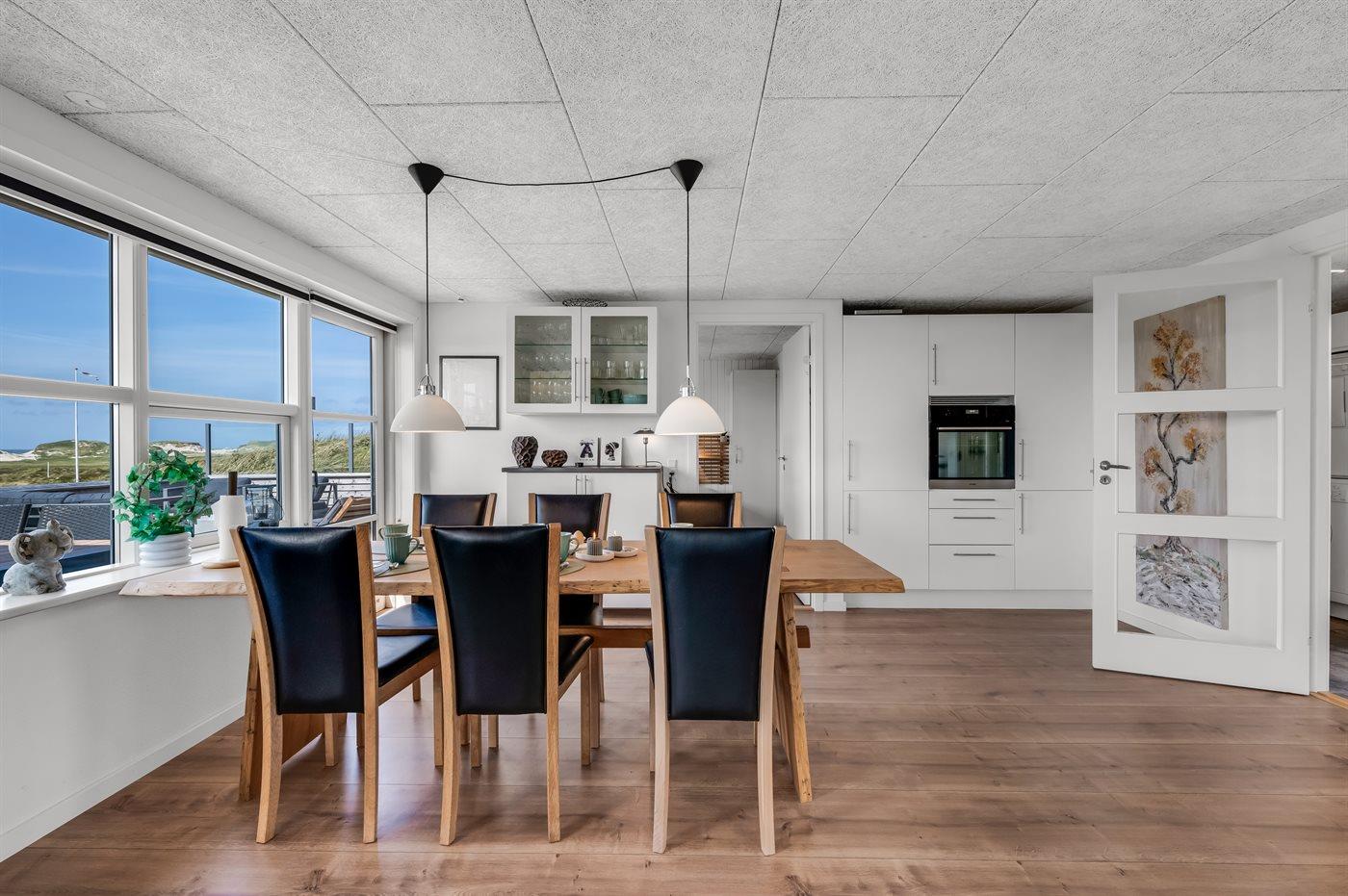 Trækker I indenfor i det rummelige køkken-alrum, der er indrettet i dansk design og med sans for detaljen, kan I også nyde den fantastiske udsigt gennem de store panoramavinduer. I sommerhusets velindrettede køkken er der god plads, så I kan hjælpe hinanden med madlavningen, mens I hygger jer og taler om løst og fast. Skal der rigtig slappes af, kan I slænge jer i sofaen og se en god film med brændeovnens knitren i baggrunden. Men køkken-alrummets absolut bedste plads er ved det store spisebord, hvor man kan falde i staver pga. den smukke udsigt.