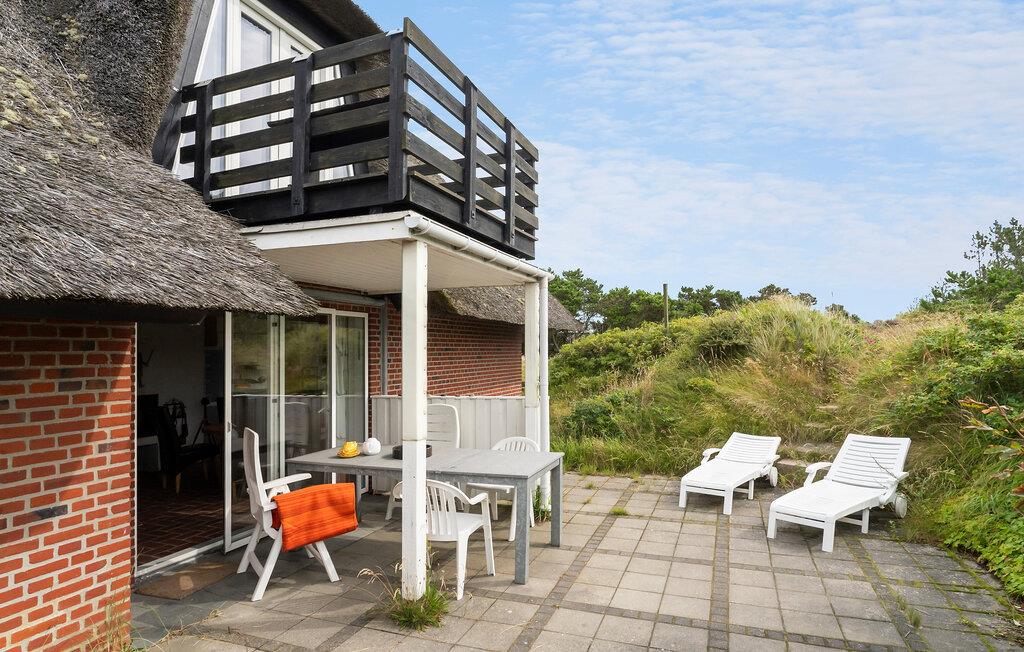 Charmerende stråtækt feriehus med panoramaudsigt over klitter og Ringkøbing Fjord i Hvide Sande.