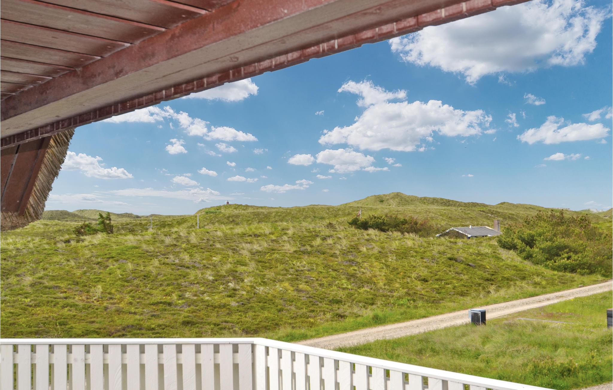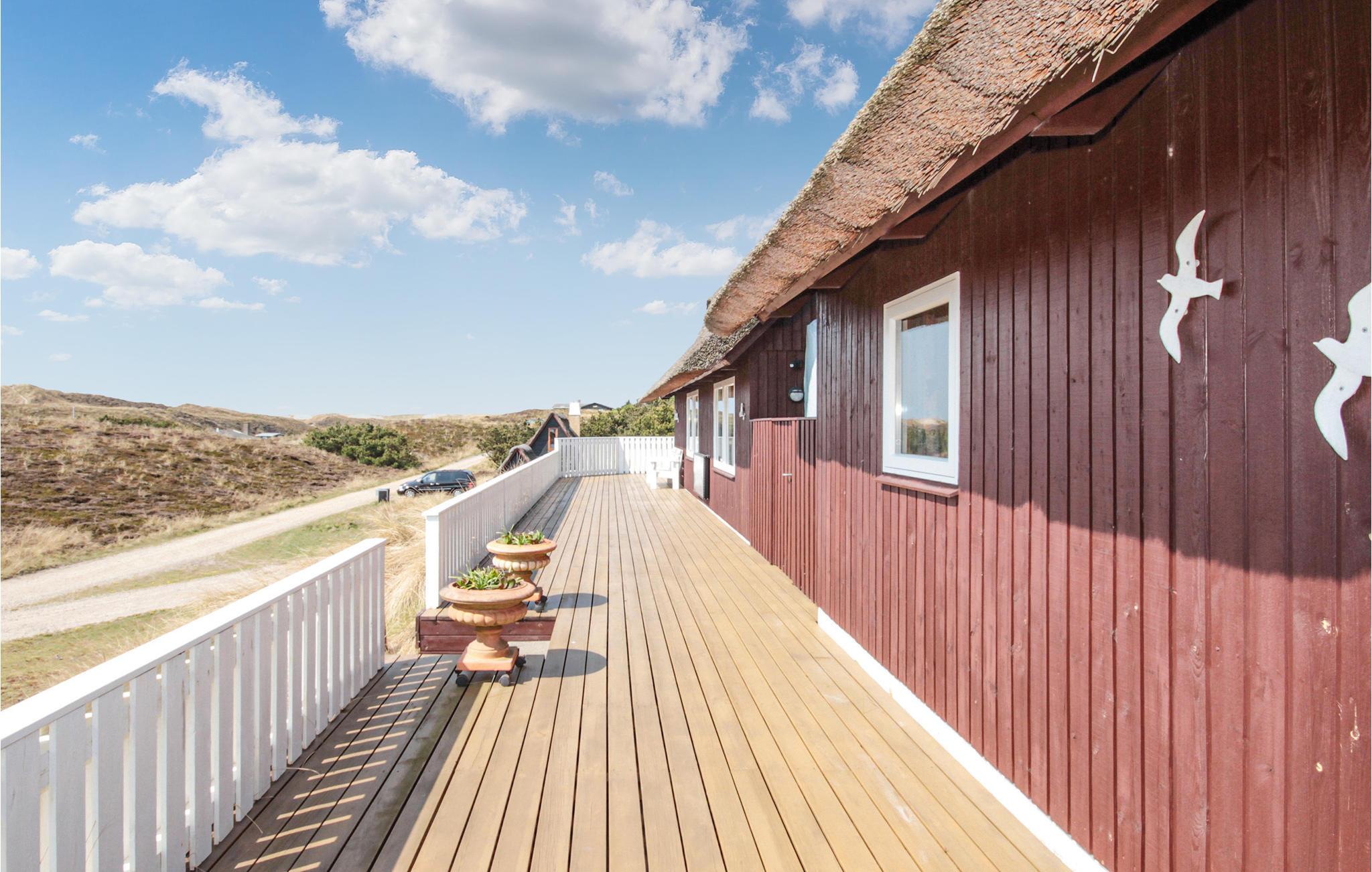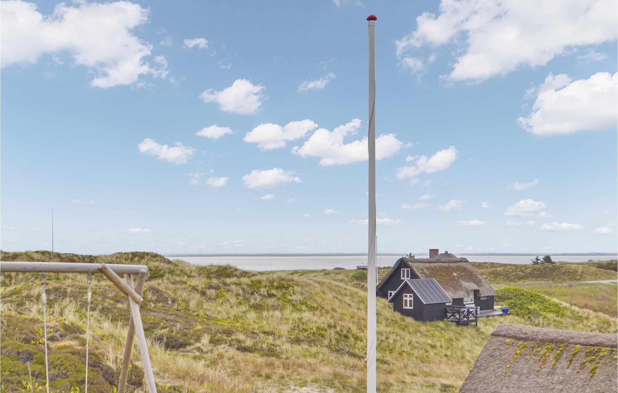 Nyd den helt fantastiske udsigt over land og fjord, fra grunden dette hyggelige stråtækte sommerhus ligger på i Skodbjerge. Området er et af de meget populære ved vestkysten nær det brusende hav, den skønne strand og de mange kystbyer med havne, restauranter, cafeer og meget andet. Her kan I dyrke mange former for fritidsaktiviteter: cykle, gå, løbe, wind- og kitsurfe - og bygge store slotte i det våde sand, samt naturligvis springe i bølgerne lige som I har lyst.
