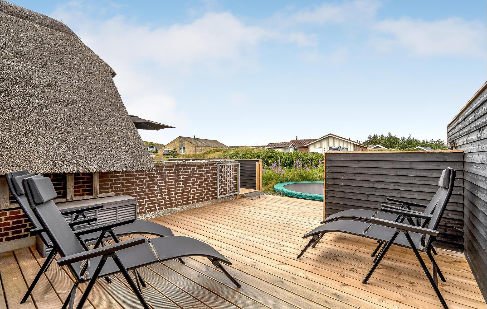 Hyggeligt stråtækt sommerhus beliggende på naturgrund i Skodbjerge på landtangen mellem Ringkøbing Fjord og Vesterhavet. Dette område er meget populært hos alle der vil surfe (eller kitesurfe), dyrke lystfiskeri eller bare nyde den brede strand ud til det brusende Vesterhav, som forandrer farve med lysets skiften på himlen. Tag gerne cyklerne med, eller lej på stedet, da området er gennemskåret af cykelstier som er dejlige til en frisk tur til stranden eller til nærmeste iskiosk.