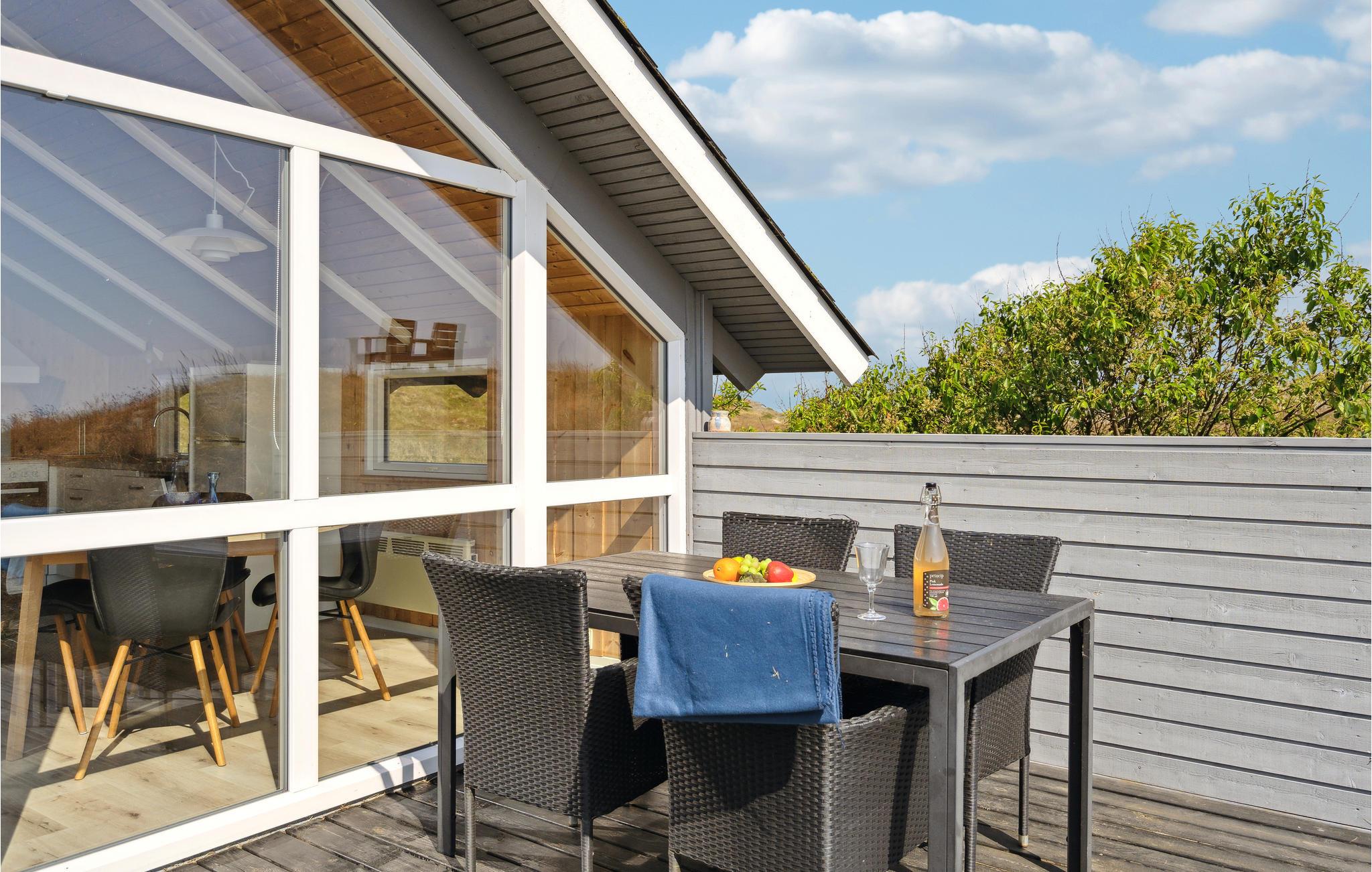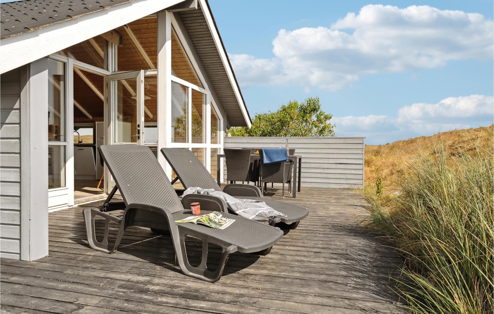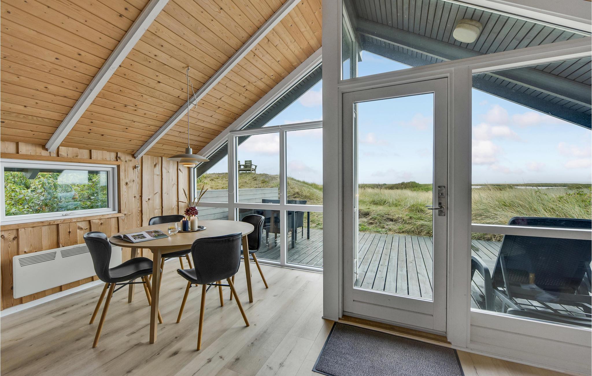 Med en helt unik beliggenhed på en stor klitgrund og kun ét nabohus, har I her det bedste udgangspunkt for en afslappende ferie. Fra stuen og den sydøstvendte terrasse er der en helt fantastisk panoramaudsigt over Ringkøbing Fjord, som til alle årstider byder på et rigt og spændende dyreliv. Fra den vestvendte terrasse kan I nyde eftermiddagssolen og udsigten til de store klitter. Her er naturen i højsædet og byder hver dag på nye naturoplevelser.