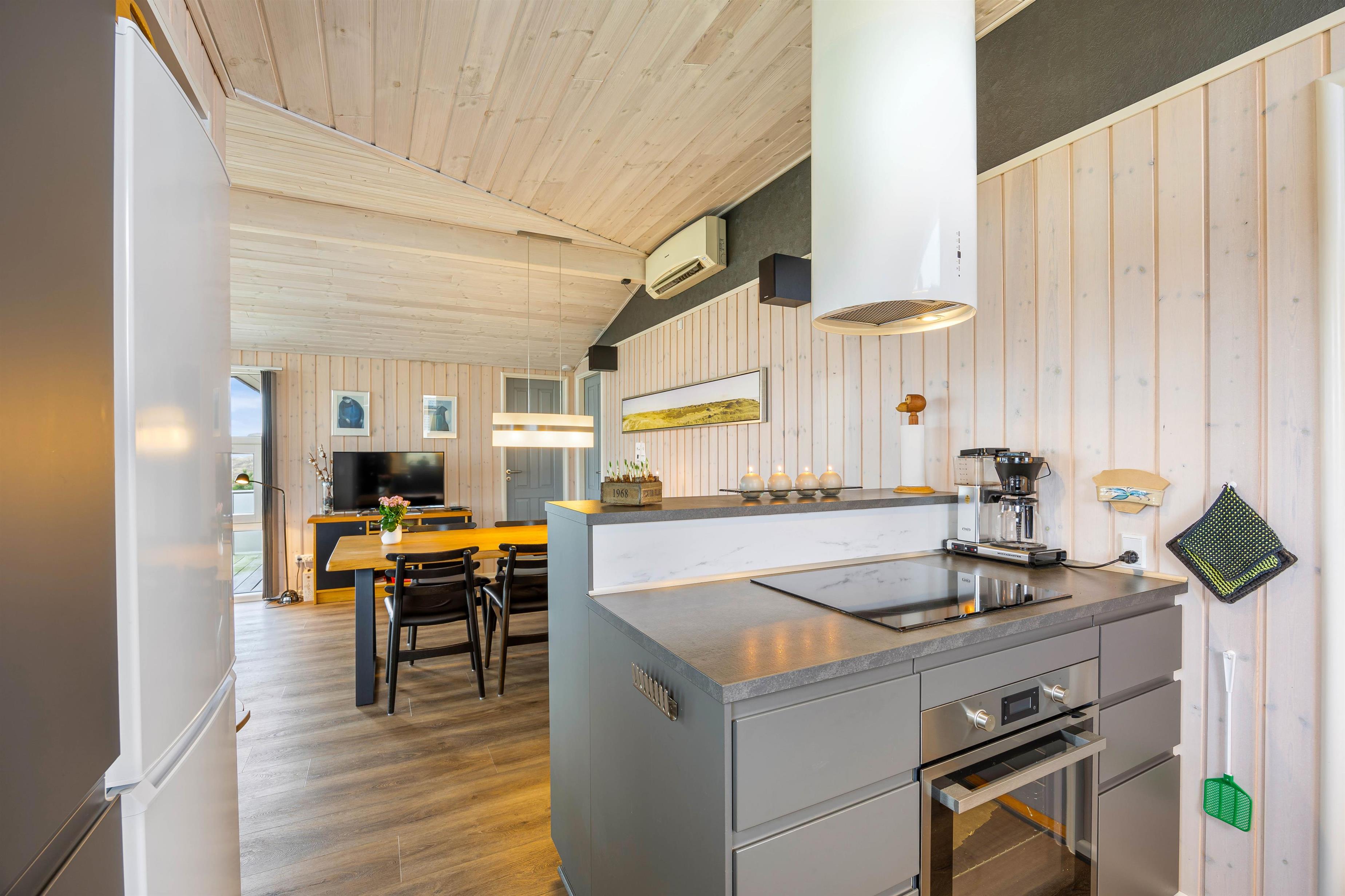 Køkkenet med opvaskemaskine, mikrobølgeovn og induktionskomfur ligger i åben forbindelse med stuen.