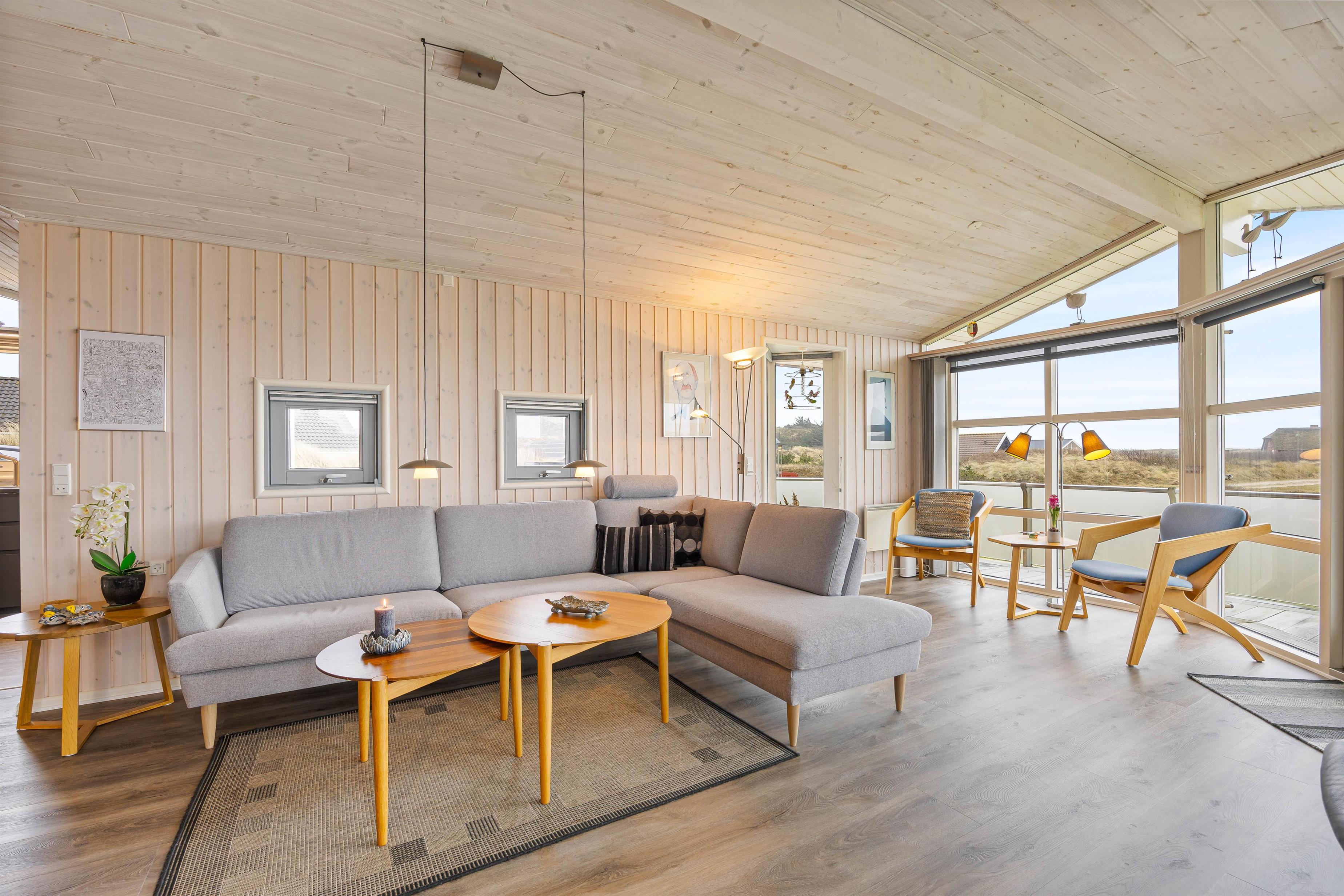 Stor stue med brændeovn og udsigt til klitlandskabet