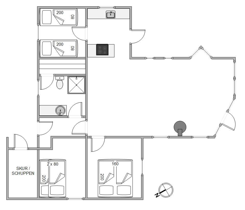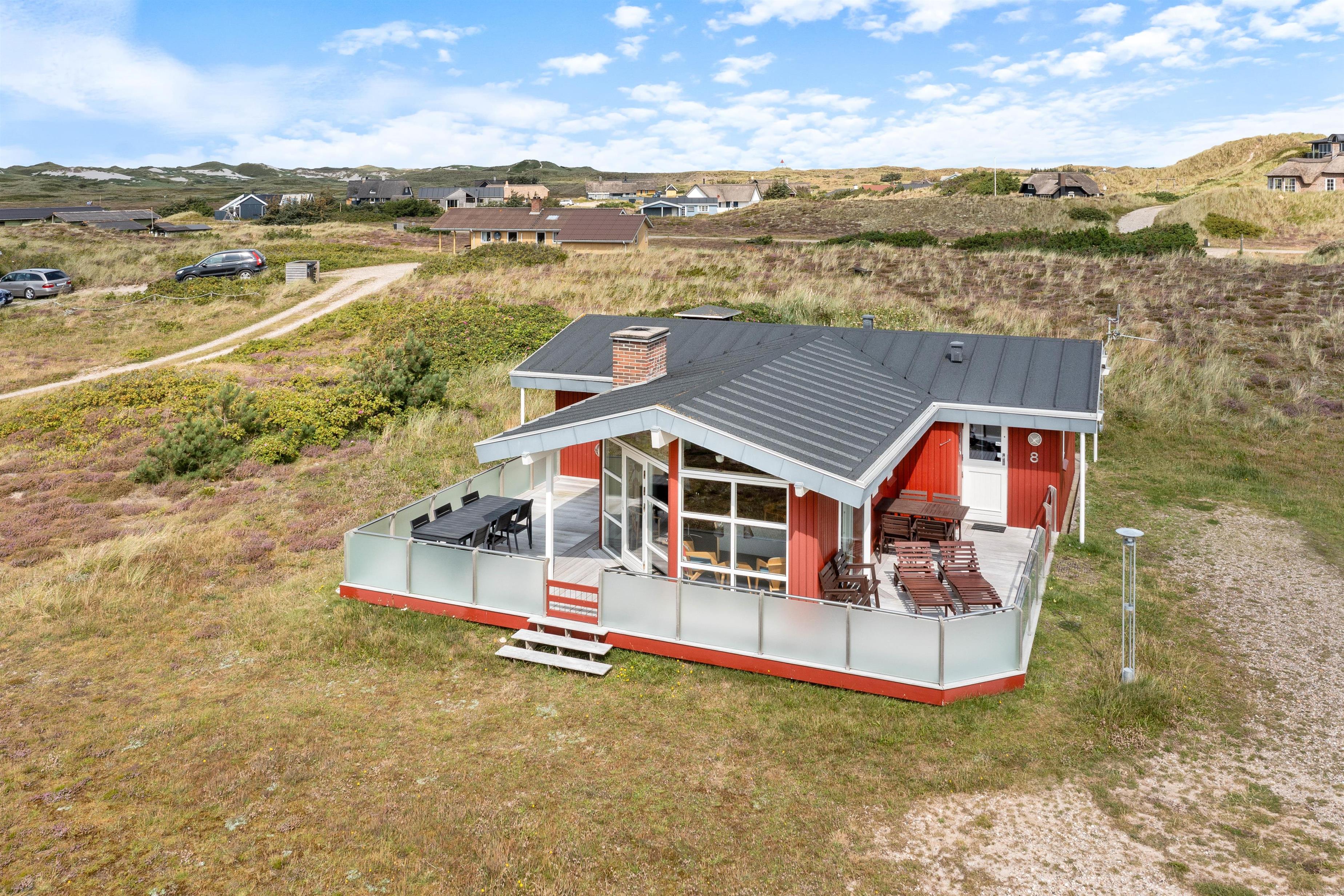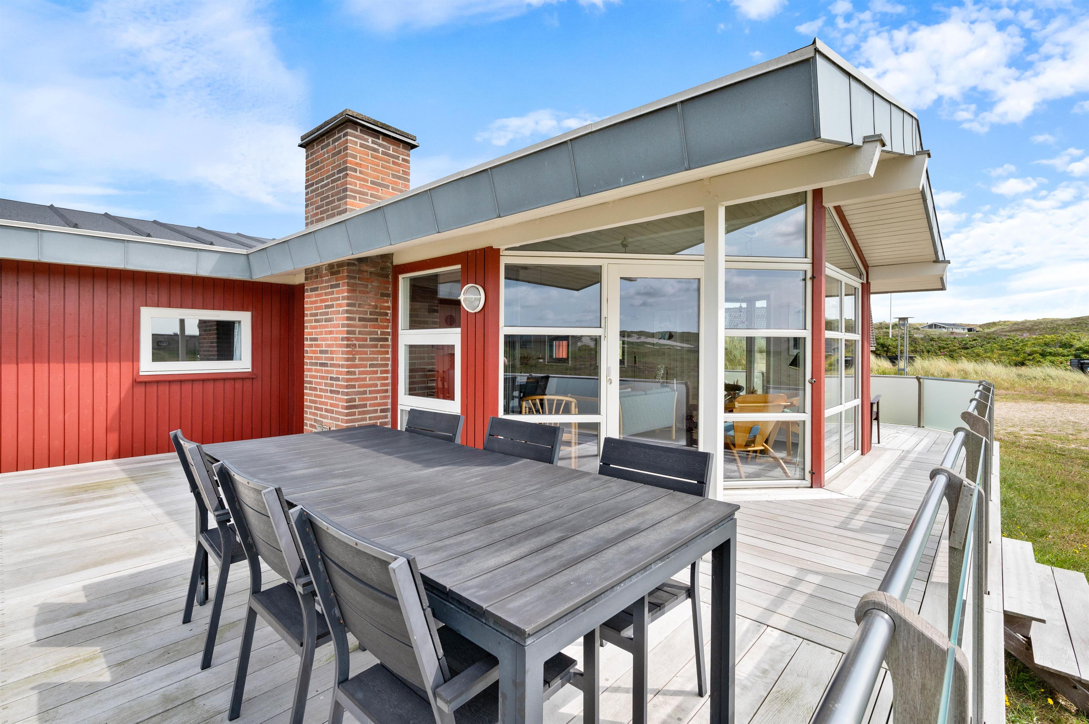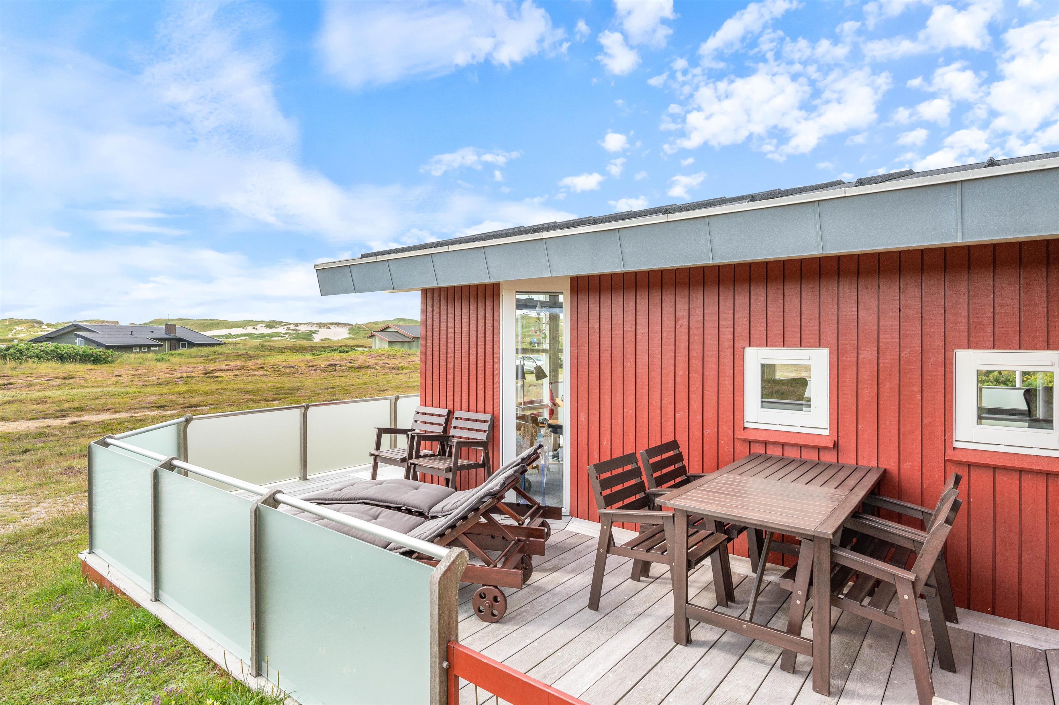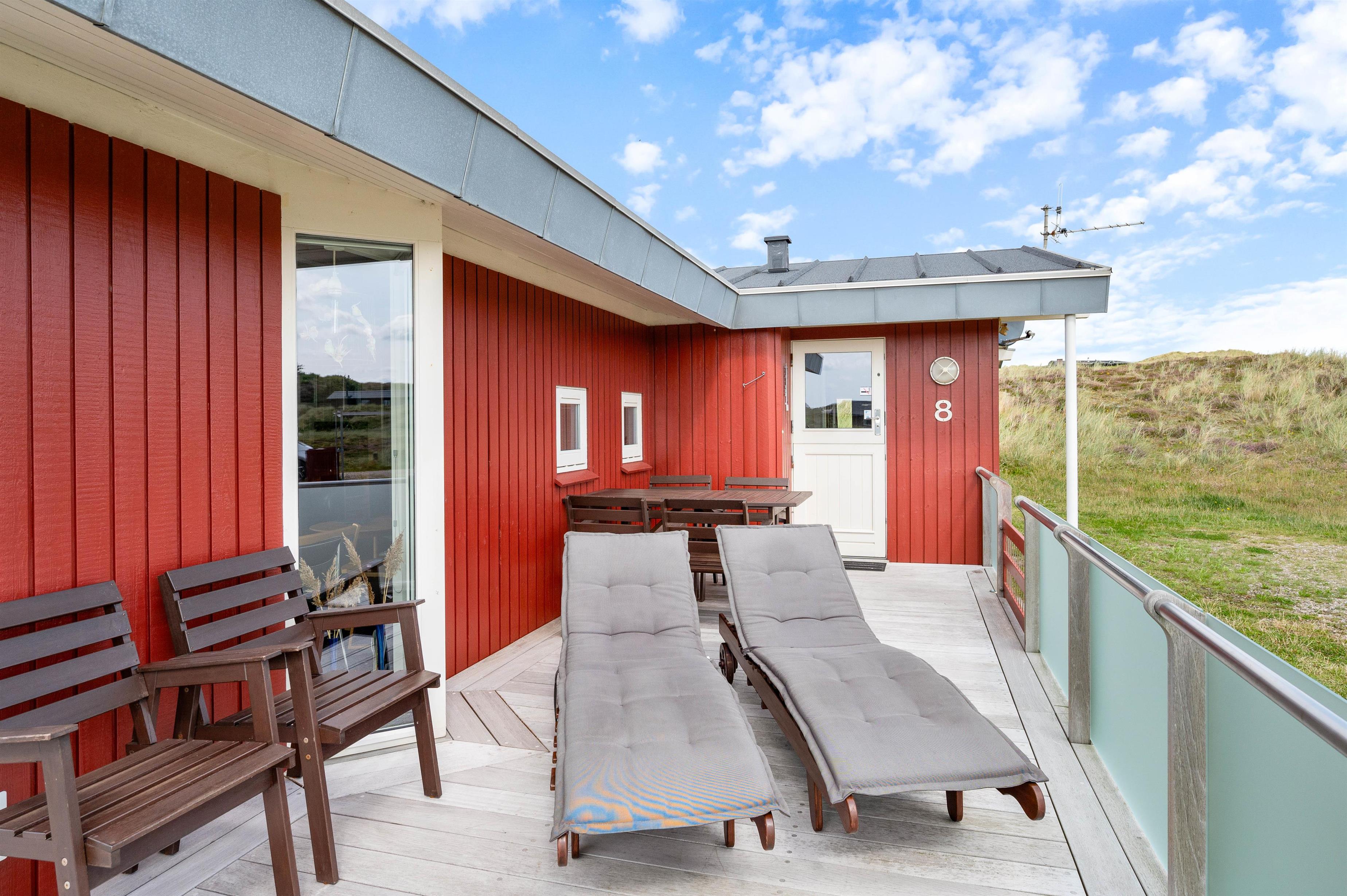 På Sandvej 8 er der både vest- og østvendt terrasse. Fra stuen er der direkte udgang til den afskærmede, vestvendte terrasse. Mens solen står op, kan I sidde på den østlige terrasse, som også er afskærmet, og drikke en kop kaffe. Fra den vestvendte terrasse kan I nyde et lækkert grillmåltid i aftensolen med udsigten til klitterne.