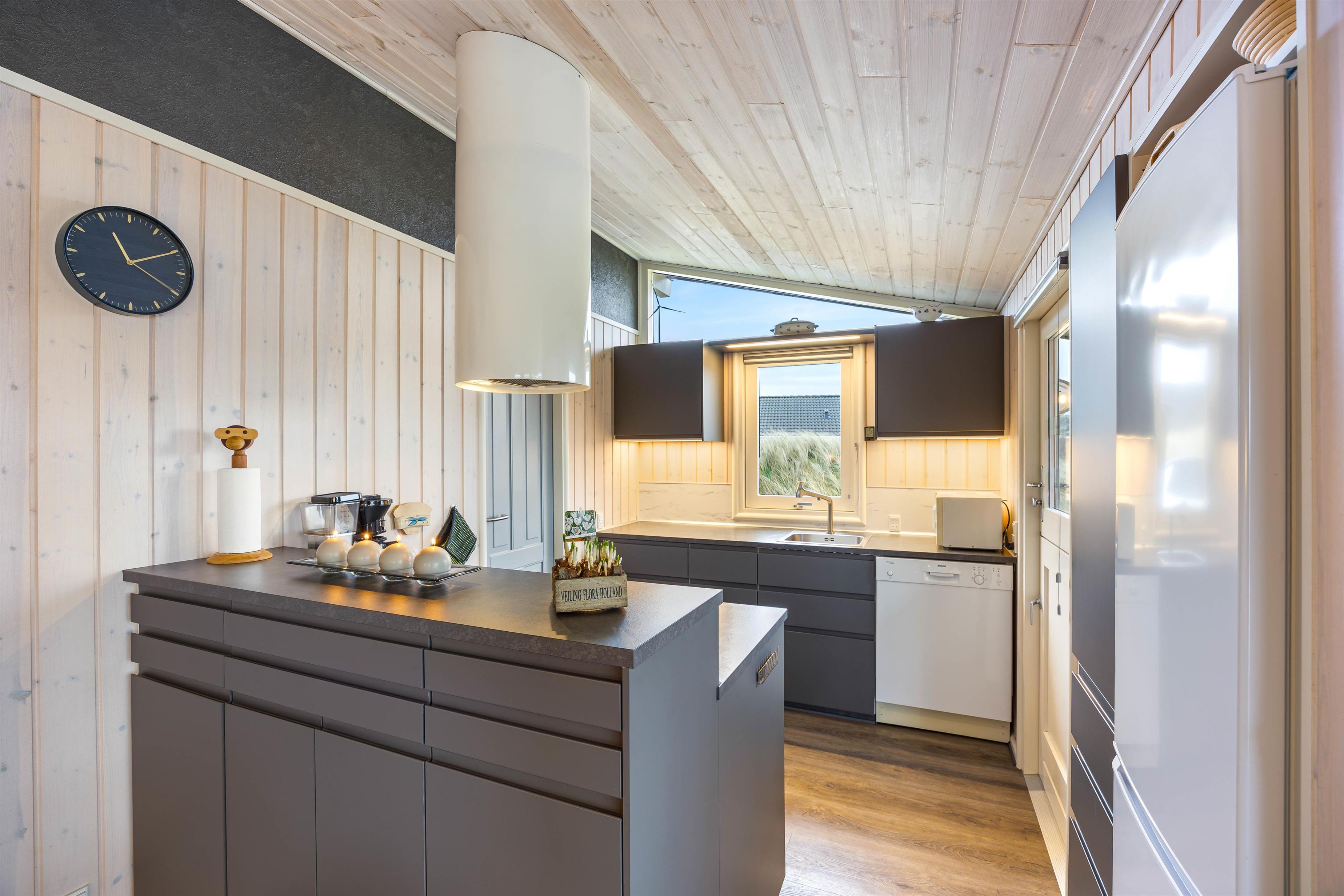 I det 86 m2 store feriehus, som er blevet renoveret i 2021, vil I hurtigt føle jer hjemme i den dejlige stue. Her kan I slappe af på sofaen efter en god dag på stranden, imens I varmer jer på varmen fra brændeovnen. I kan med fordel også bruge den energibesparende varmepumpe til at holde temperaturen i sommerhuset behagelig. Gennem det store vindue i stuen har I en skøn udsigt til klitlandskabet.