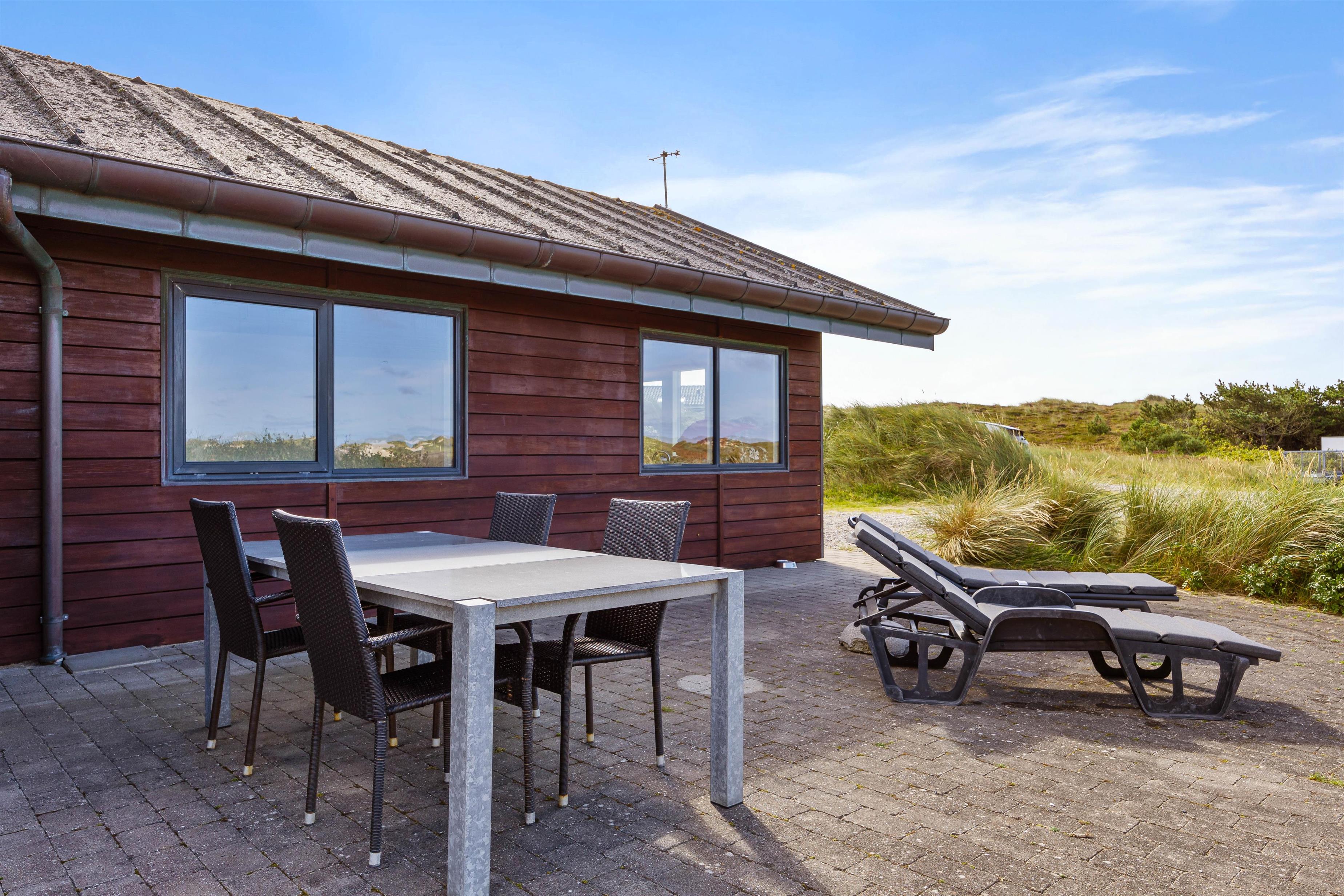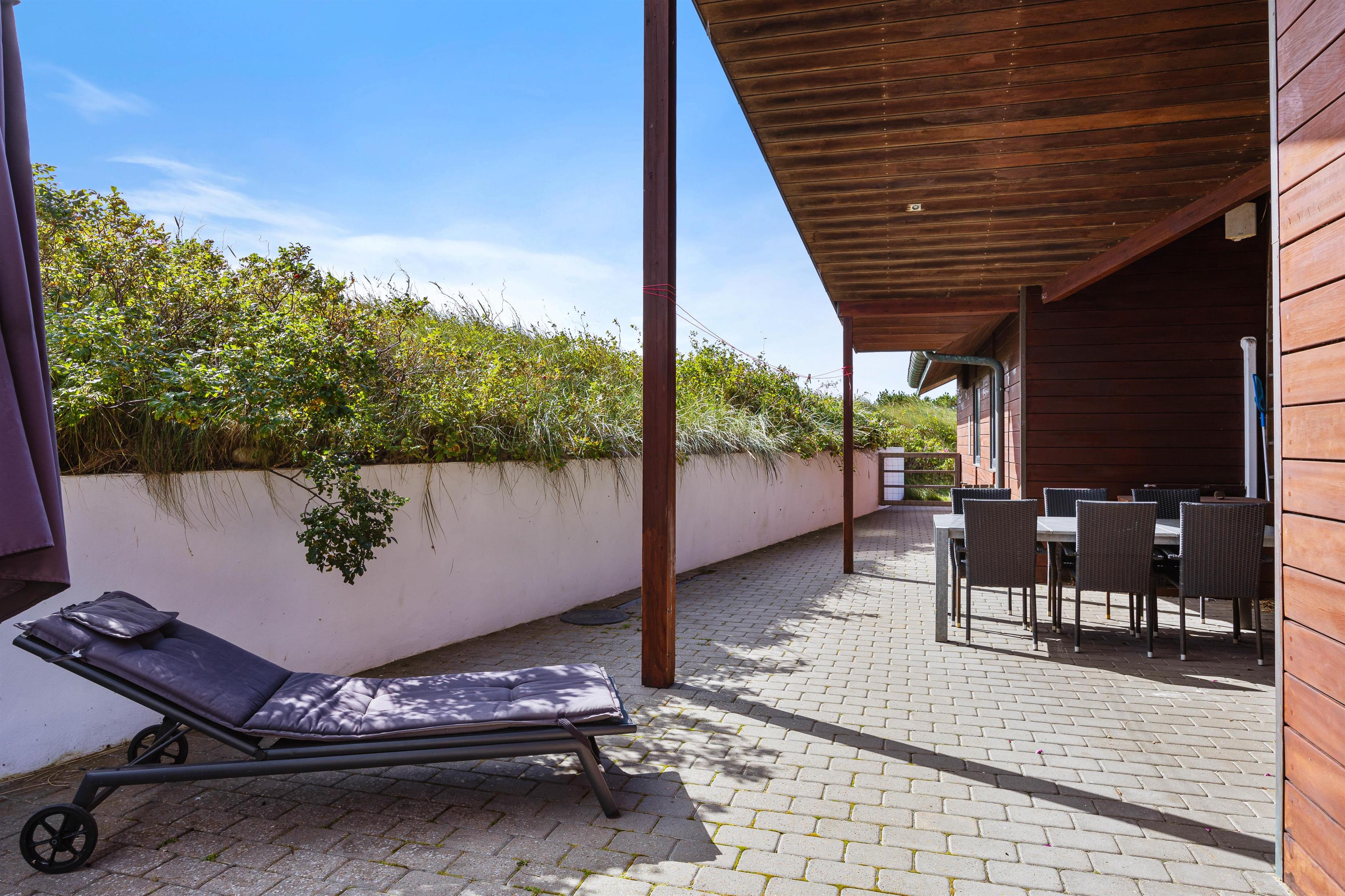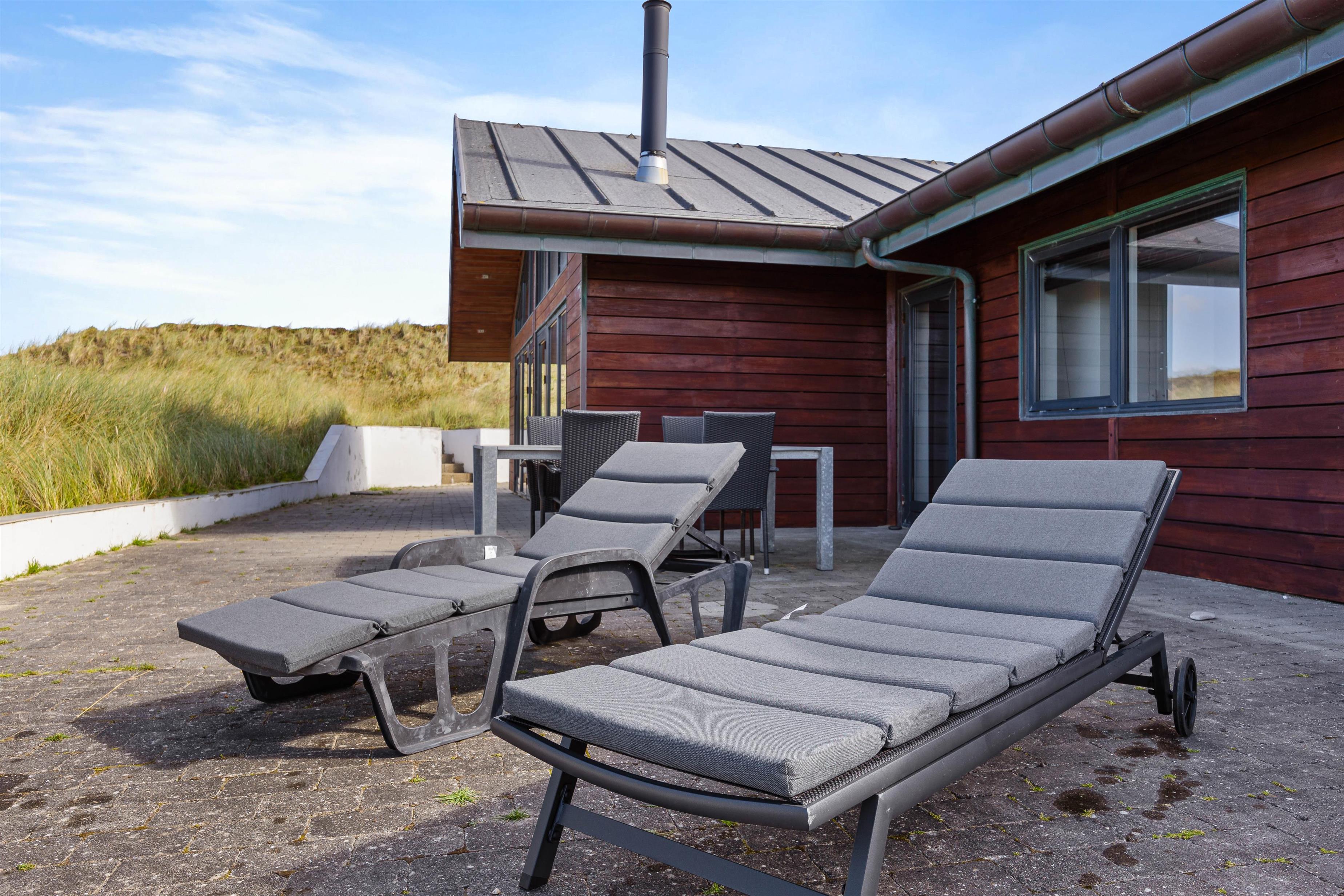 Omkring feriehuset er gode terrasser, som giver dig mulighed for at nyde naturen - uanset om du slapper af i en liggestol, spiser udendørs eller nyder hyggelige grillaftener. Da terrasserne går hele vejen rundt omkring feriehuset, vil I altid kunne finde en god plet med læ at trække jer tilbage på. Slap af i udespaen på en stjernefyldt aften og kom helt ned i gear før sengetid.