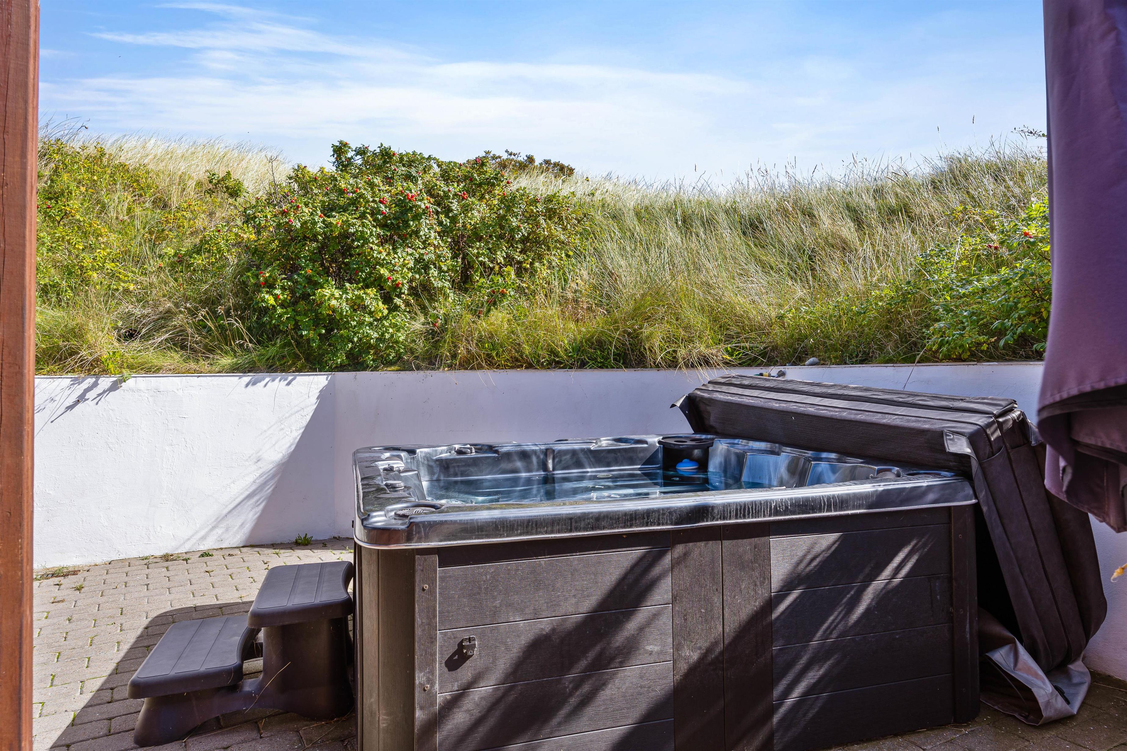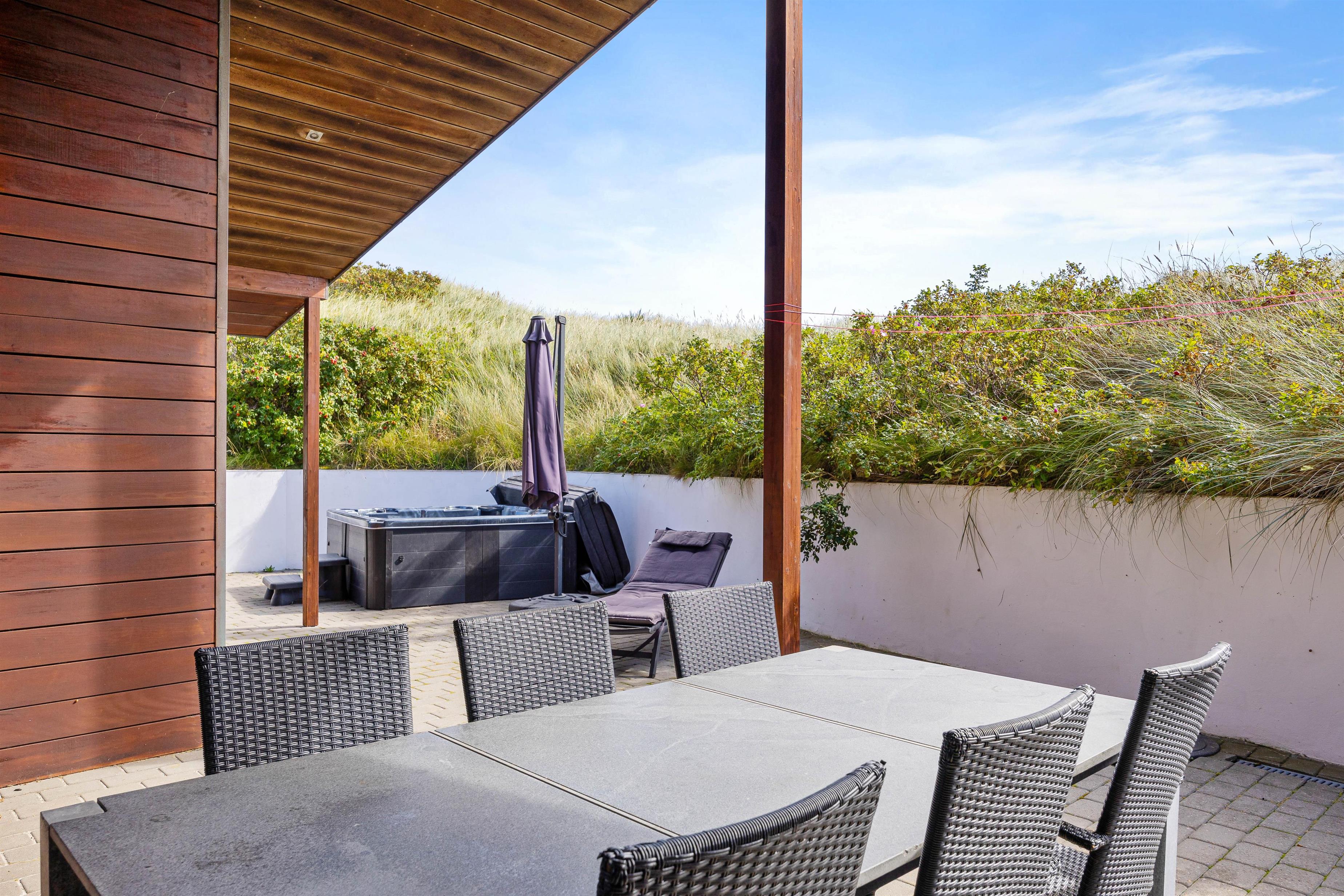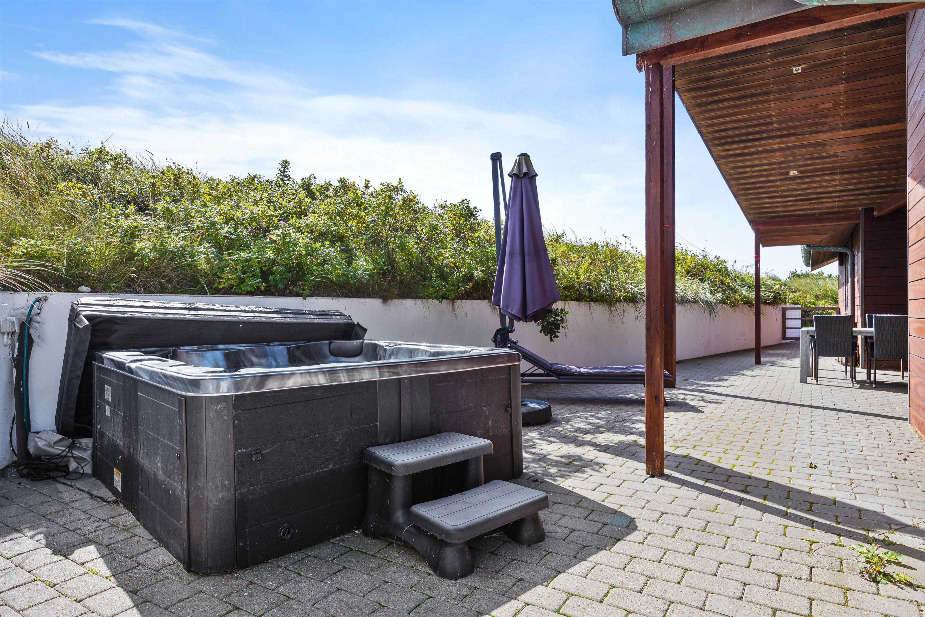 Omkring feriehuset er gode terrasser, som giver dig mulighed for at nyde naturen - uanset om du slapper af i en liggestol, spiser udendørs eller nyder hyggelige grillaftener. Da terrasserne går hele vejen rundt omkring feriehuset, vil I altid kunne finde en god plet med læ at trække jer tilbage på. Slap af i udespaen på en stjernefyldt aften og kom helt ned i gear før sengetid.