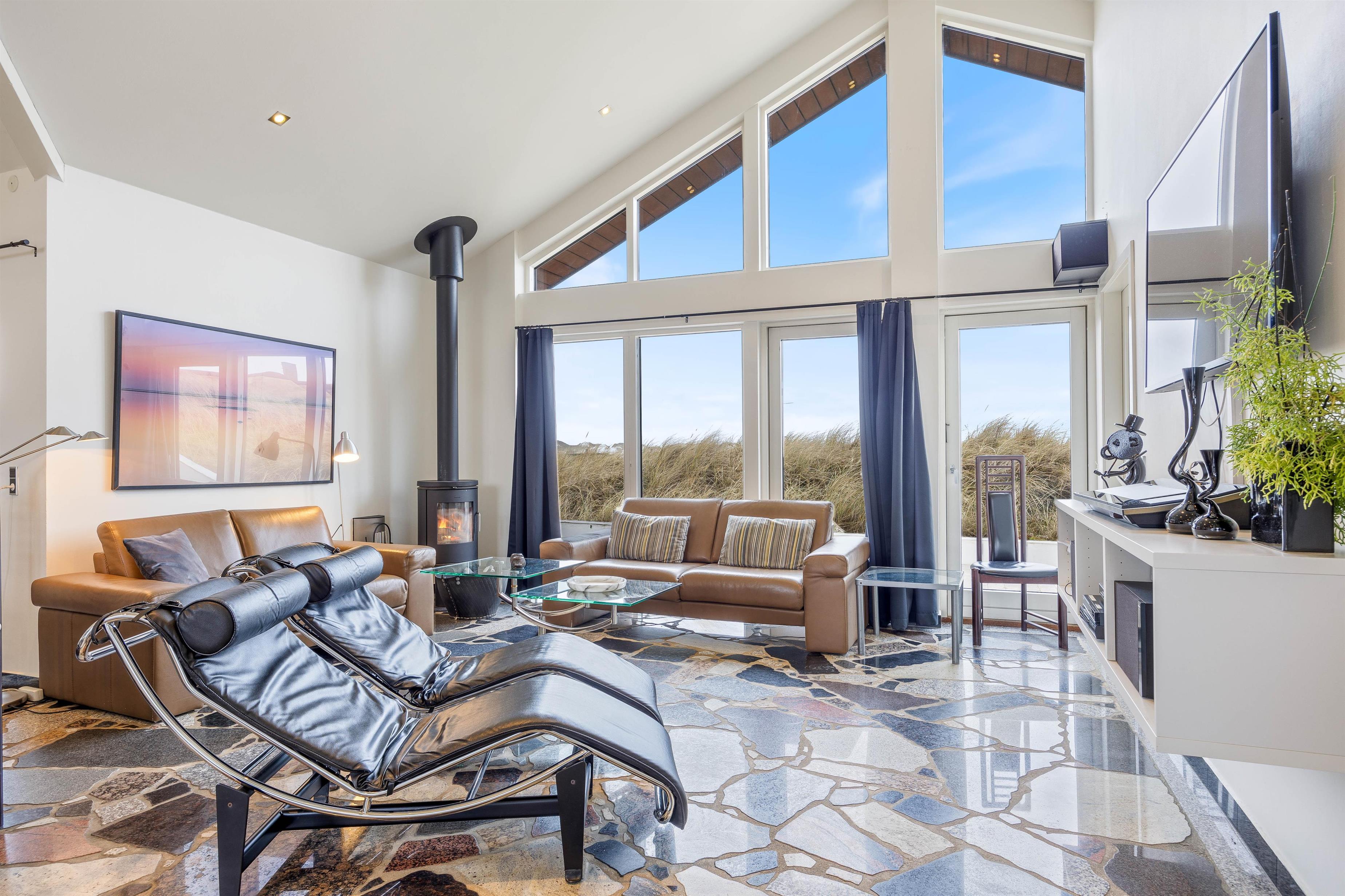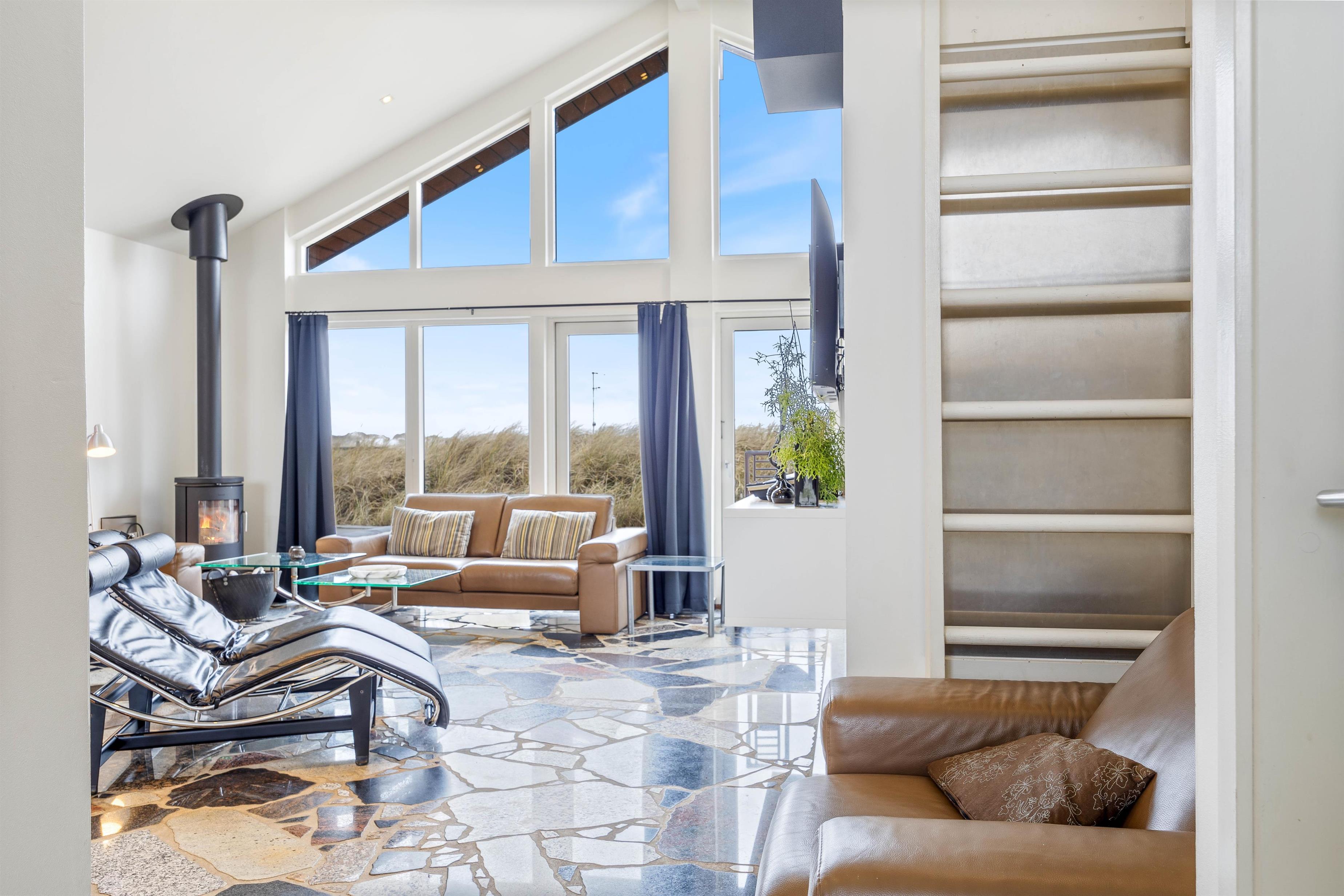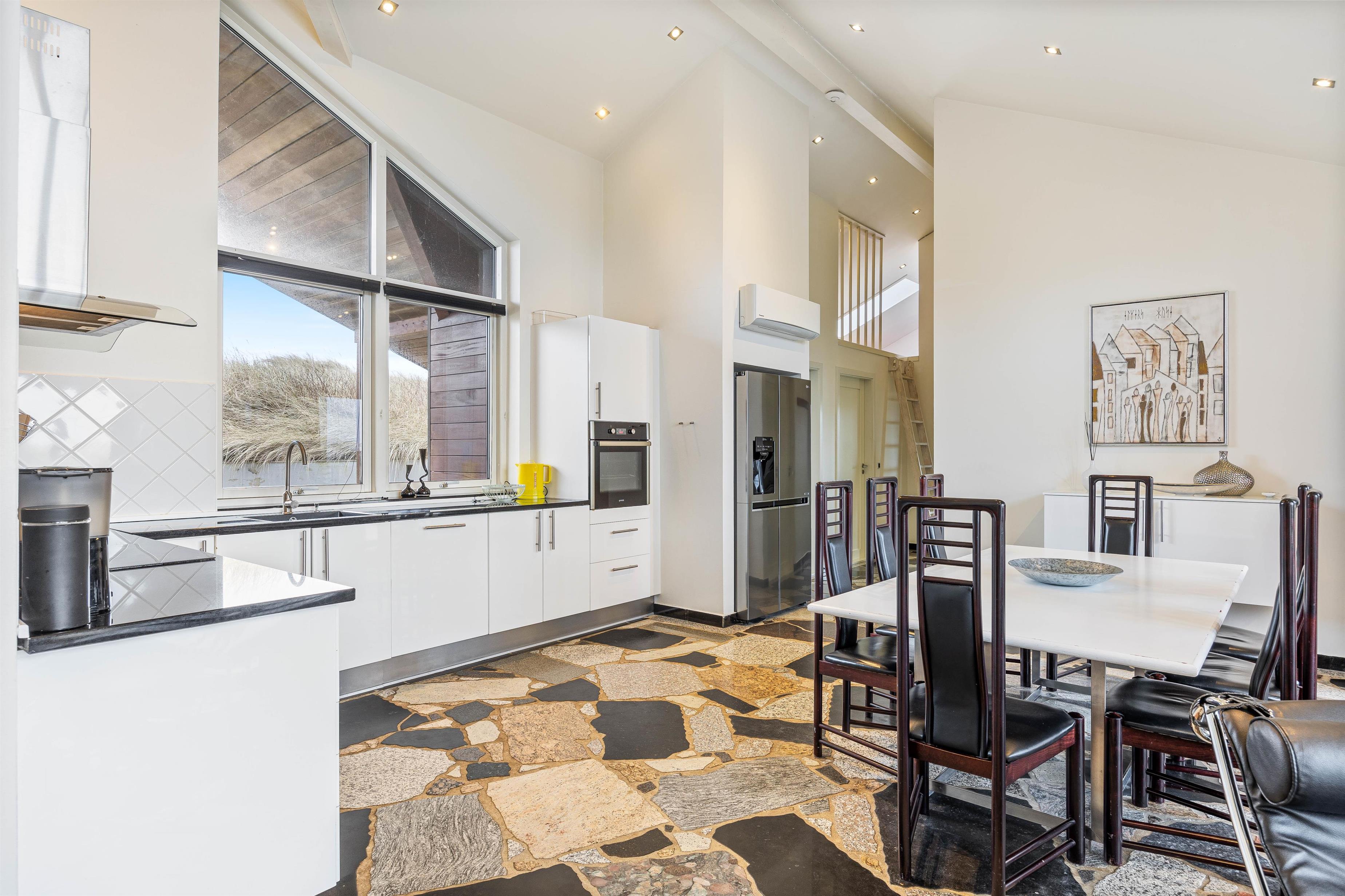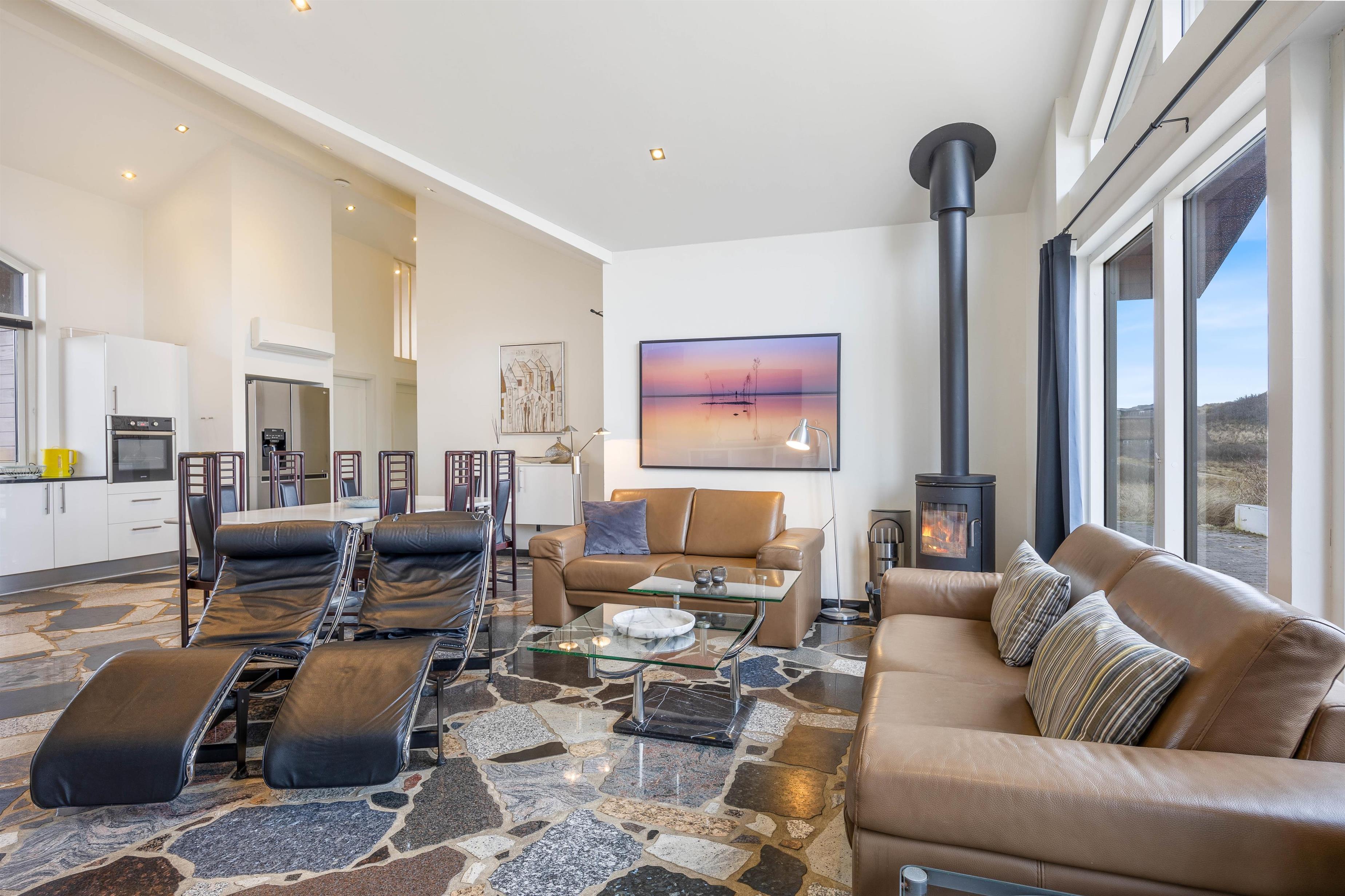 Sommerhusets kerne og mødested er det lyse og hyggelige åbne opholdsrum. Her er stue, køkken og spiseplads samlet omkring de fælles aktiviteter. Brændeovnen er placeret ved sofaen og skaber en hyggelig atmosfære. Slap af i sofaen med en film eller træk dig tilbage med en god bog, du kan roligt føle dig hjemme her. Ved det store spisebord kan I nyde de lækre måltider sammen, I kan spille et brætspil eller planlægge næste dags aktiviteter. Det åbne køkken indeholder alt, hvad I behøver for at tilberede måltiderne, herunder mikroovn, opvaskemaskine og amerikanerkøleskab.