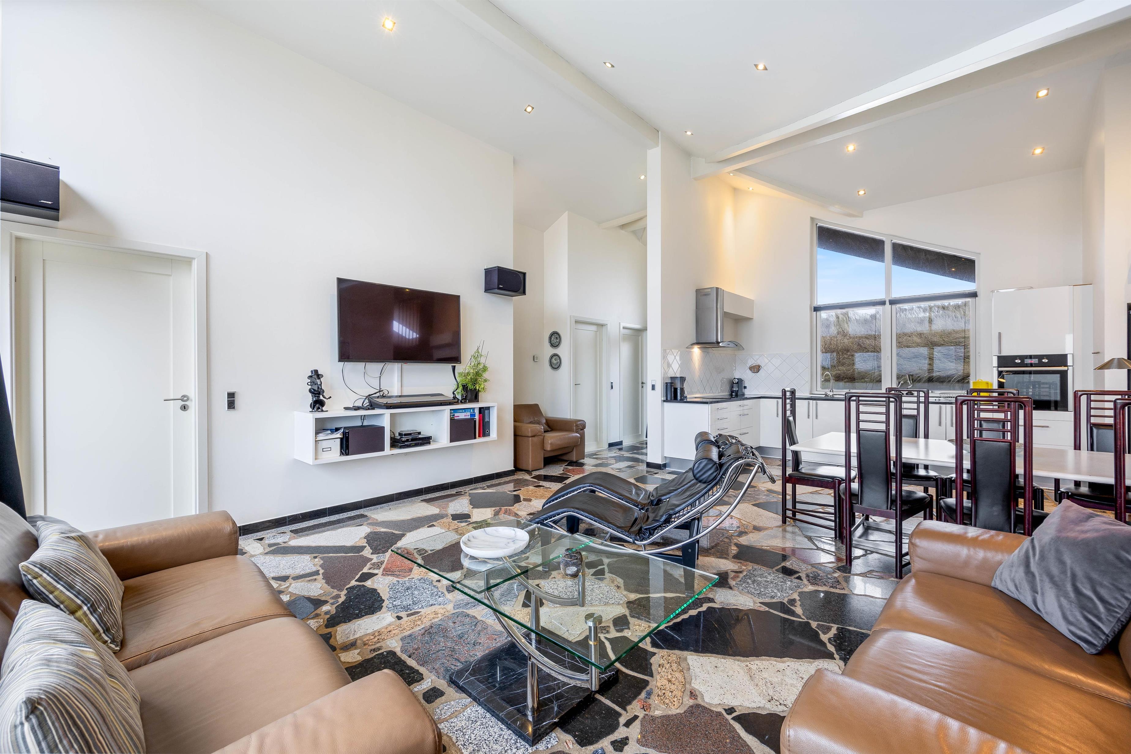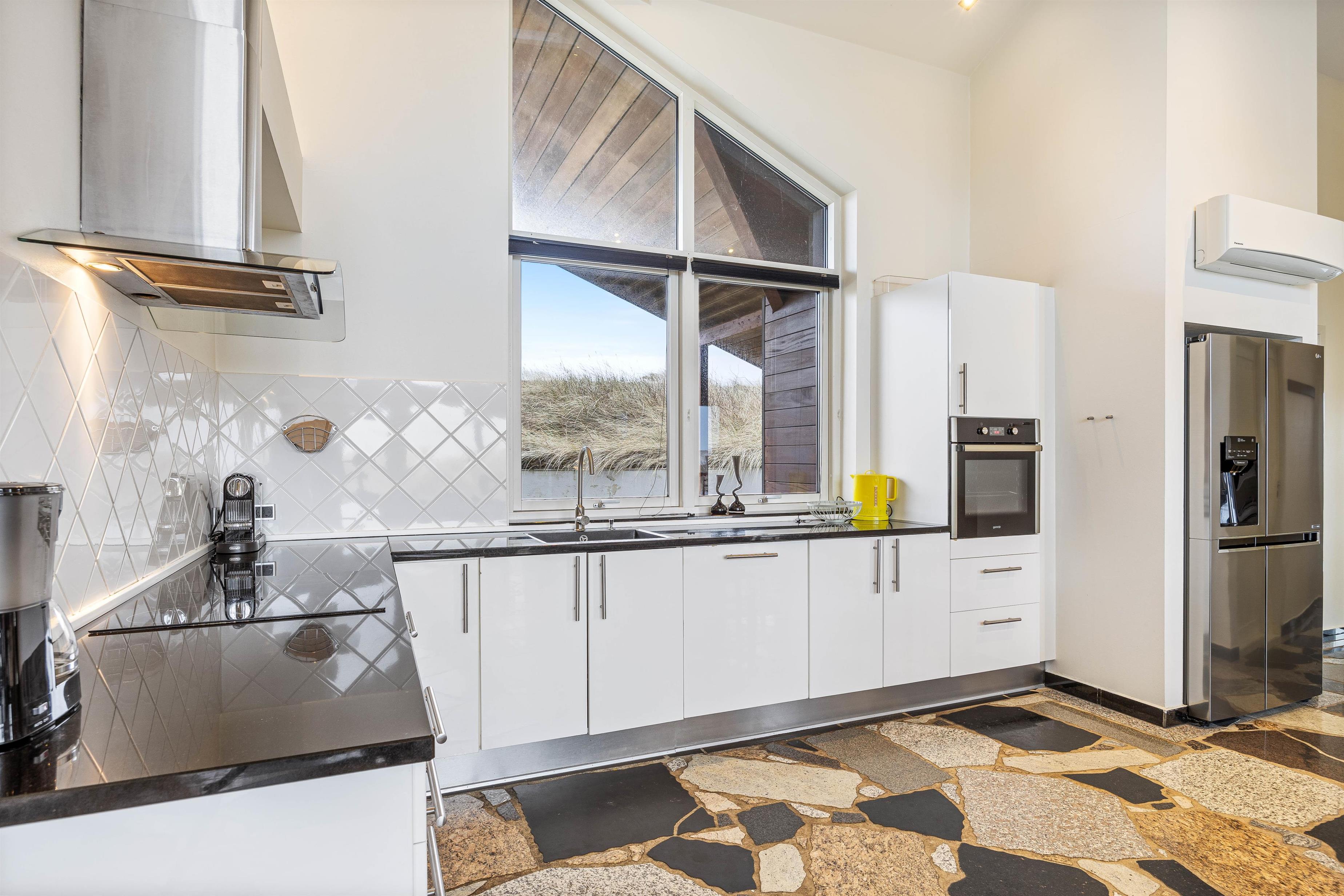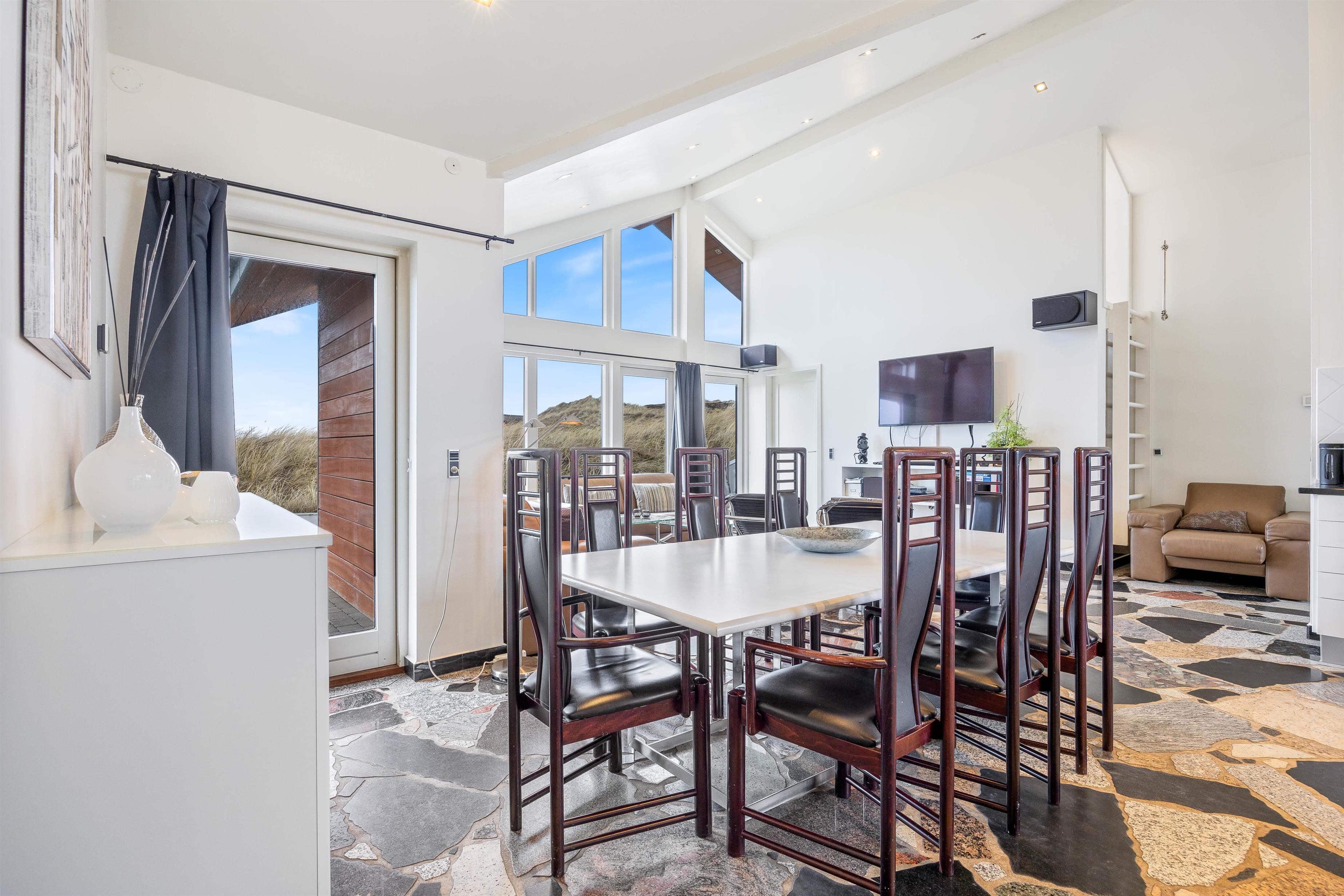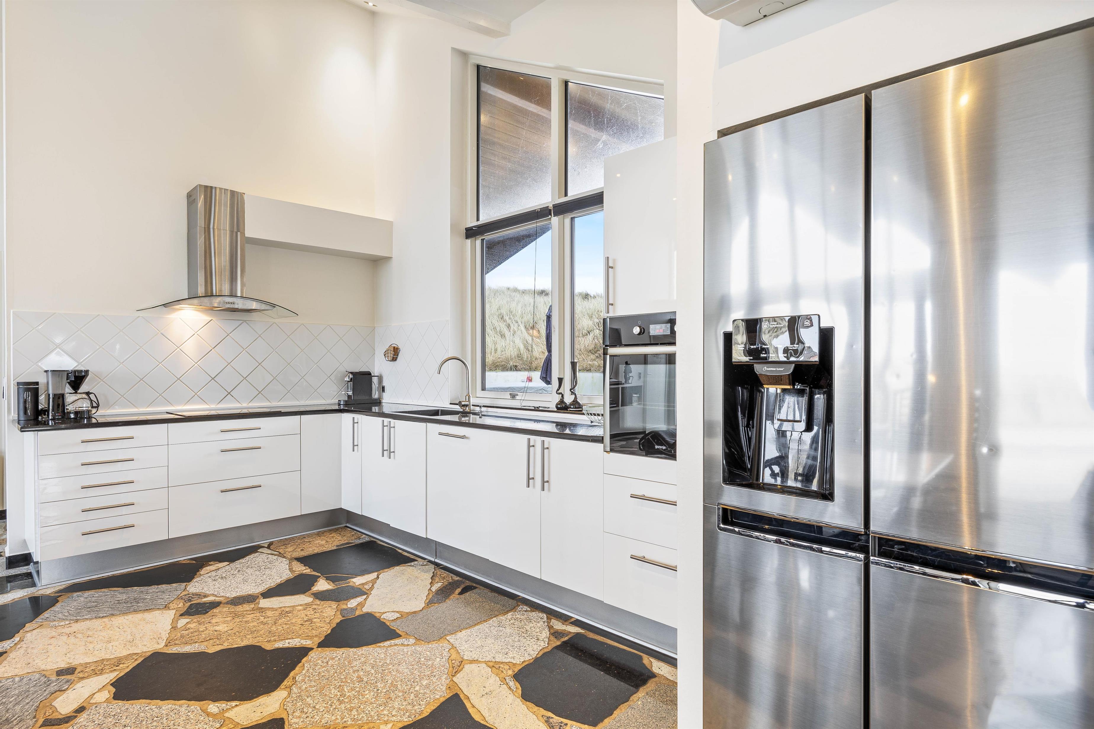 Sommerhusets kerne og mødested er det lyse og hyggelige åbne opholdsrum. Her er stue, køkken og spiseplads samlet omkring de fælles aktiviteter. Brændeovnen er placeret ved sofaen og skaber en hyggelig atmosfære. Slap af i sofaen med en film eller træk dig tilbage med en god bog, du kan roligt føle dig hjemme her. Ved det store spisebord kan I nyde de lækre måltider sammen, I kan spille et brætspil eller planlægge næste dags aktiviteter. Det åbne køkken indeholder alt, hvad I behøver for at tilberede måltiderne, herunder mikroovn, opvaskemaskine og amerikanerkøleskab.