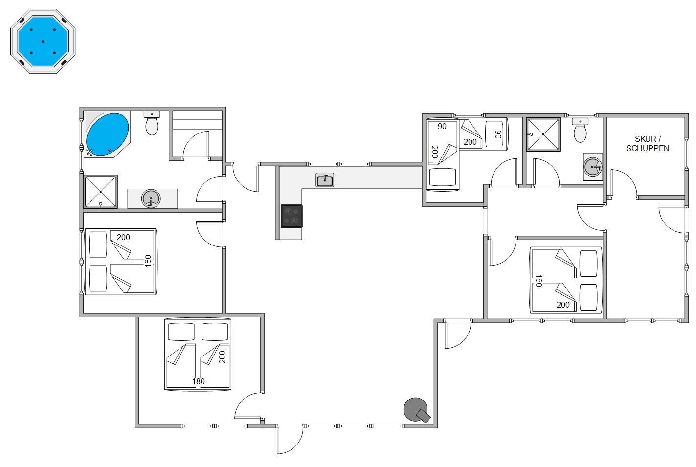 Der er gulvvarme i hele sommerhuset, samt en energibesparende varmepumpe, som hurtigt og effektivt sørger for et behageligt indeklima og en god temperatur. Vaskemaskine og tørretumbler er også til rådighed for jer, så I kan friske garderoben og håndklæderne op under jeres ophold. I det 132 kvadratmeter store sommerhus er 2 badeværelser, hvor der i forbindelse med det store badeværelse også er sauna og spa. I har således god mulighed for at arrangere jeres egen lille wellnessaften, især hvis I også inddrager udespaen. I de 4 soveværelser er 8 komfortable sengepladser, 3 soveværelser med dobbeltsenge og et med 2 enkeltsenge.
