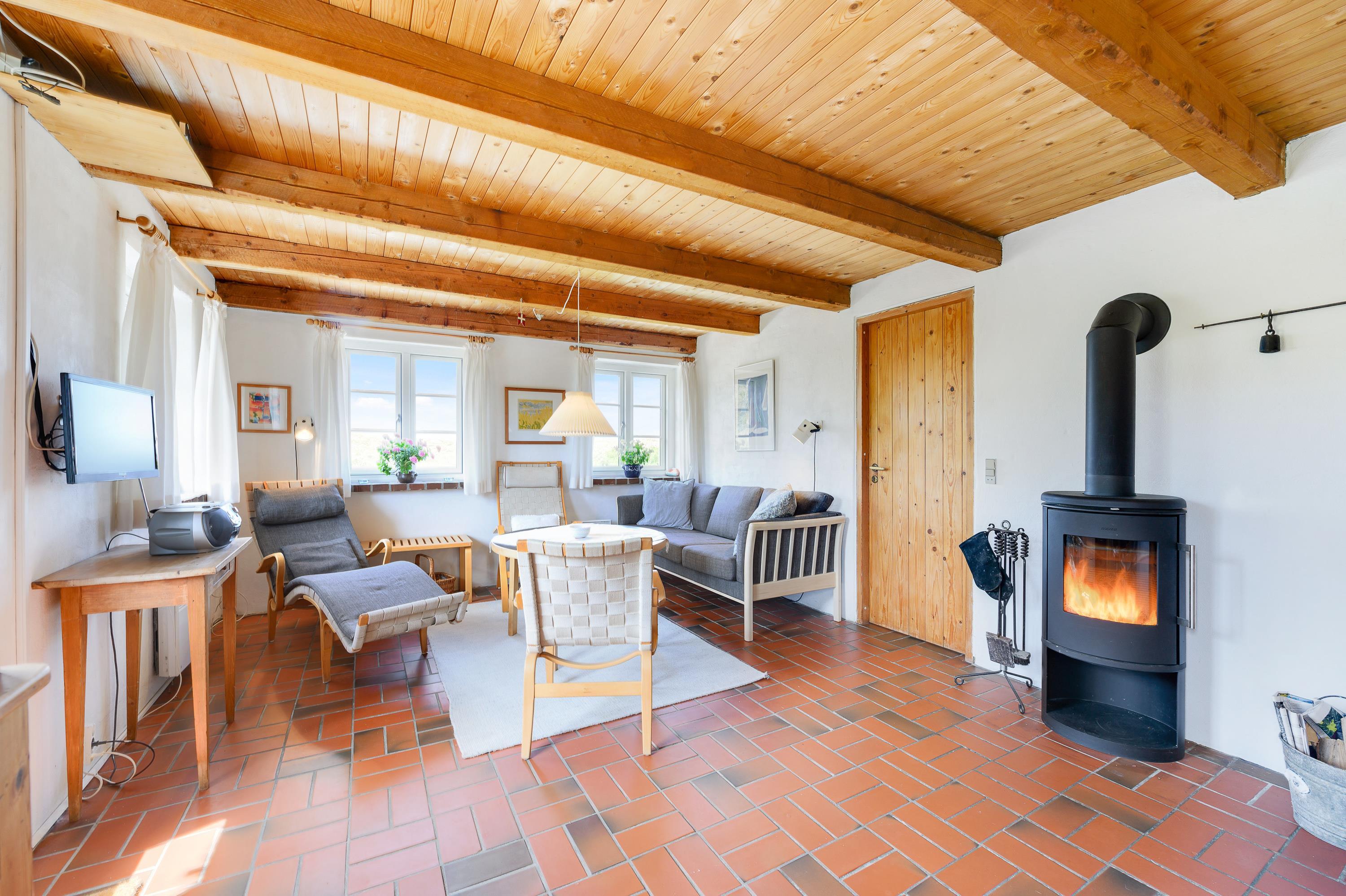 I stuen er brændeovnen centralt placeret, så sæt jer godt tilrette i sofaen - evt. med en hyggelig bog og en kop kaffe og nyd den behagelige varme fra brændeovnen. Her er også en energibesparende varmepumpe, som I med fordel kan benytte jer af til at holde en behagelig temperatur i rummet. I sommerhuset er der både danske tv-kanaler samt Chromecast.