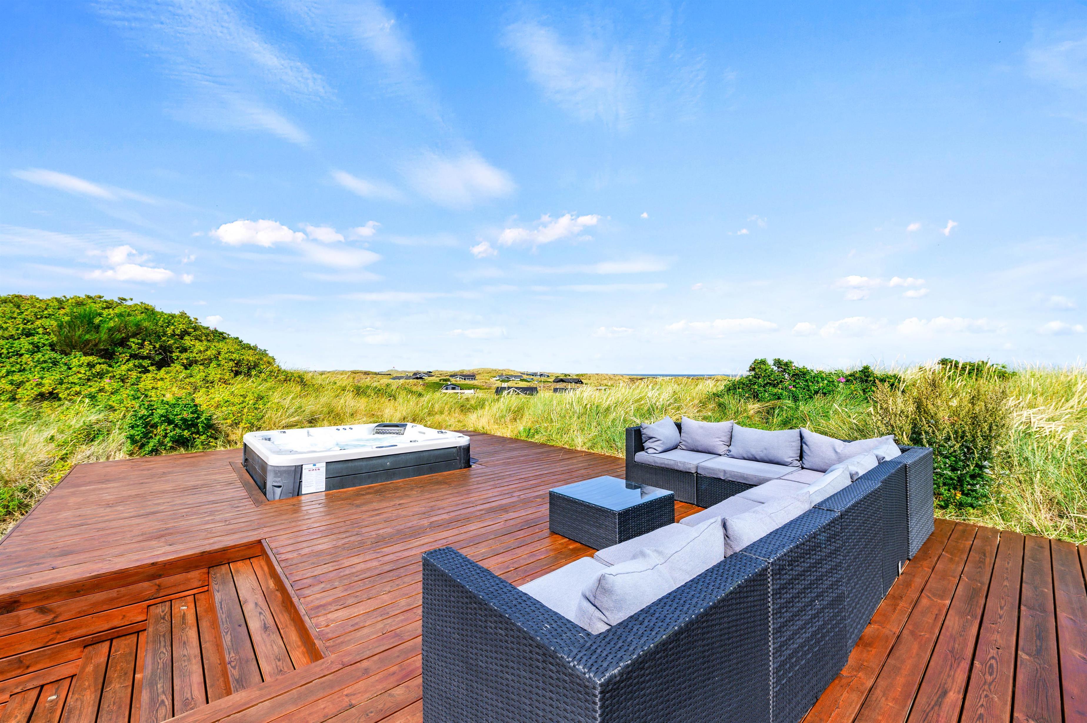 På Havvej 12 i Skodbjerge ligger denne drøm af et feriehus til 8 personer. Feriehus indeholder alt, hvad feriehjertet begærer, og der er sørget for underholdning for både store og små med blandt andet udendørs spa, sauna og aktivitetsrum. Beliggenheden er fantastisk, på en klittop tæt på Vesterhavet og med både hav- og fjordkig. Hunden er også velkommen!
