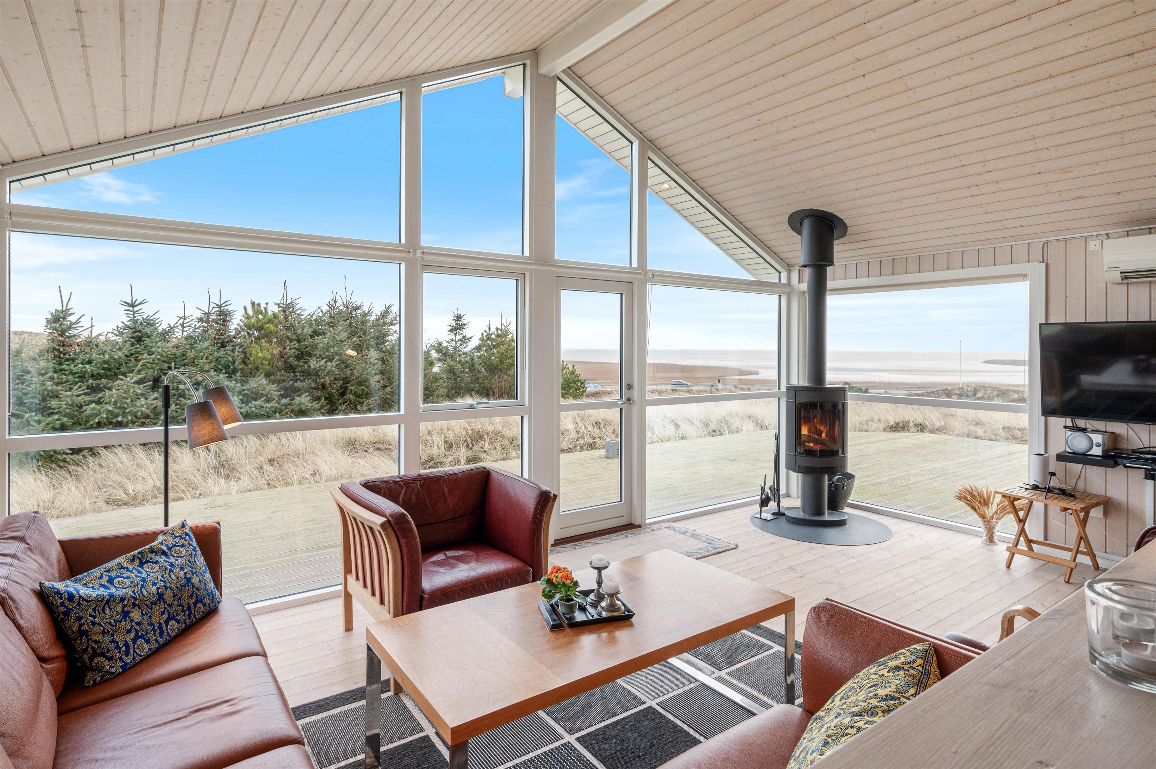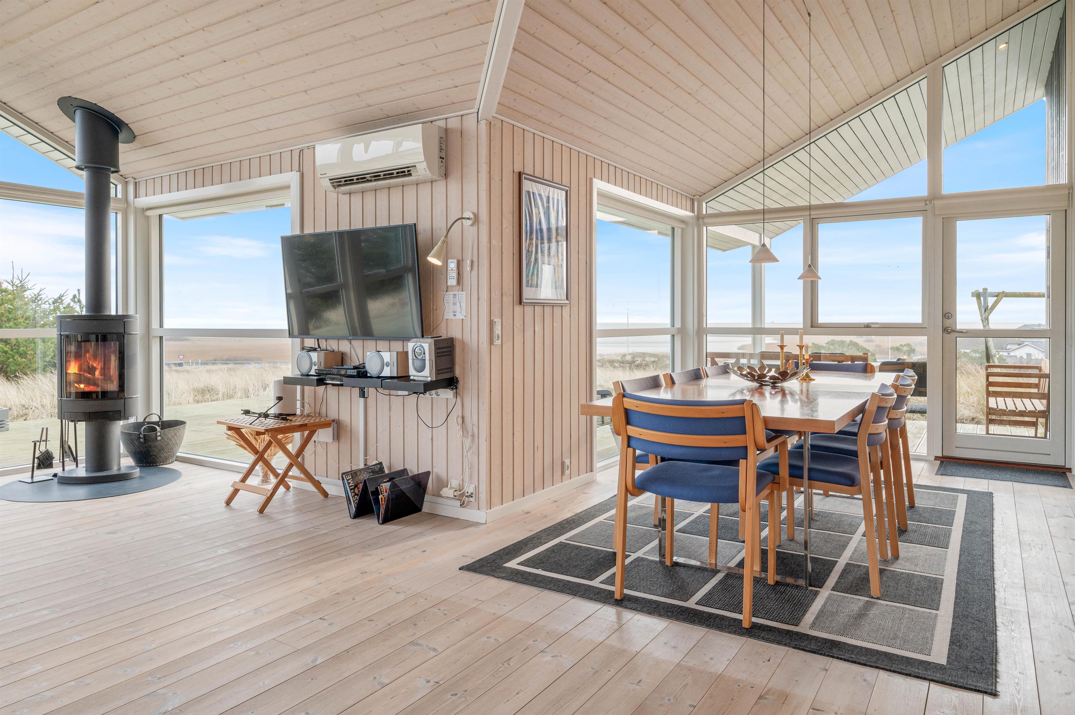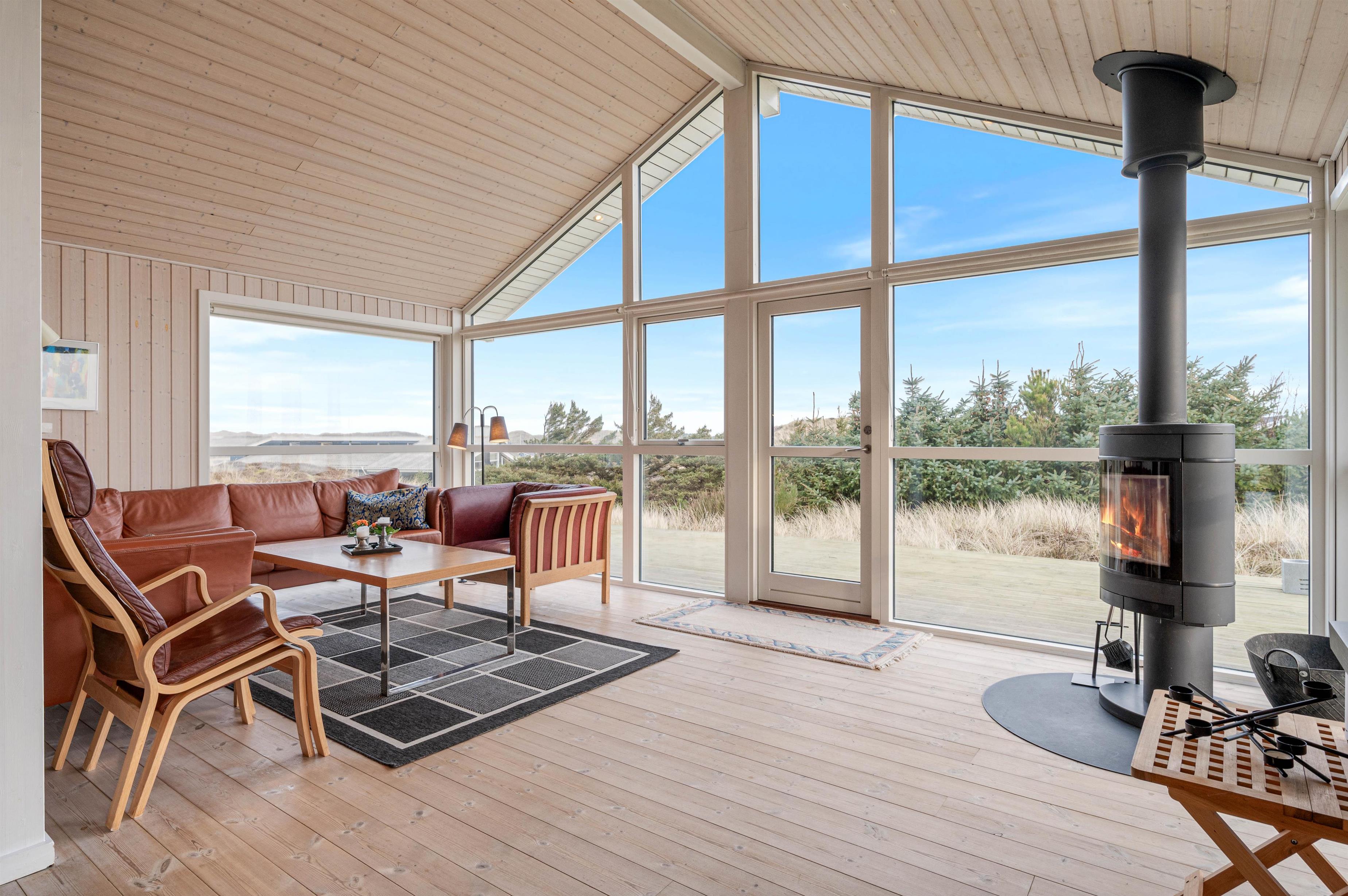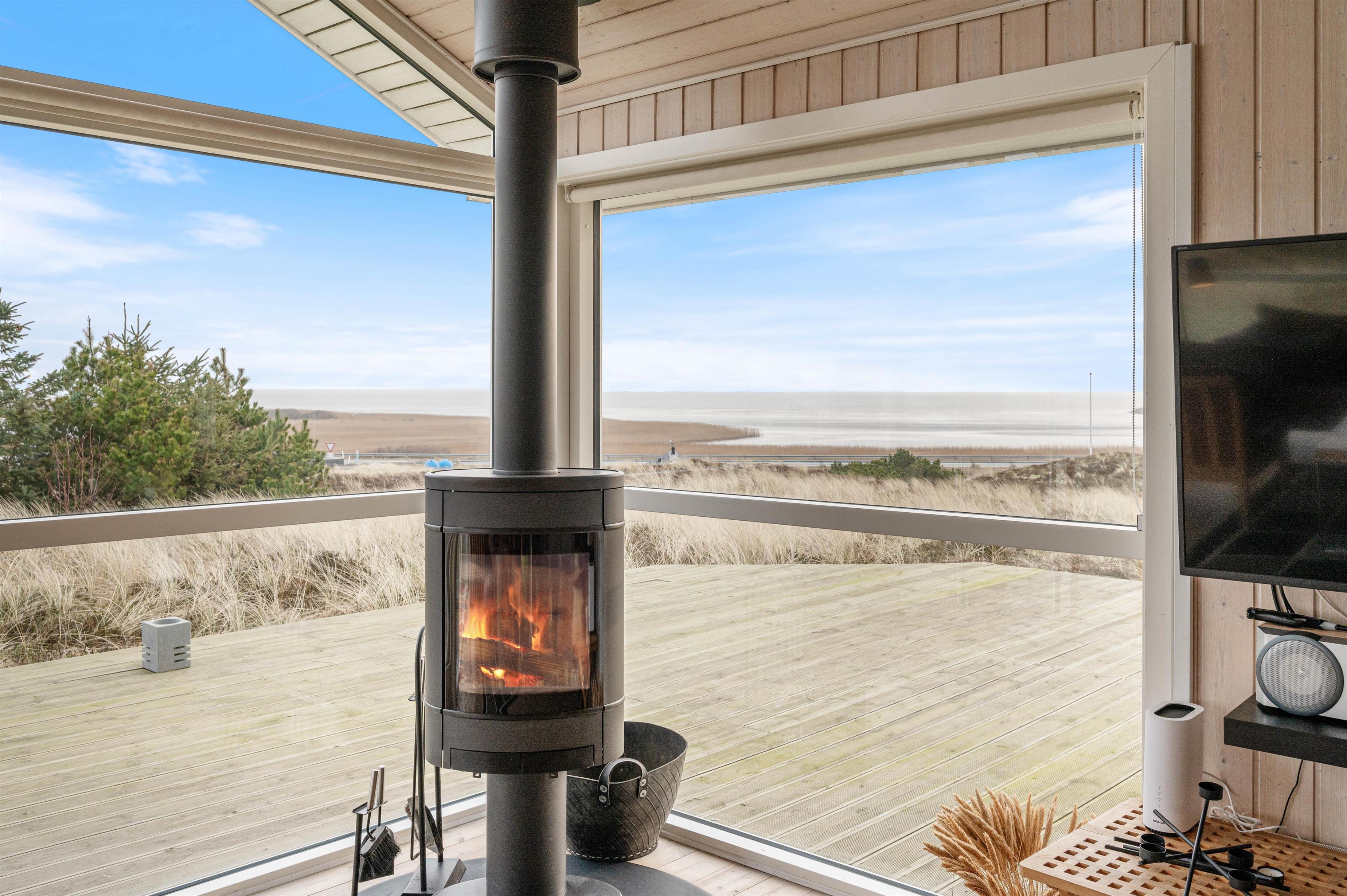 Straks I træder ind i sommerhusets opholdsrum, springer det store vinduesparti jer i øjnene. Naturligt lys og en uimodståelig smuk udsigt over Ringkøbing Fjord og det omkringliggende hedeområde sørger for en følelse af velvære. Træk vejret dybt ned i maven, lyt til Vesterhavet og sug hvert øjeblik til dig. Her vil I hurtig finde jer godt tilpas i sofaen, mens brændeovnen knitrer og spreder varme samt en ekstra hyggelig feriestemning. I feriehuset finder I en energibesparende varmepumpe, som også kan køle på de varme sommerdage.