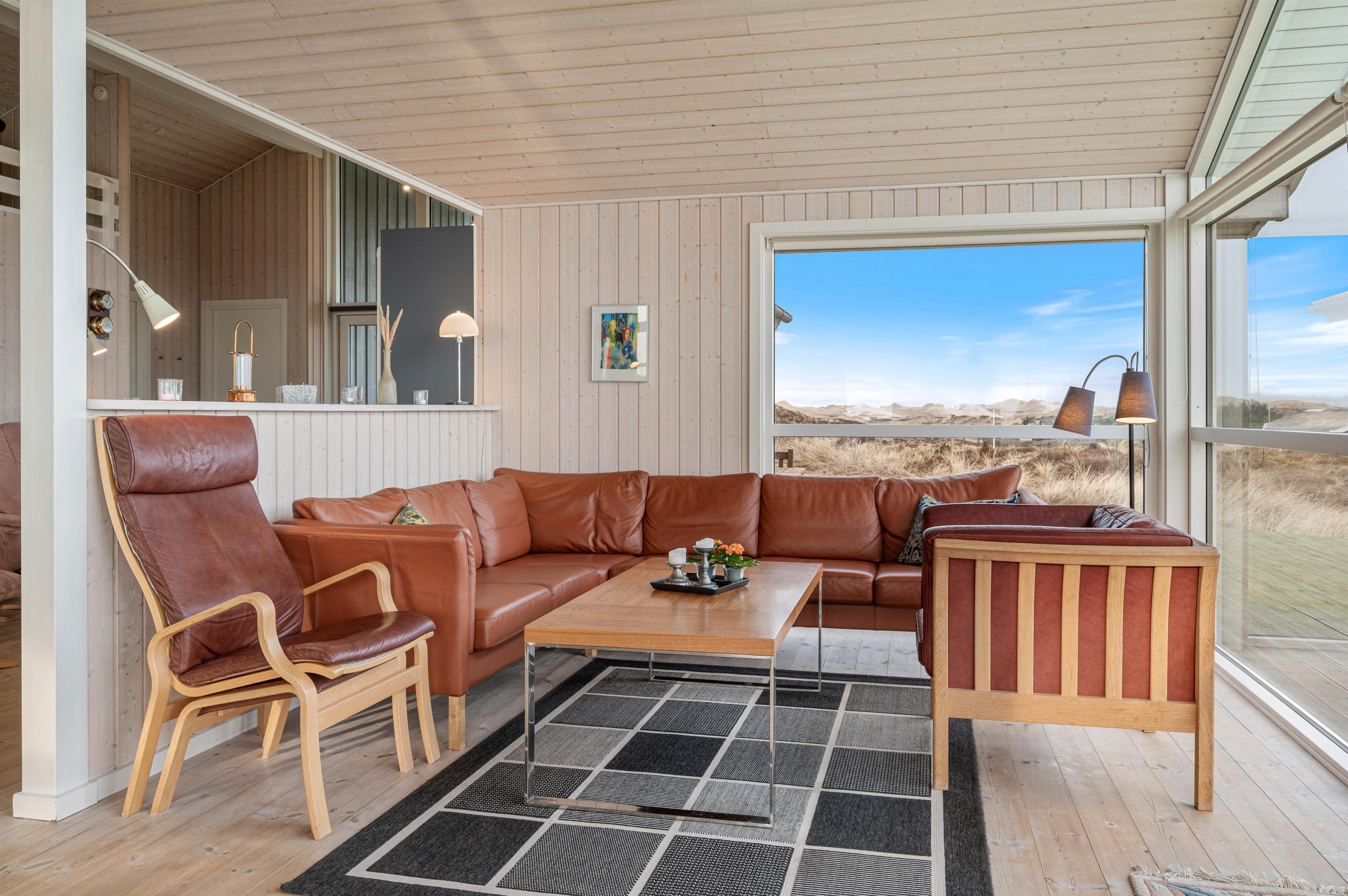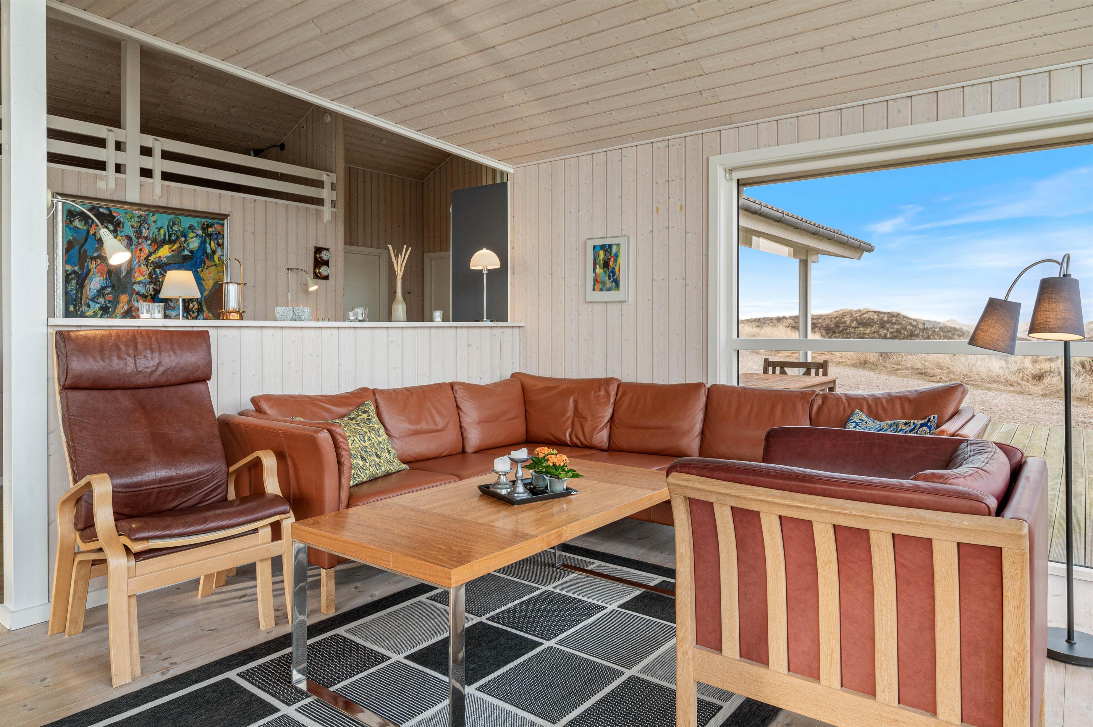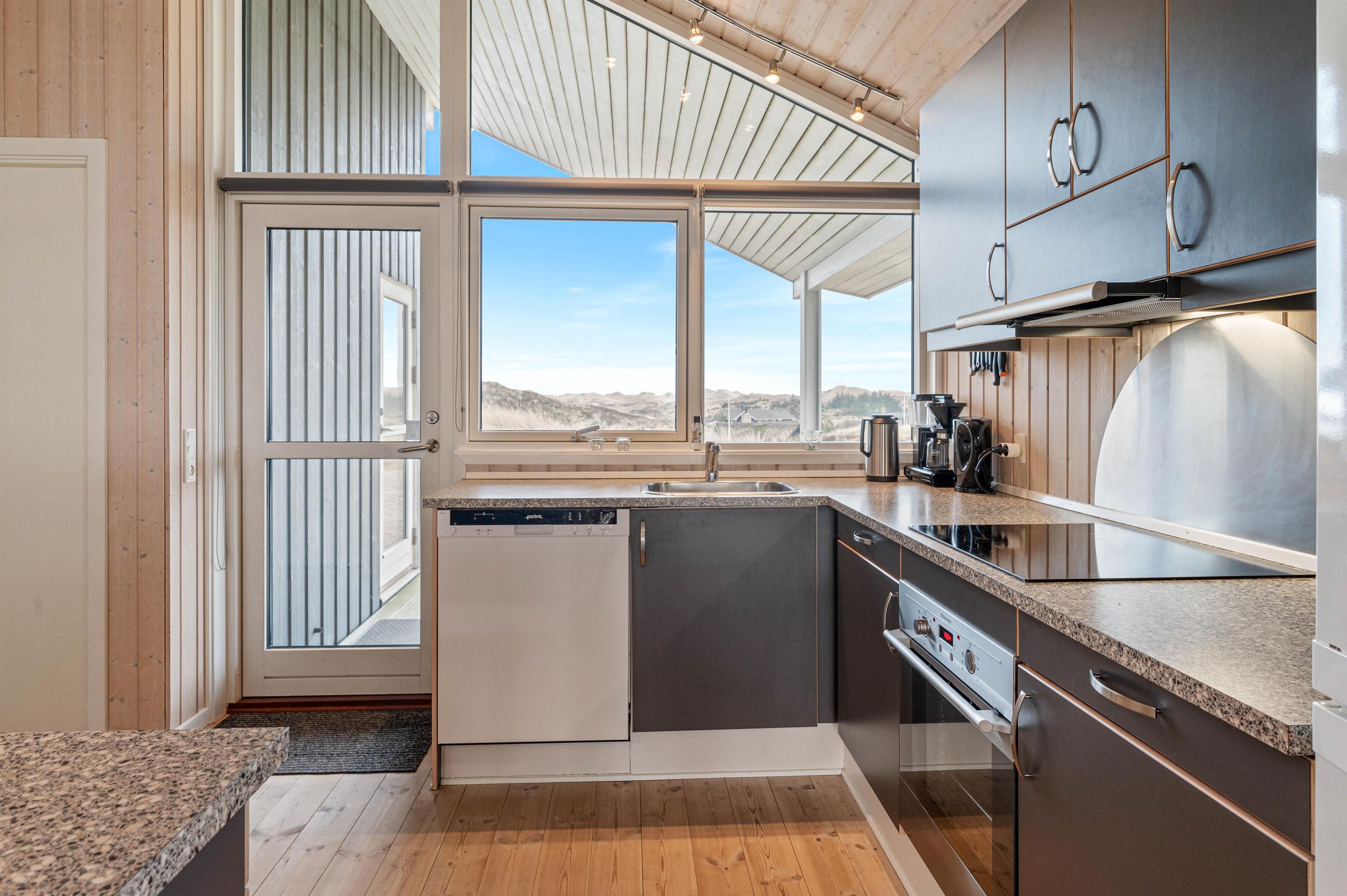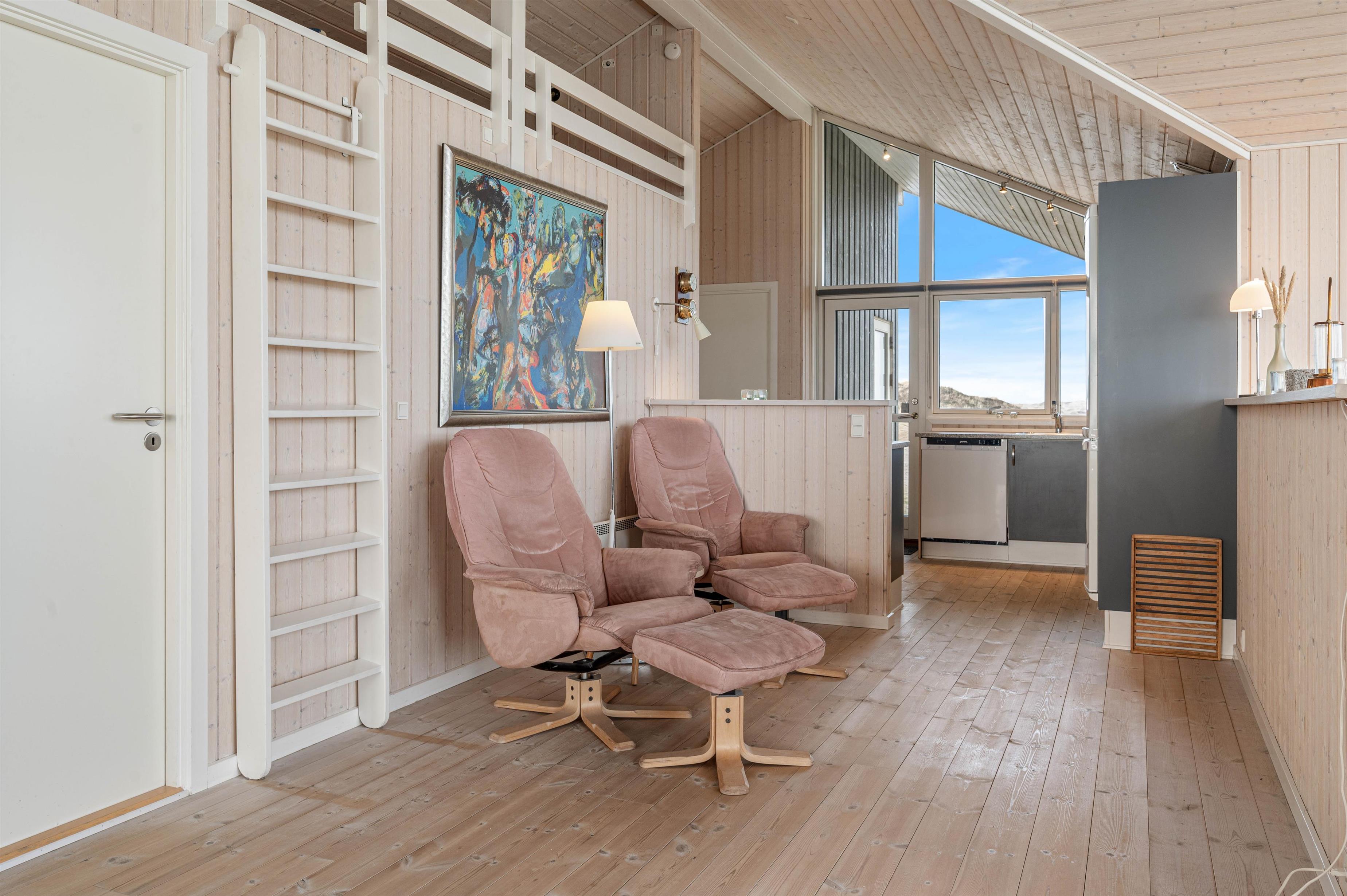 Straks I træder ind i sommerhusets opholdsrum, springer det store vinduesparti jer i øjnene. Naturligt lys og en uimodståelig smuk udsigt over Ringkøbing Fjord og det omkringliggende hedeområde sørger for en følelse af velvære. Træk vejret dybt ned i maven, lyt til Vesterhavet og sug hvert øjeblik til dig. Her vil I hurtig finde jer godt tilpas i sofaen, mens brændeovnen knitrer og spreder varme samt en ekstra hyggelig feriestemning. I feriehuset finder I en energibesparende varmepumpe, som også kan køle på de varme sommerdage.