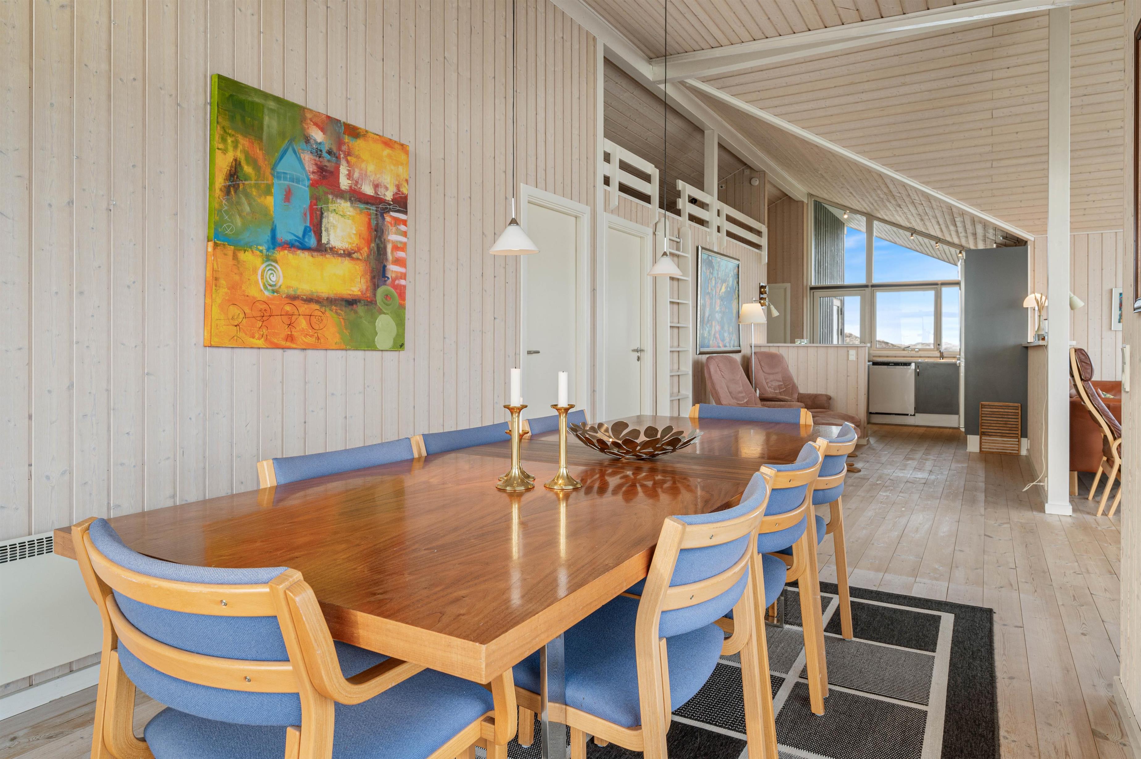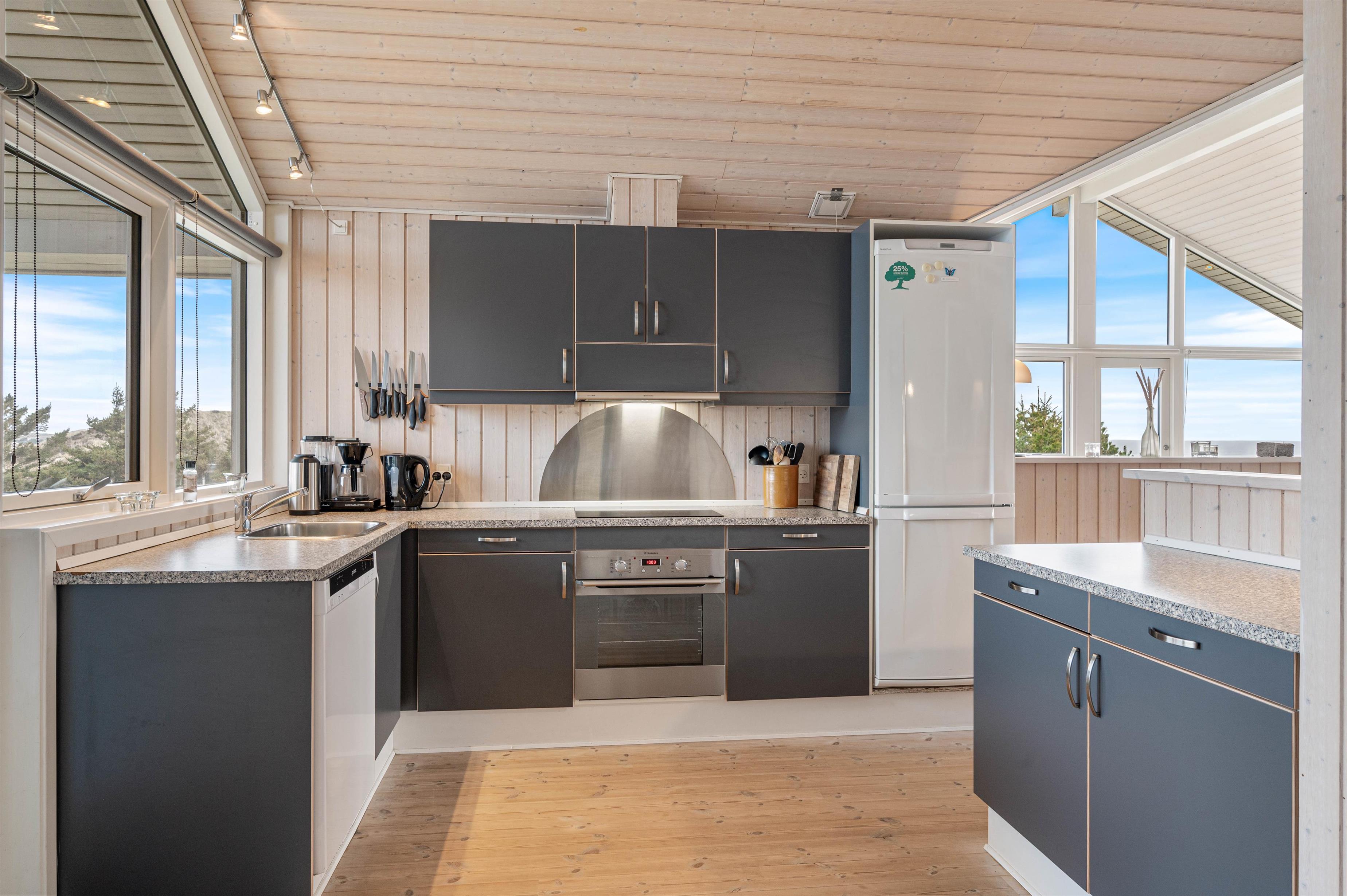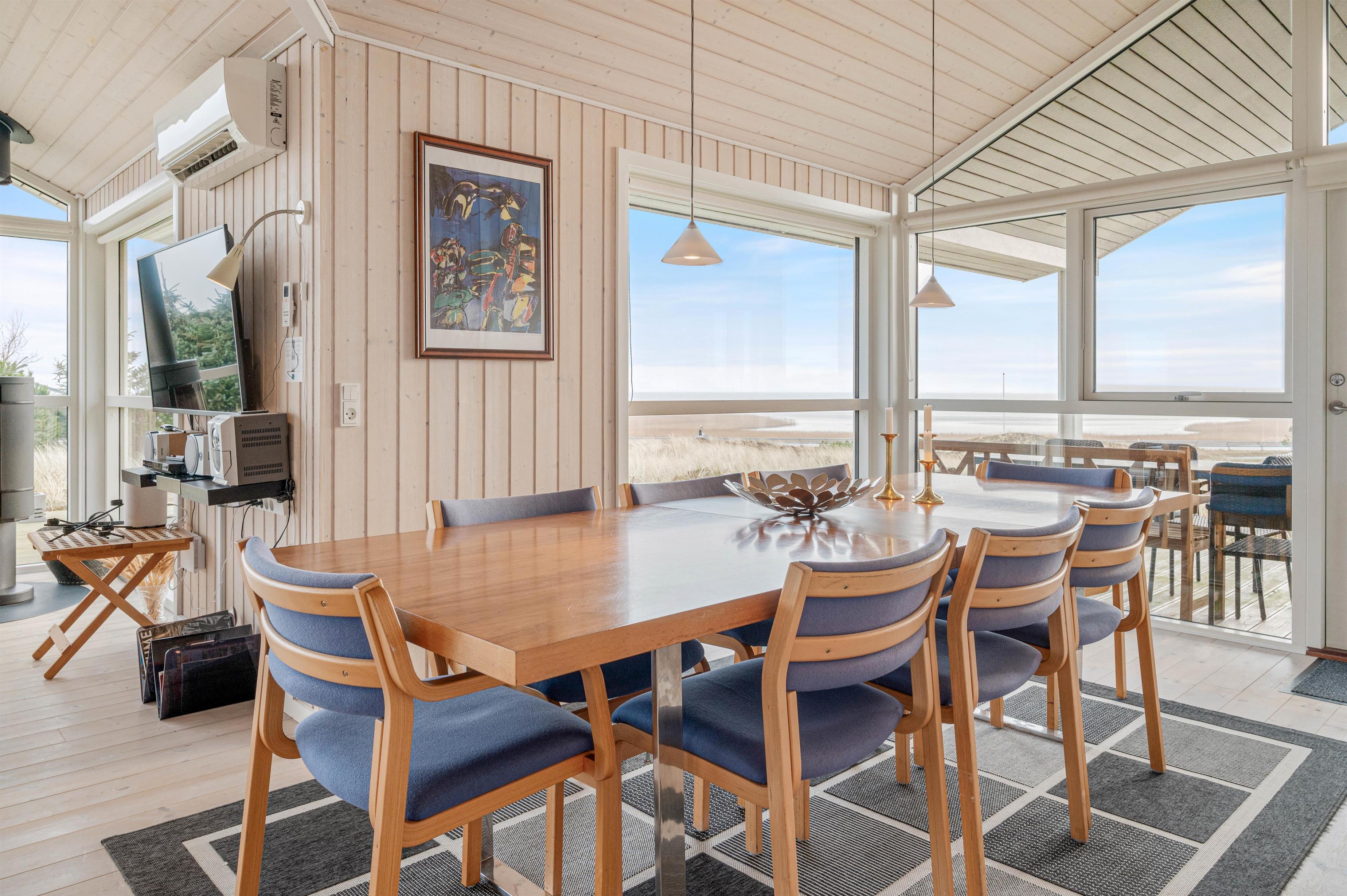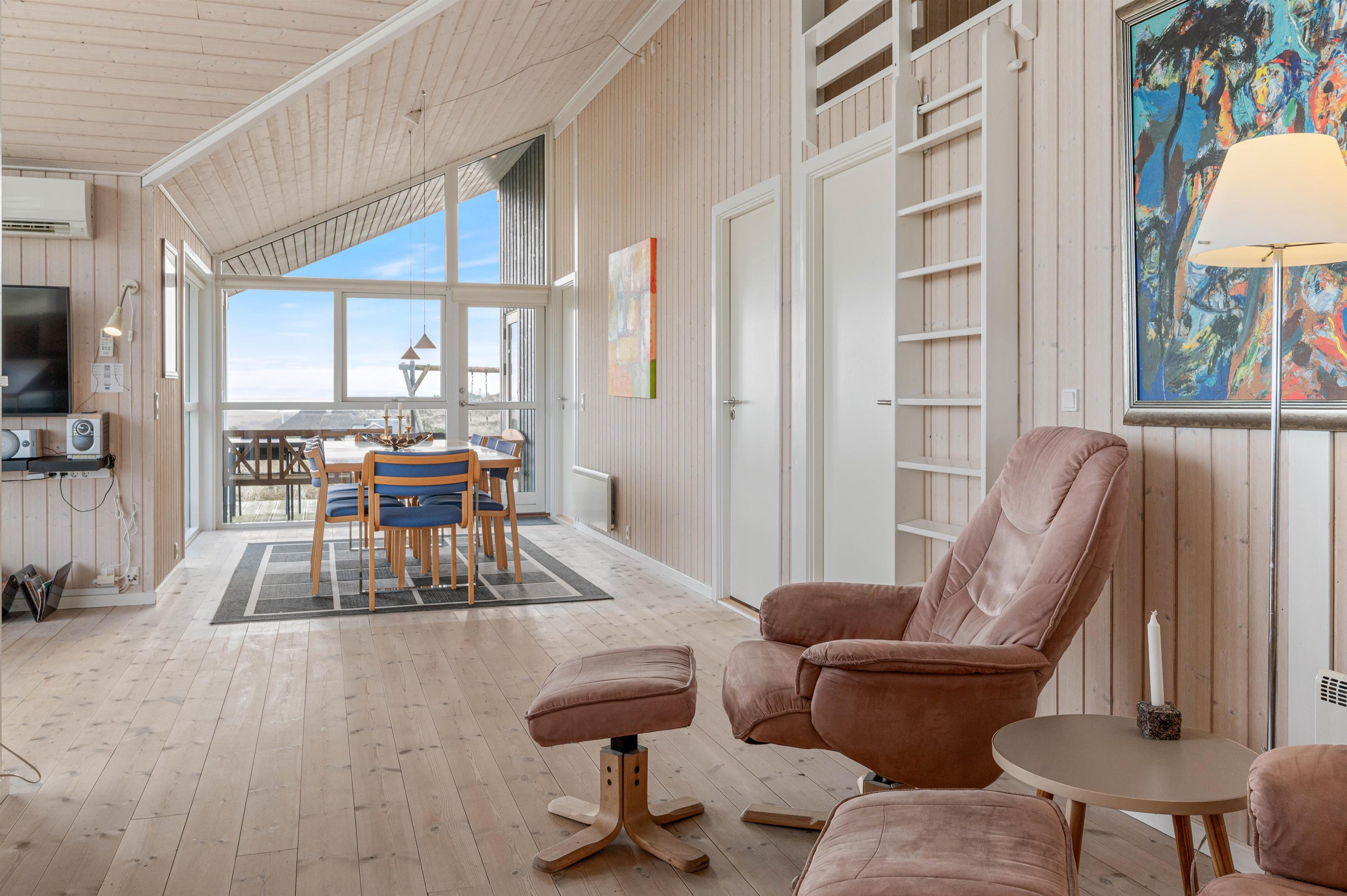 Straks I træder ind i sommerhusets opholdsrum, springer det store vinduesparti jer i øjnene. Naturligt lys og en uimodståelig smuk udsigt over Ringkøbing Fjord og det omkringliggende hedeområde sørger for en følelse af velvære. Træk vejret dybt ned i maven, lyt til Vesterhavet og sug hvert øjeblik til dig. Her vil I hurtig finde jer godt tilpas i sofaen, mens brændeovnen knitrer og spreder varme samt en ekstra hyggelig feriestemning. I feriehuset finder I en energibesparende varmepumpe, som også kan køle på de varme sommerdage.