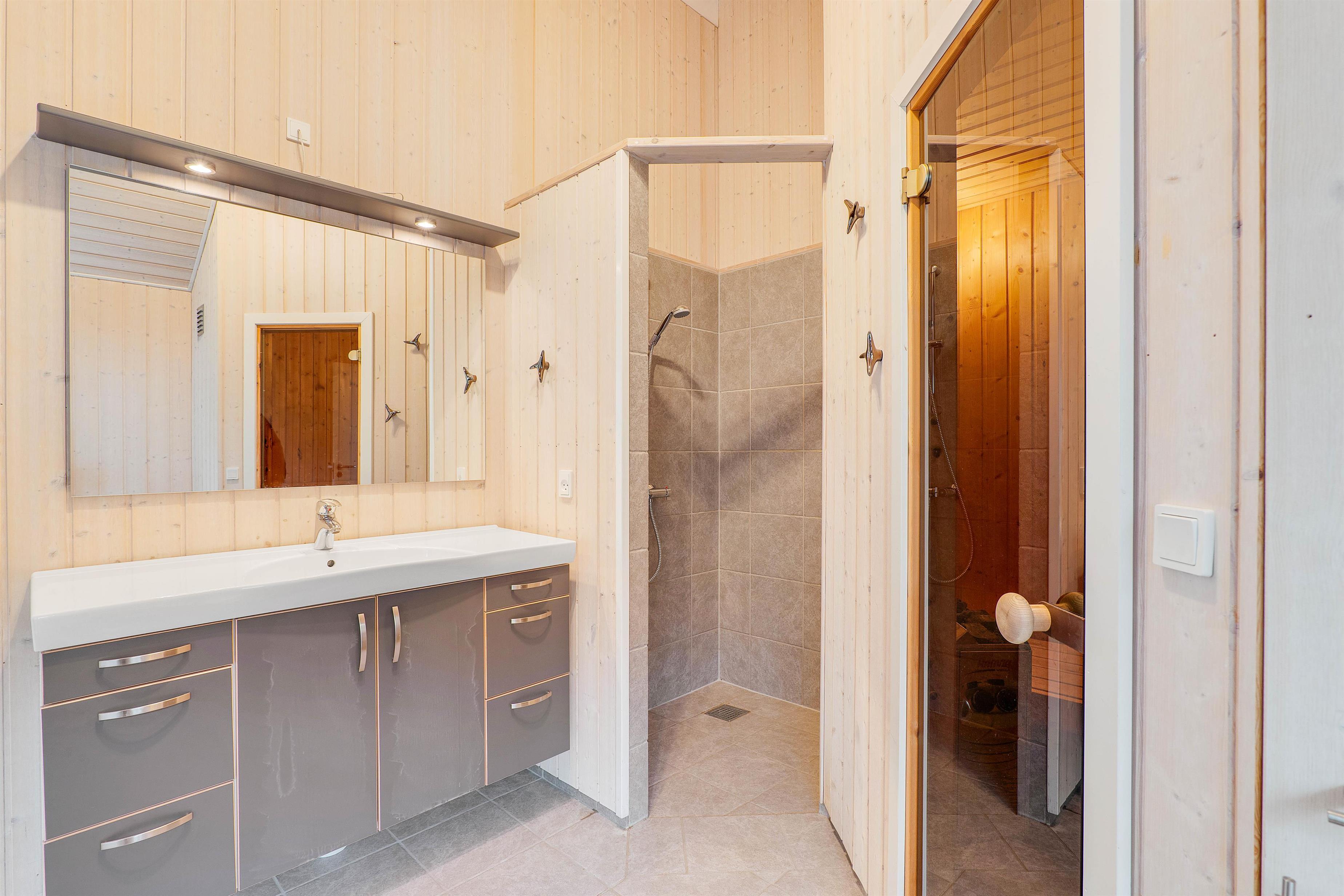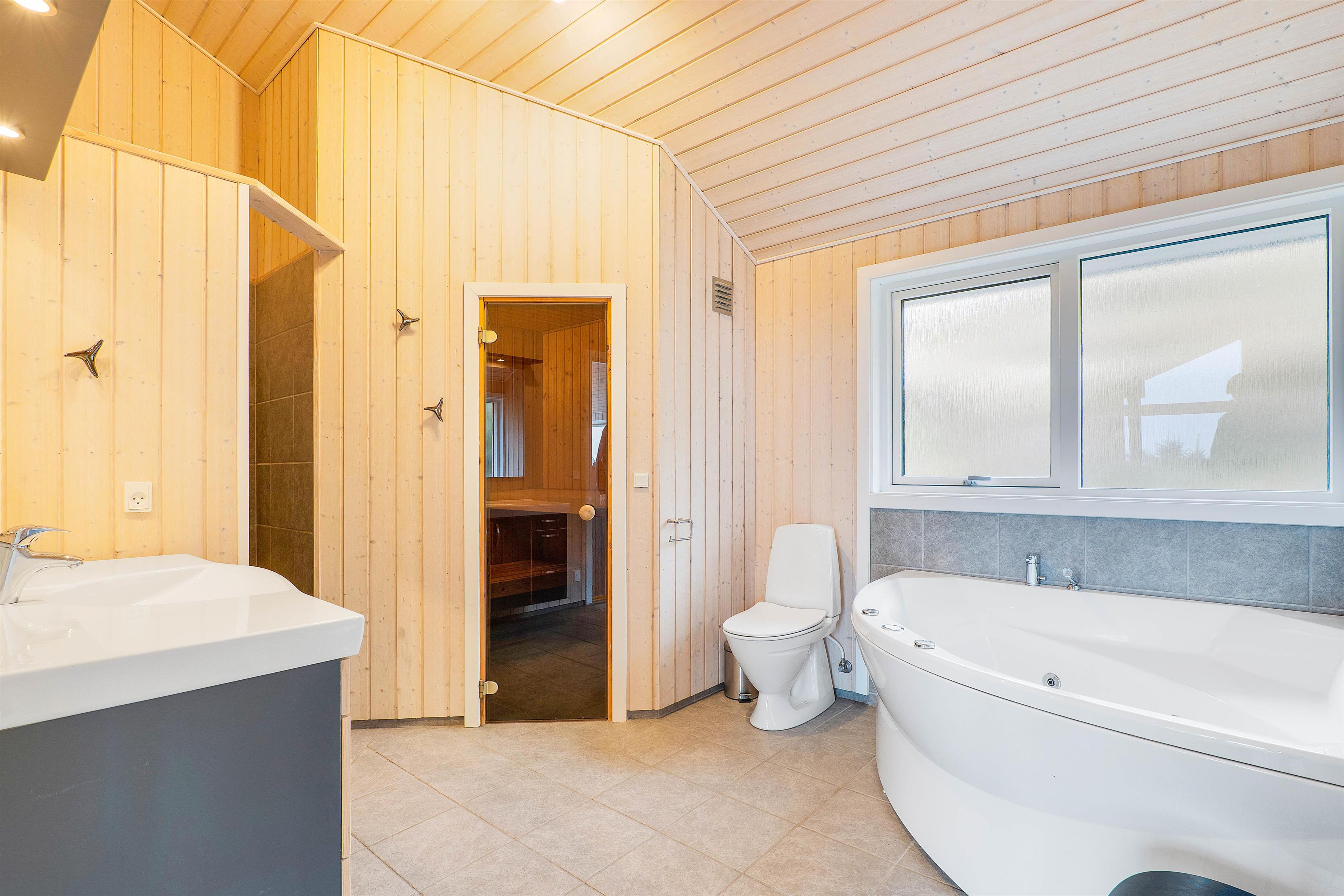 Sommerhuset råder over 2 badeværelser med gulvvarme, hvoraf det ene er udstyret med både spabad og sauna – Så tænd op i saunaen efter en dejlig gåtur ved Vesterhavet og lad varmen trænge helt ind i kroppen, wellness for krop og sjæl.