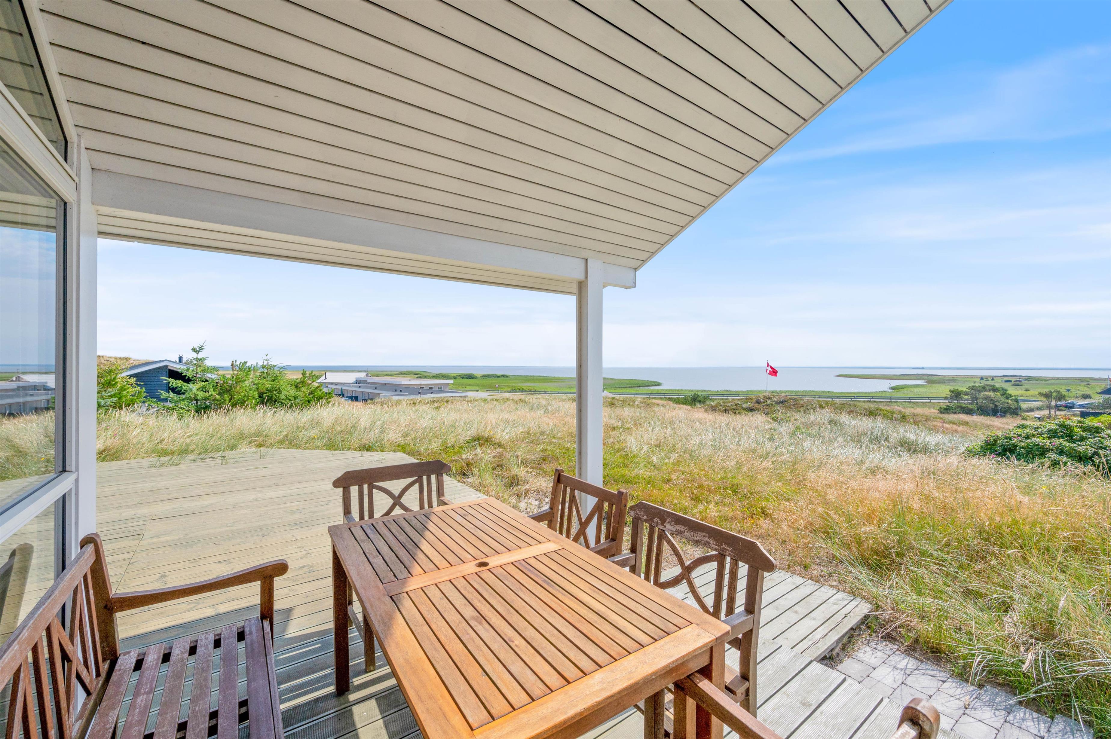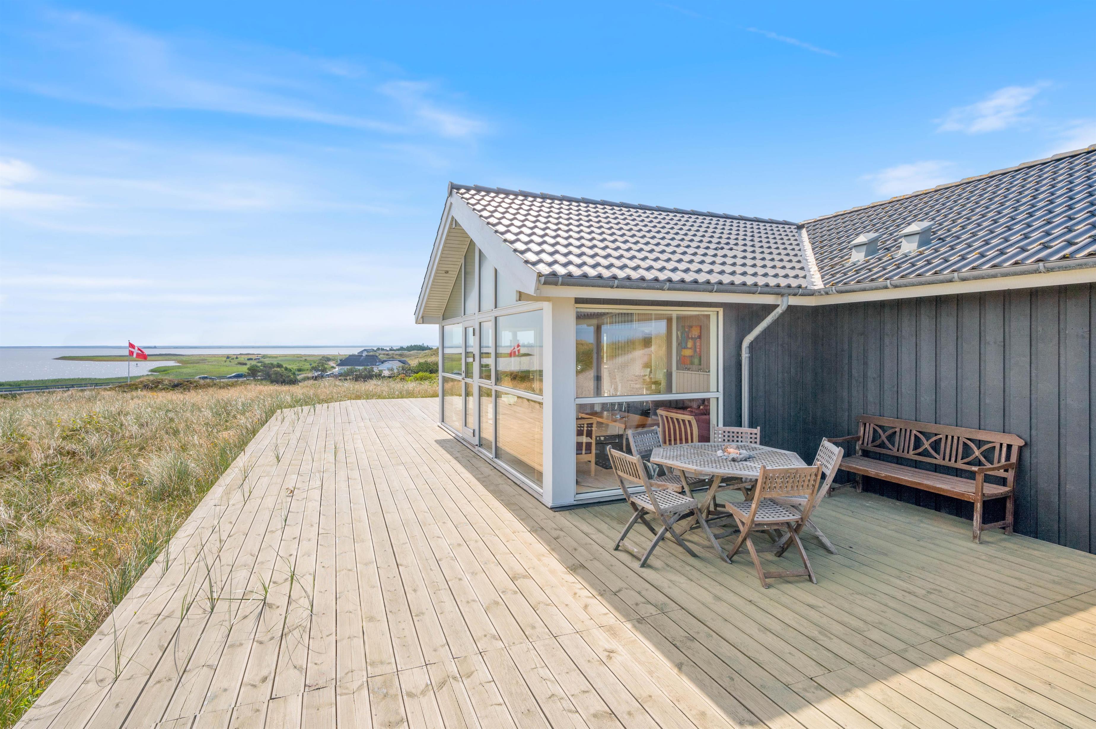 Med en fantastisk udsigt over fjorden kan I finde jer godt tilpas på den delvist overdækkede og afskærmede træterrasse ved sommerhuset. Herfra kan I nyde solens stråler med en frisk kop kaffe ved hånden.