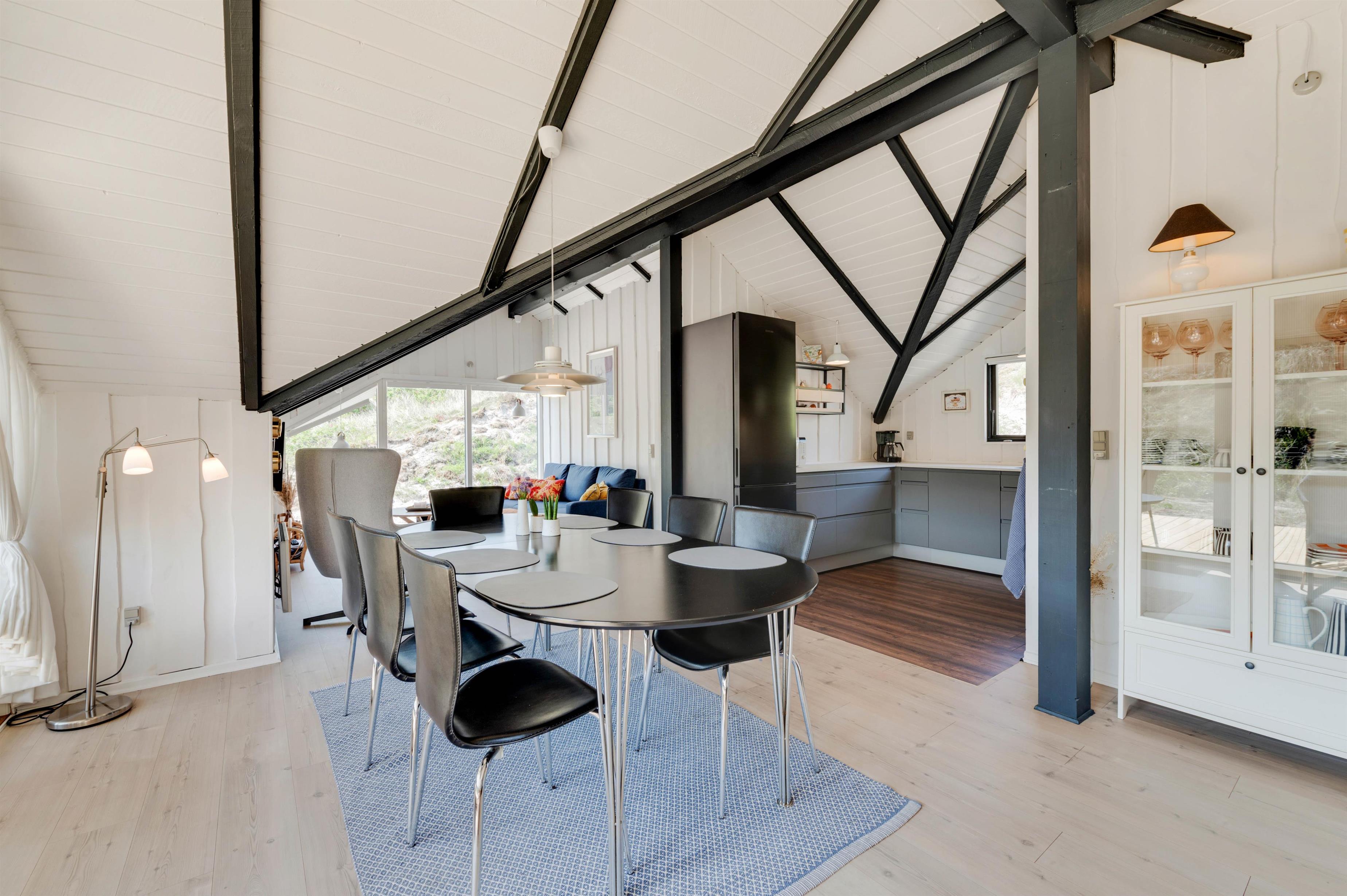 De store vinduespartier mod syd inviterer den smukke og altid vekslende natur helt ind i stuen sammen med masser af sollys og understreger følelsen af ferie. Overalt i feriehuset er der praktiske trægulve eller trælaminat-gulve, og I finder også en vaskemaskine, som måske især småbørnsfamilier vil sætte pris på.