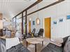 Murstensvæggen bag brændeovnen giver et rustikt indtryk i den rummelige opholdsstue. Alligevel er her en lys og venlig indretning med hvidmalede lofter til kip og et fint lysindfald gennem gulv-til-loft-vinduespartiet. Brændeovnen er placeret mellem spisebordet og sofagruppen, så den spreder mest mulig hygge i rummet. Der er et fint flow fra det åbne køkken til spisebordet og videre hen til sofagruppen, så her i dette sommerhus kan I opholde jer med forskellige aktiviteter, og alligevel have fokus på fællesskabet og feriestemningen. En energibesparende varmepumpe hjælper til med opvarmningen.