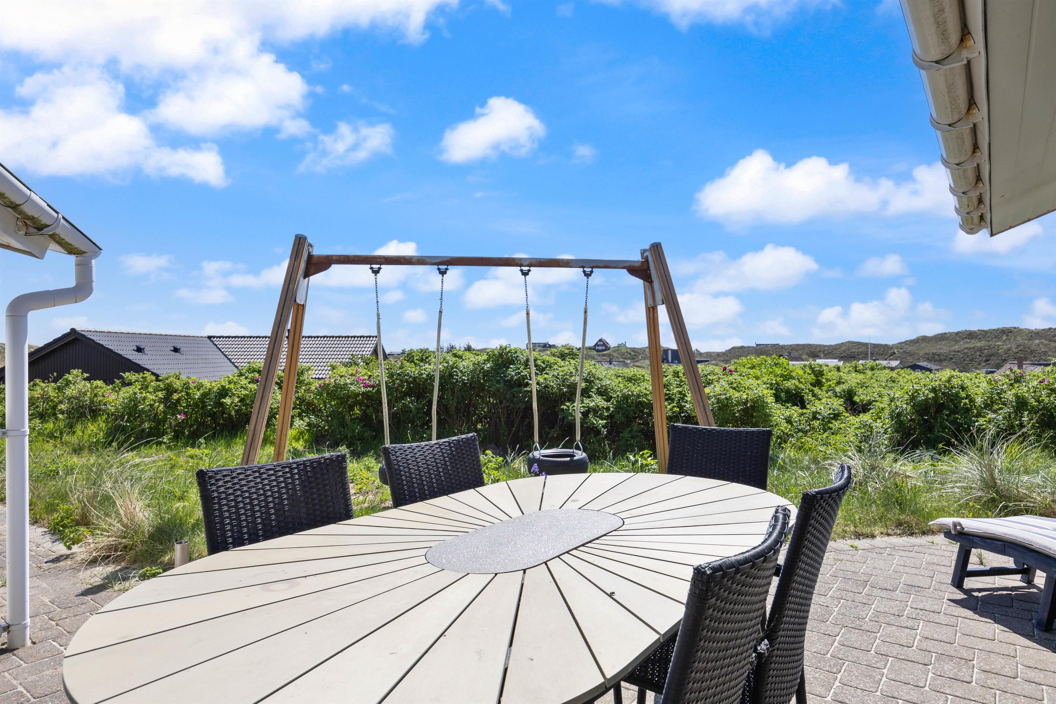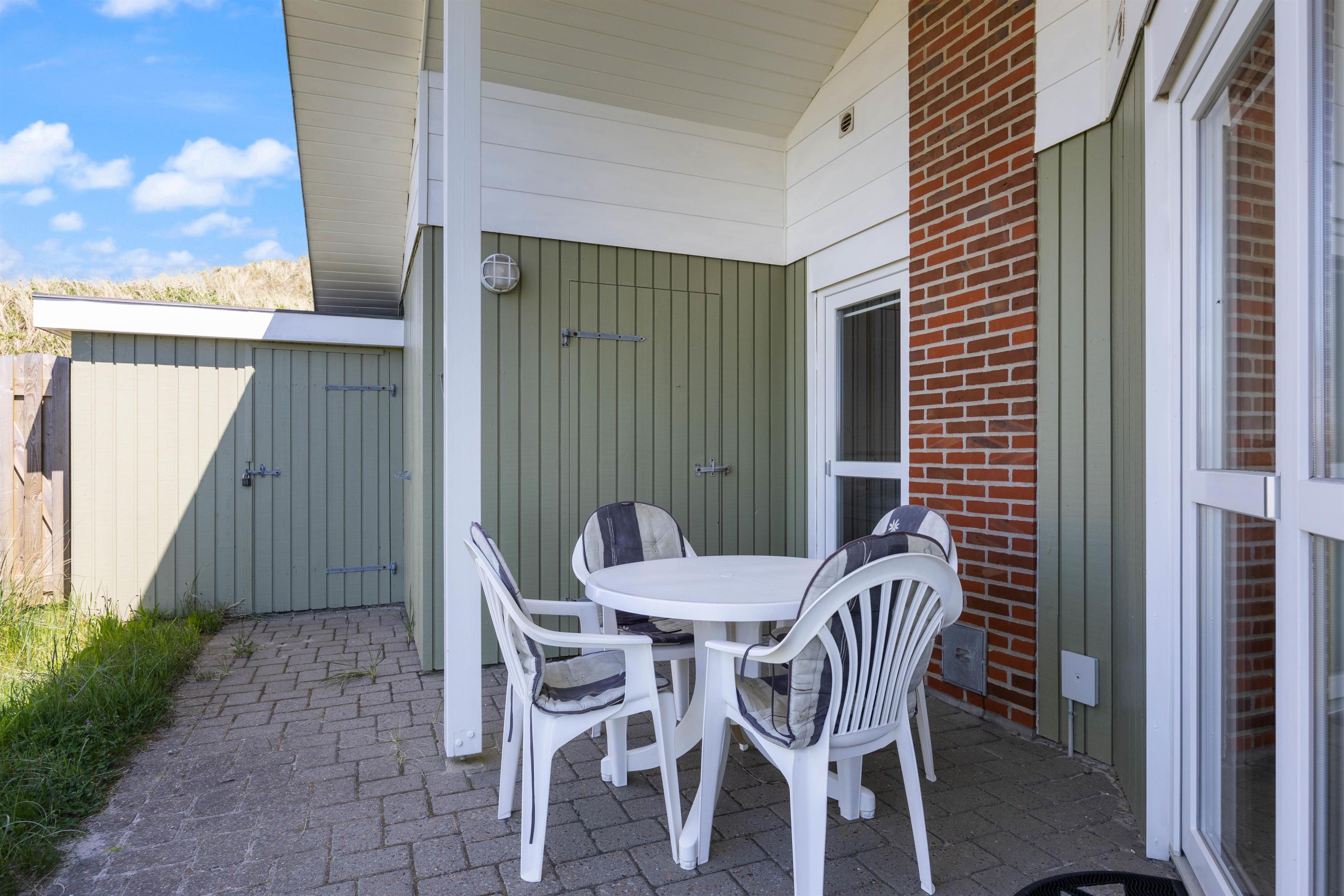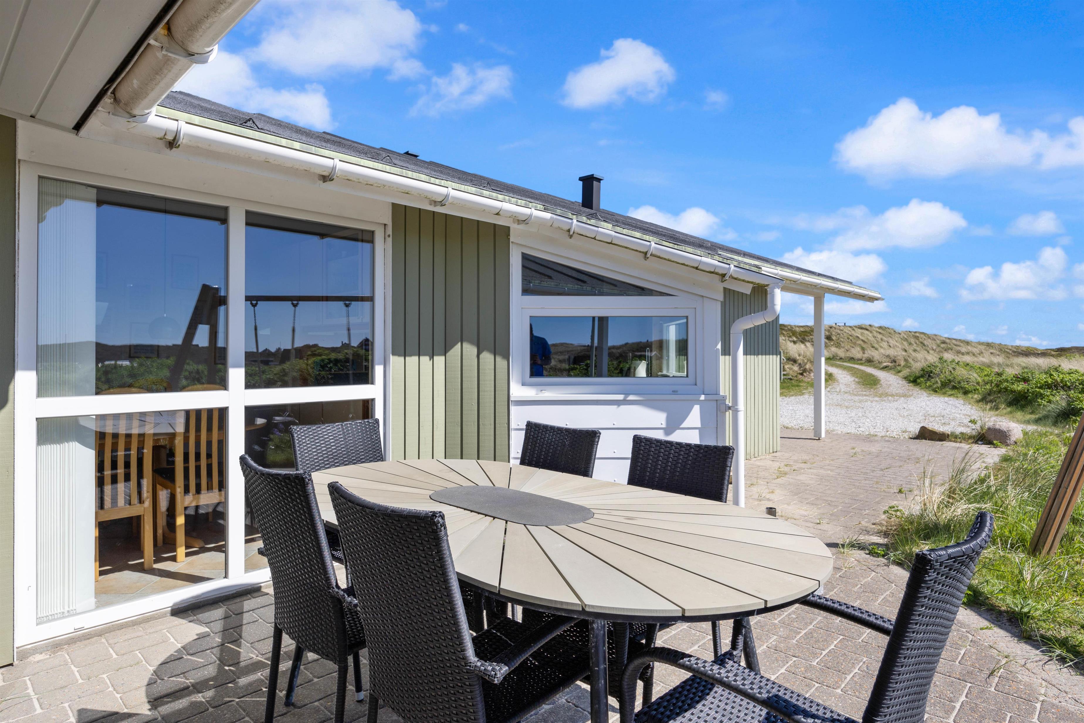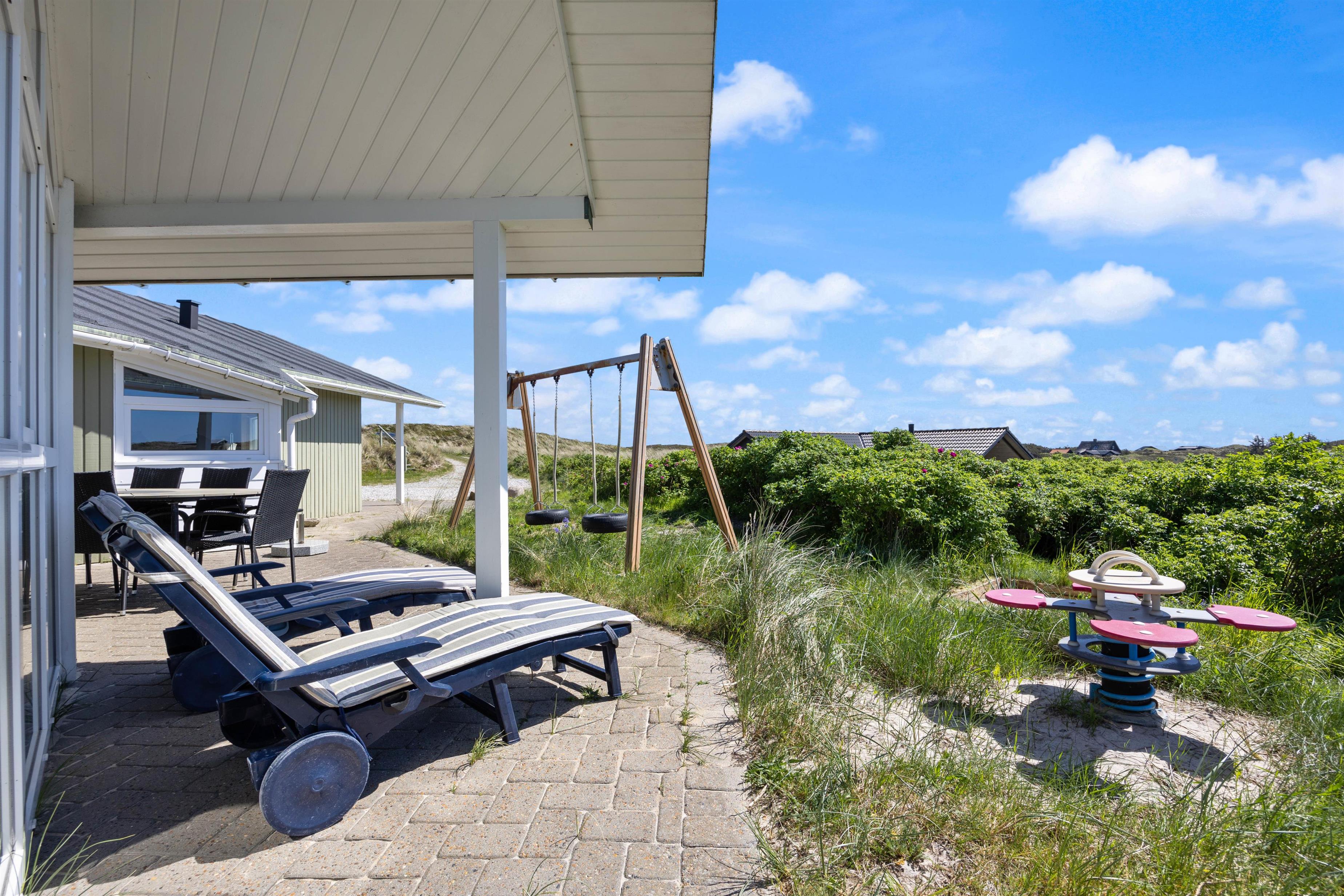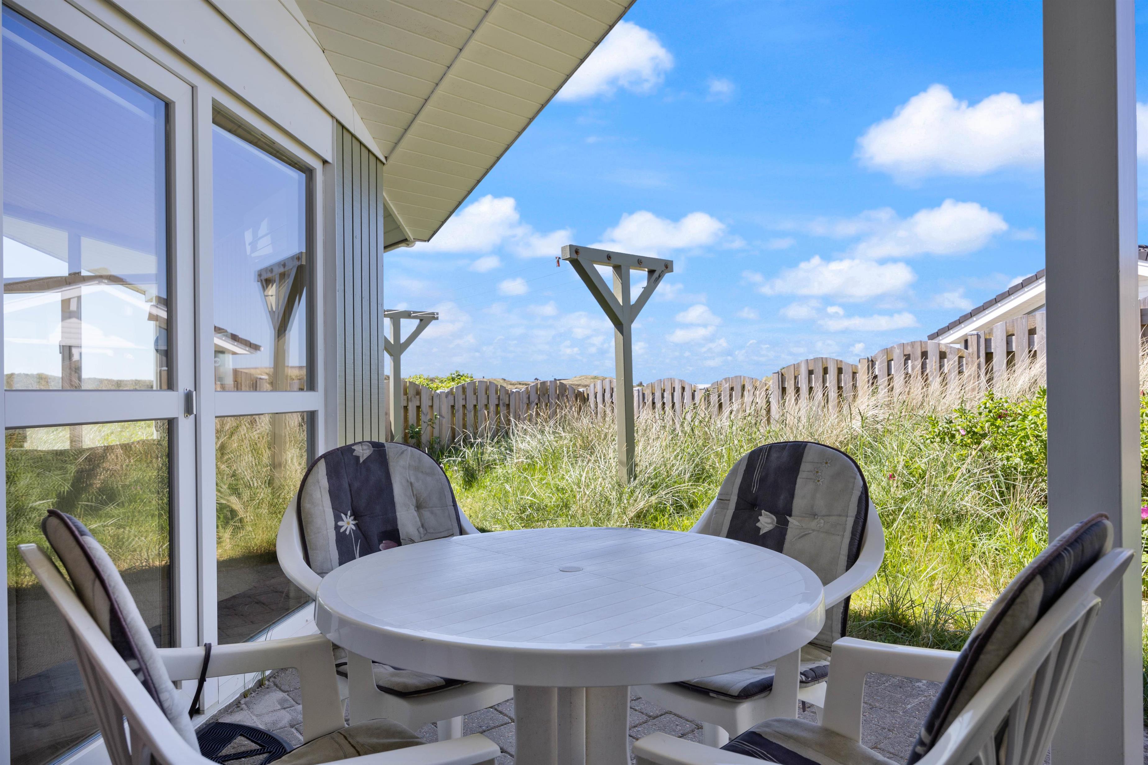 På den afskærmede og lukkede terrasse på Sønder Klitvej 184 kan du altid finde en lækrog til at læse en god bog eller bare slappe af i den friske luft. Du kan benytte havemøblerne til solbadning, eller I kan spise nogle af måltiderne udendørs. Om aftenen kan I samles ved grillen og tilberede et lækkert måltid der. Efter maden fristes nogle måske til en frisk gåtur til havet og en dukkert, mens andre nyder et køligt glas vin, imens solen går ned.