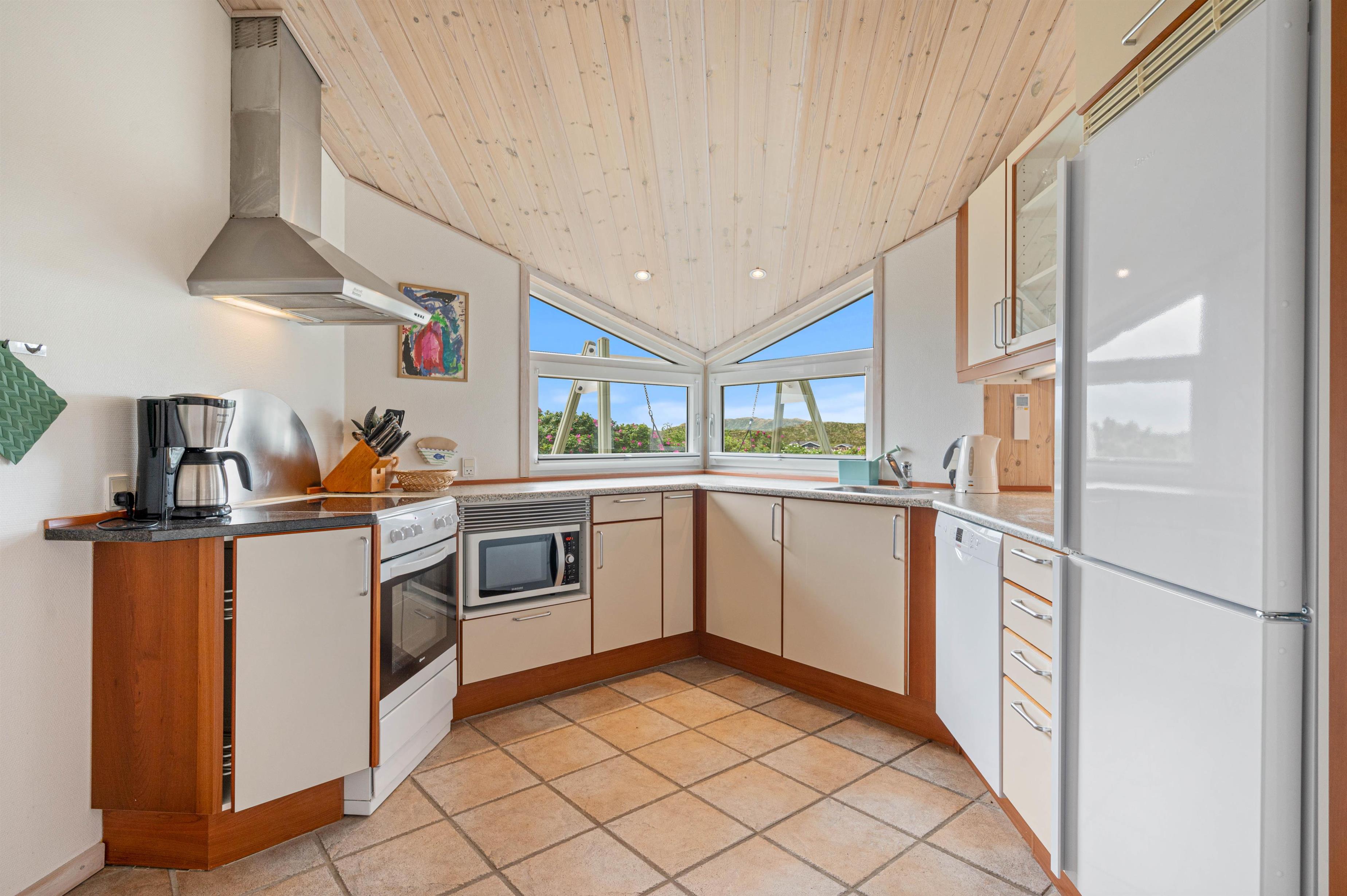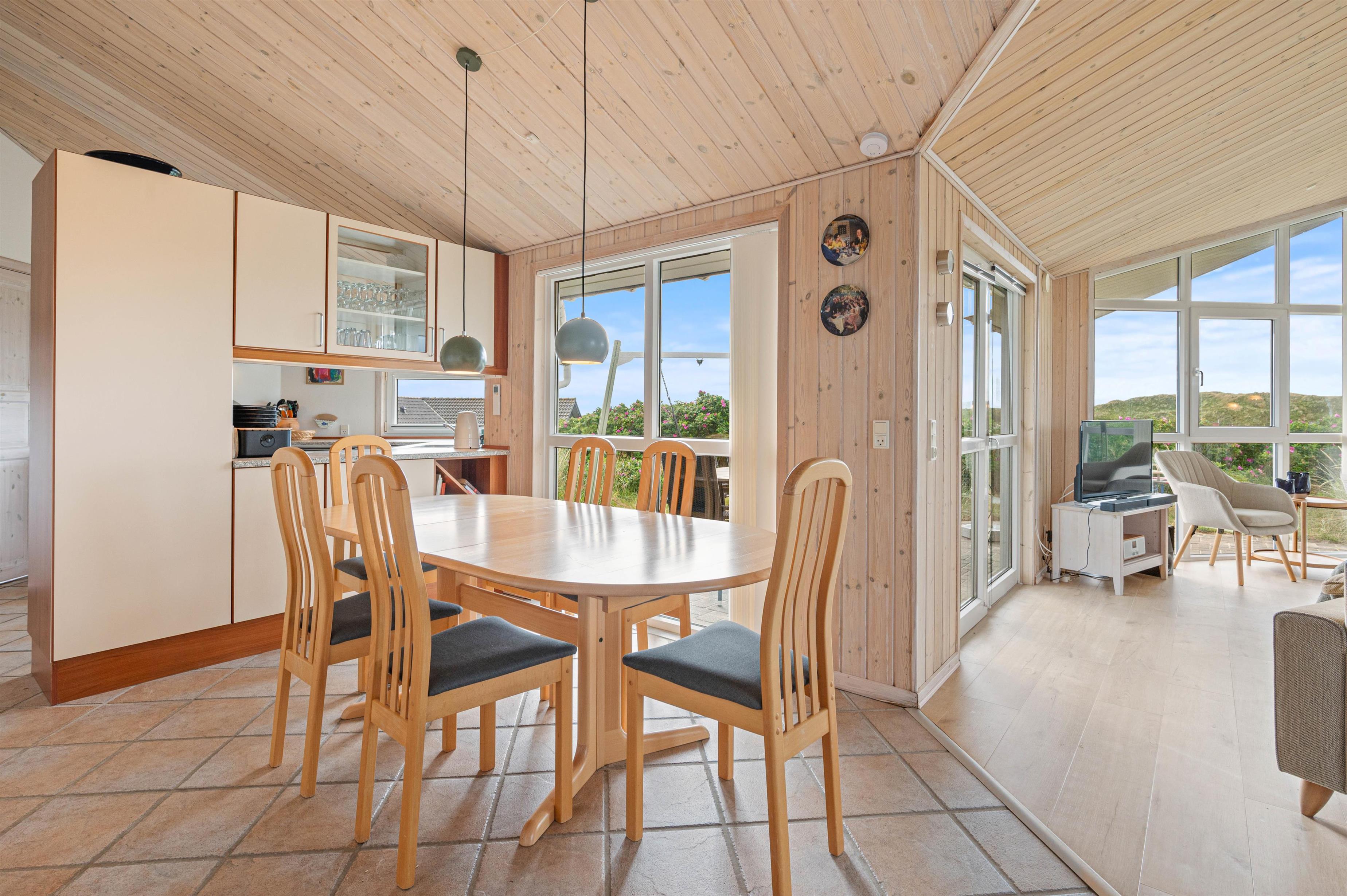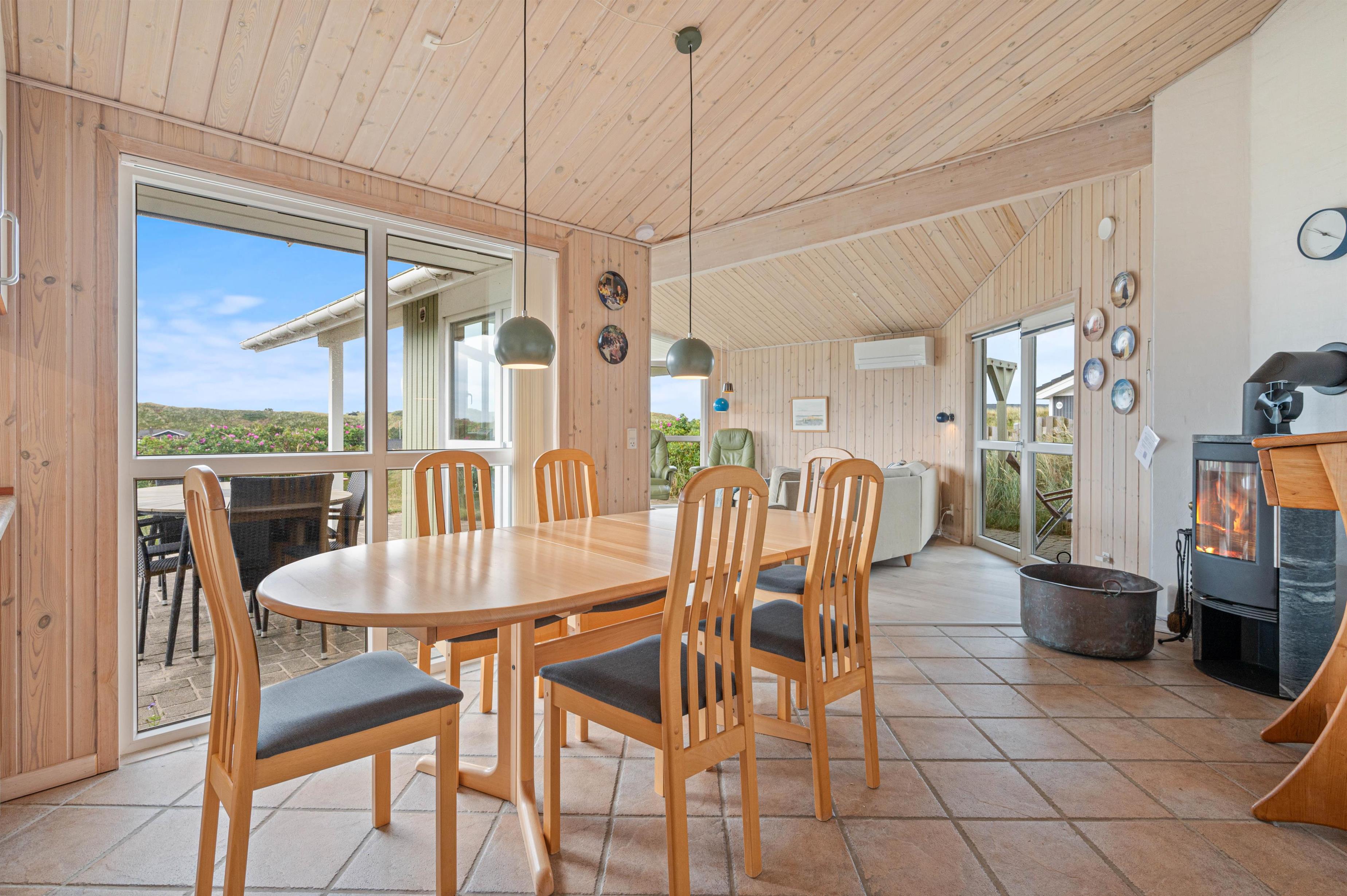 Indendørs finder du køkken/alrum med opvaskemaskine, åbent i forbindelse med stue. Her kan I sammen tilberede et lækkert måltid, spise det ved spisebordet og spille et brætspil bagefter. Eller I kan samles i sofagruppen ved varmen fra brændeovnen. Det fine lysindfald fra det store vinduesparti giver stuen masser af lys, og her kan I også holde øje med, hvad der sker på terrassen.
