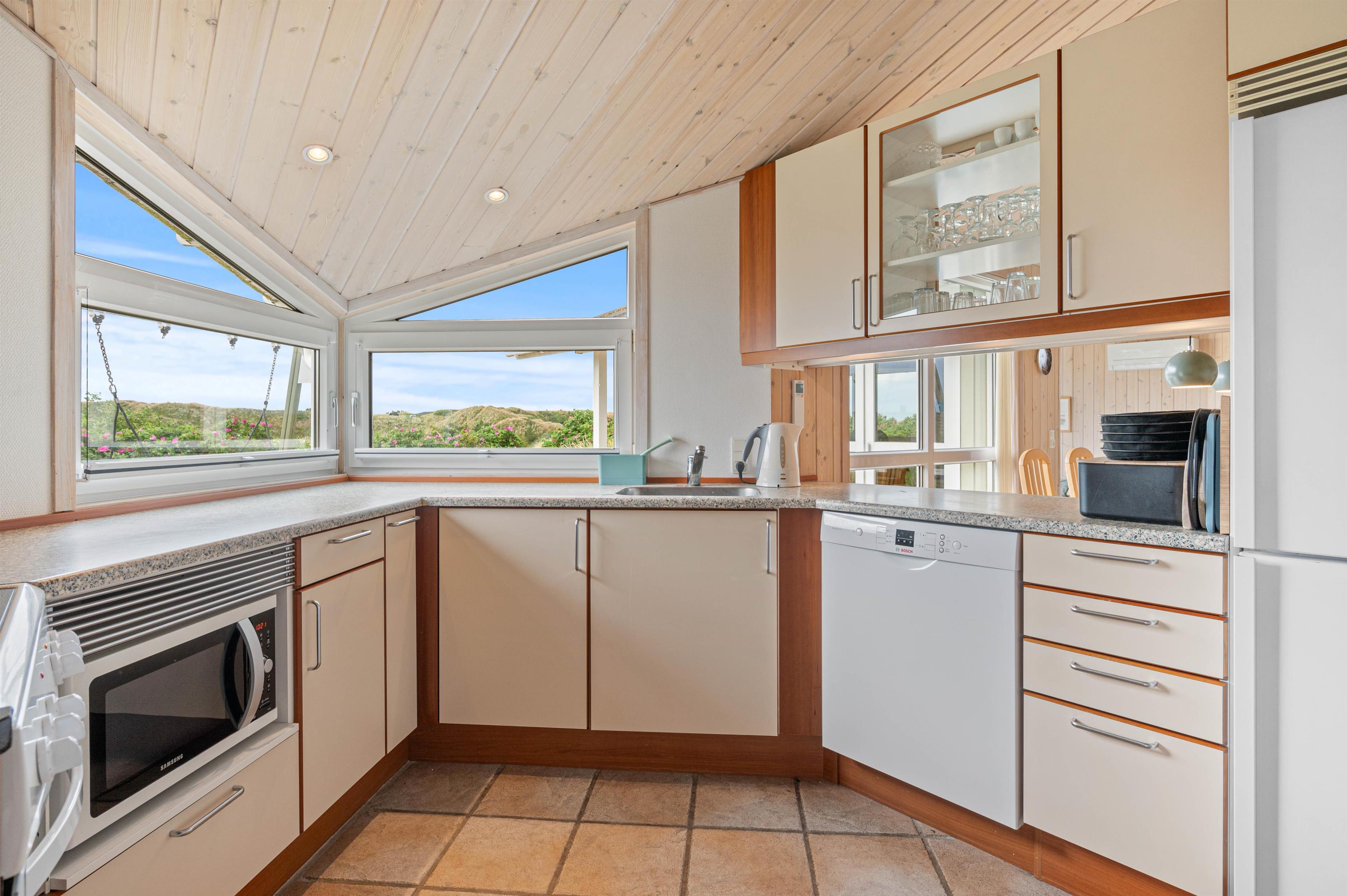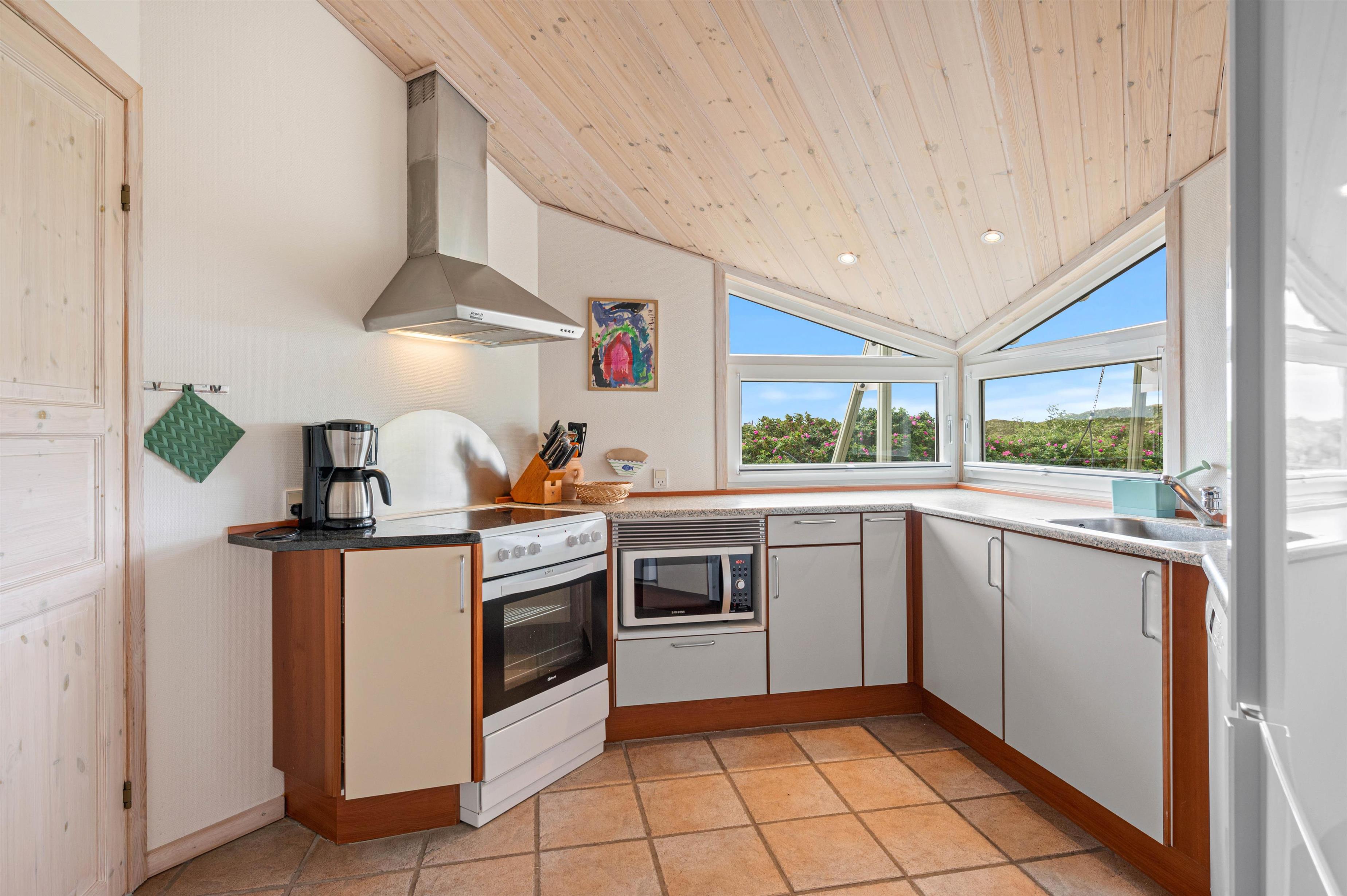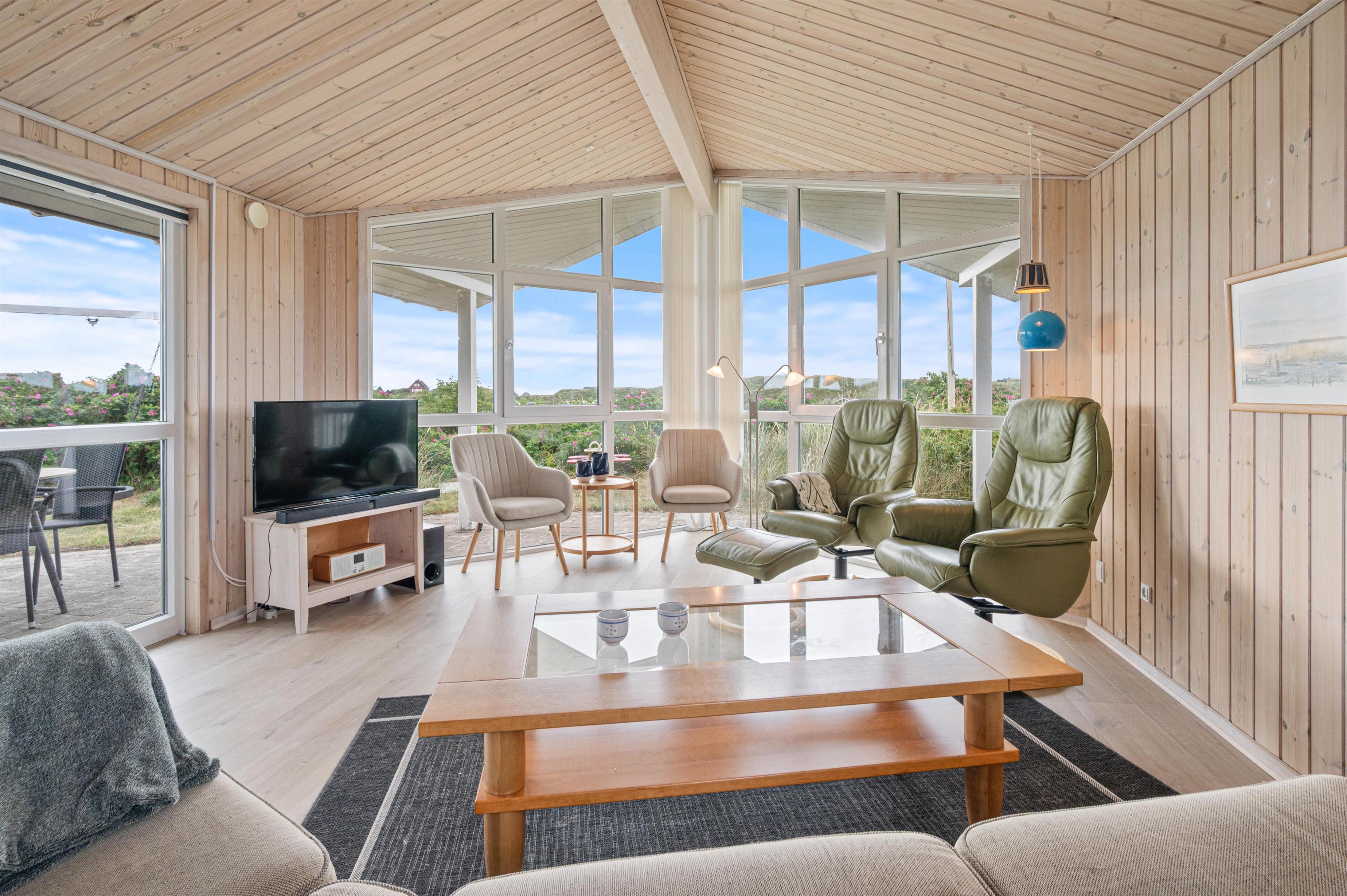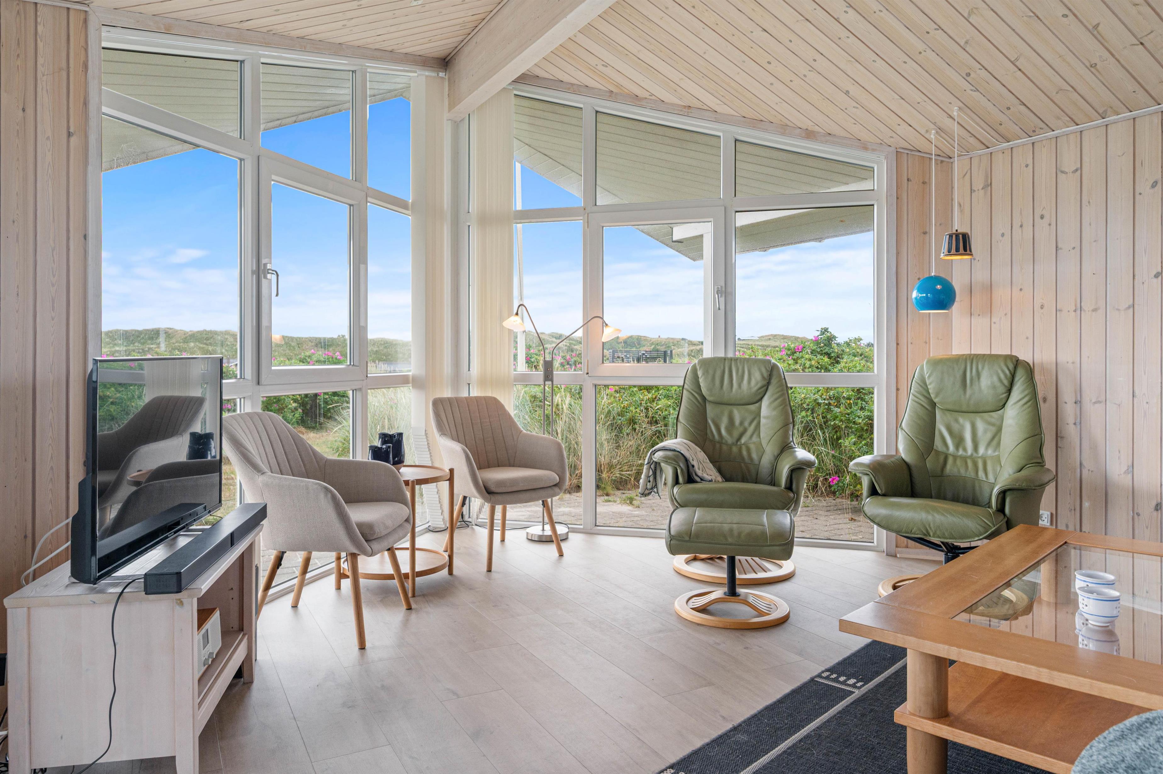 Indendørs finder du køkken/alrum med opvaskemaskine, åbent i forbindelse med stue. Her kan I sammen tilberede et lækkert måltid, spise det ved spisebordet og spille et brætspil bagefter. Eller I kan samles i sofagruppen ved varmen fra brændeovnen. Det fine lysindfald fra det store vinduesparti giver stuen masser af lys, og her kan I også holde øje med, hvad der sker på terrassen.