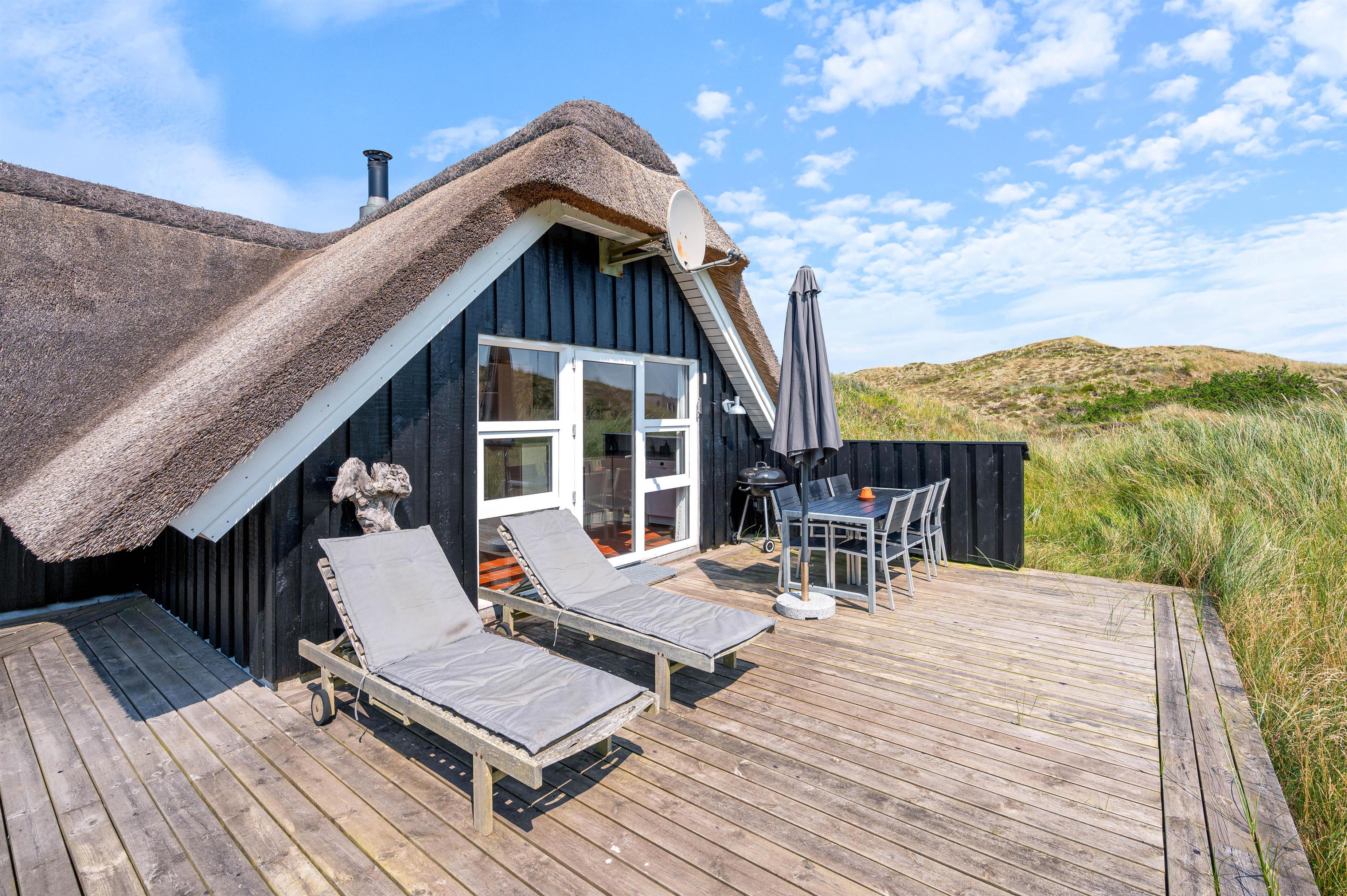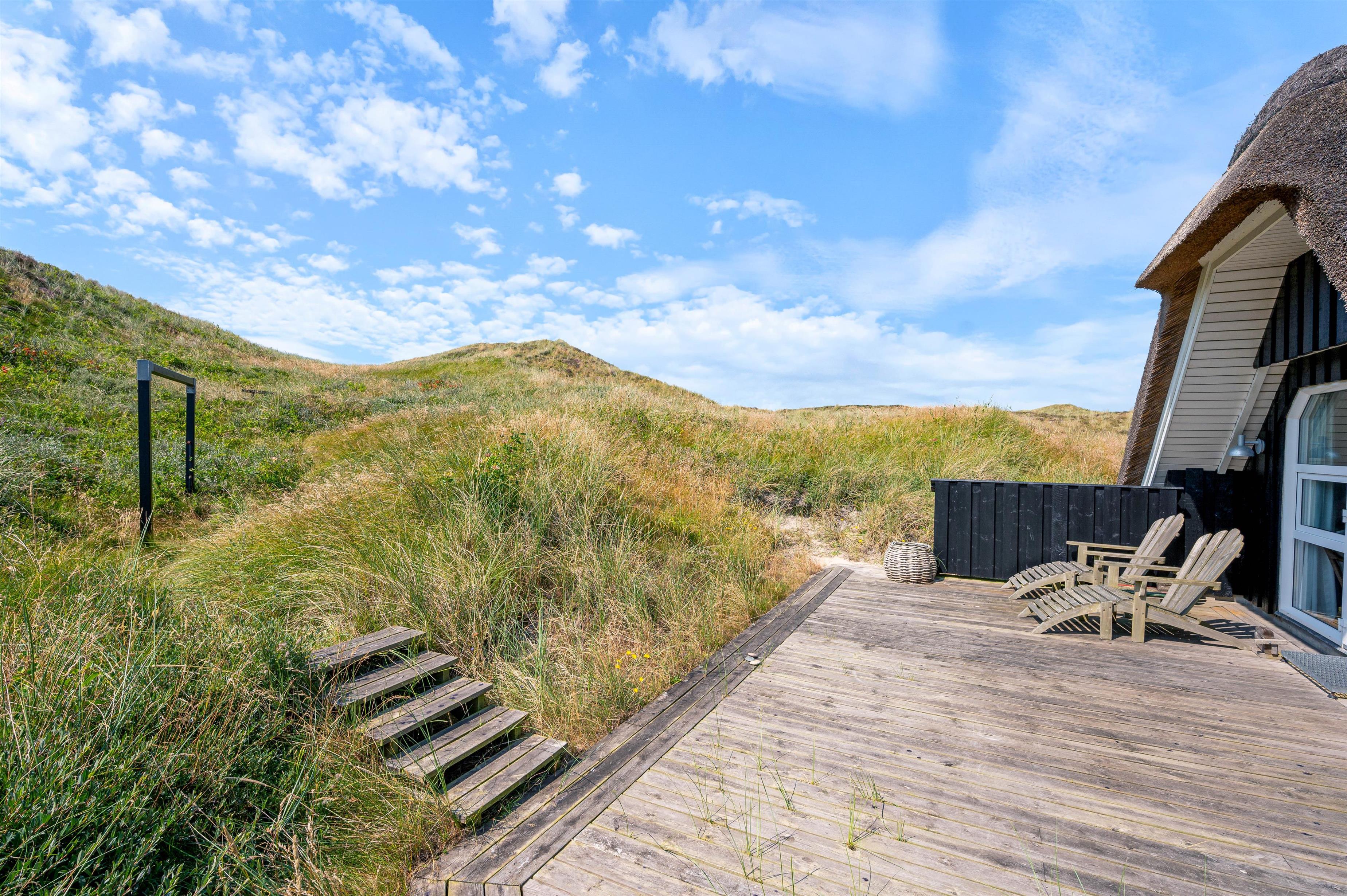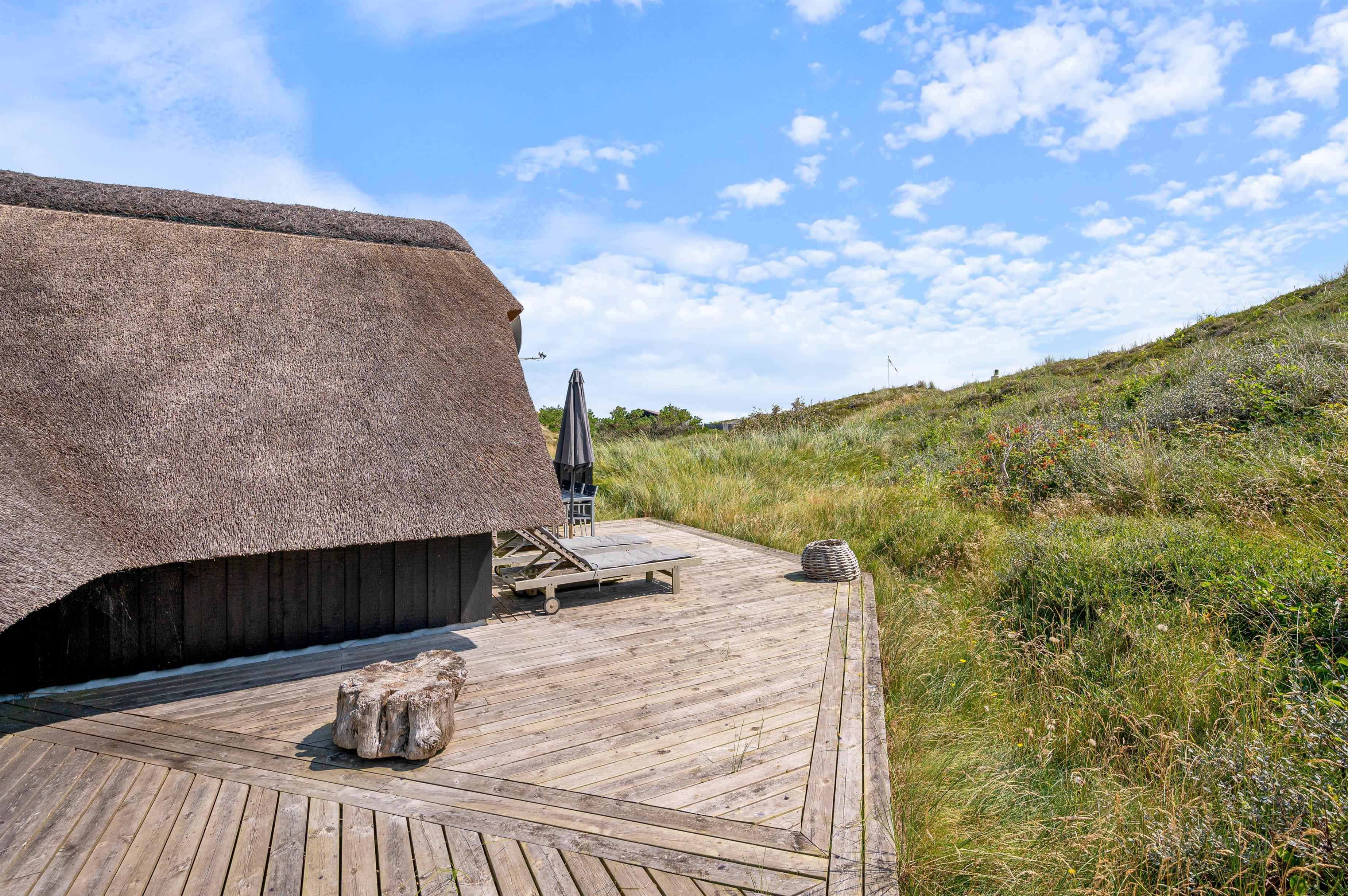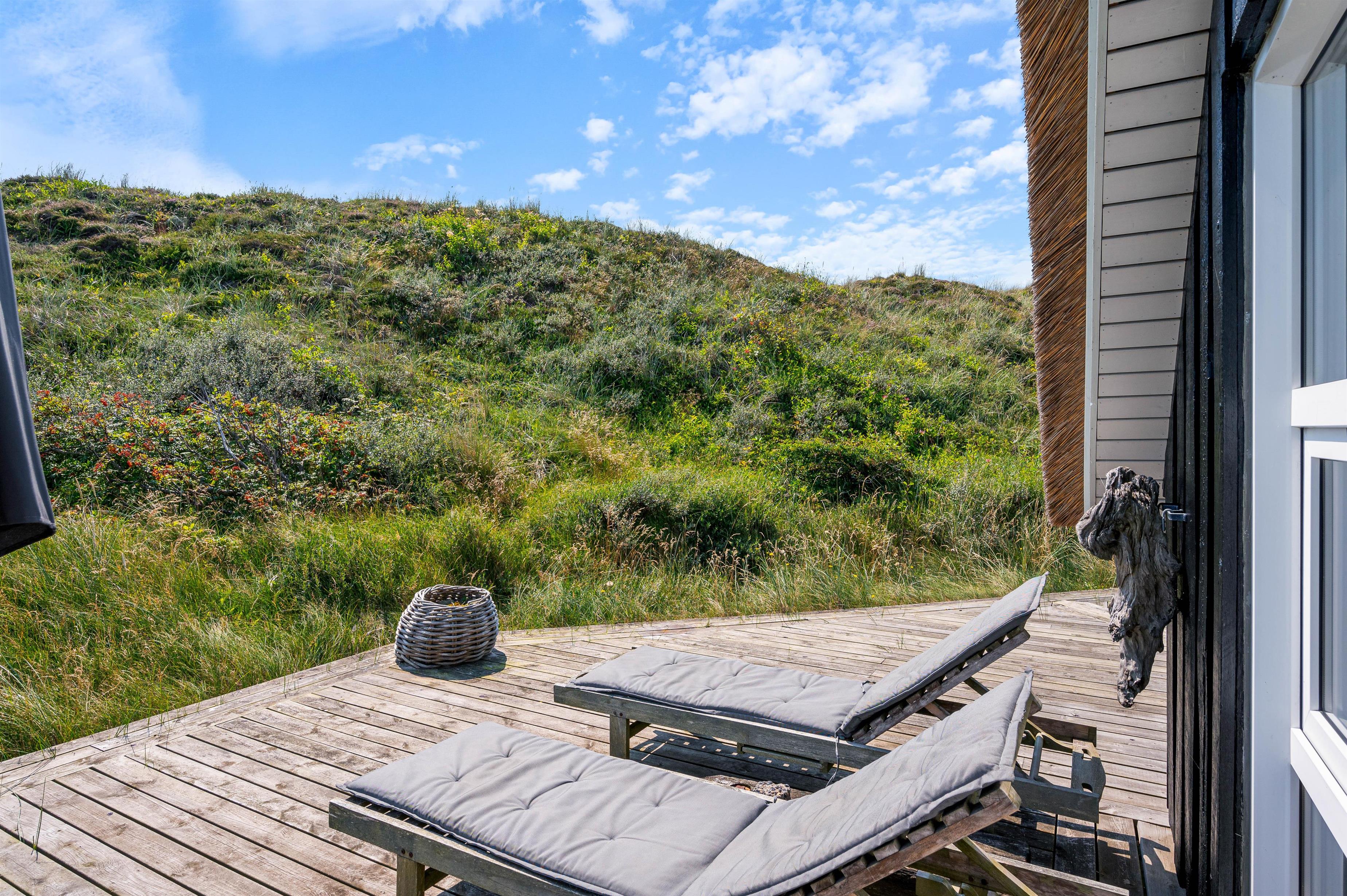 Feriehuset har en unik beliggenhed på en kuperet klitgrund, hvor omkringliggende klitter sørger for både læ og privatliv. På feriehusets sydvestlige side er der anlagt en stor terrasse med flere lækroge. På denne måde kan I sidde ude og nyde morgenkaffen, de smukke omgivelser eller de solrige dage, hvor liggestolen kalder. Også her kan I nyde skønne grillaftner med familie og venner.