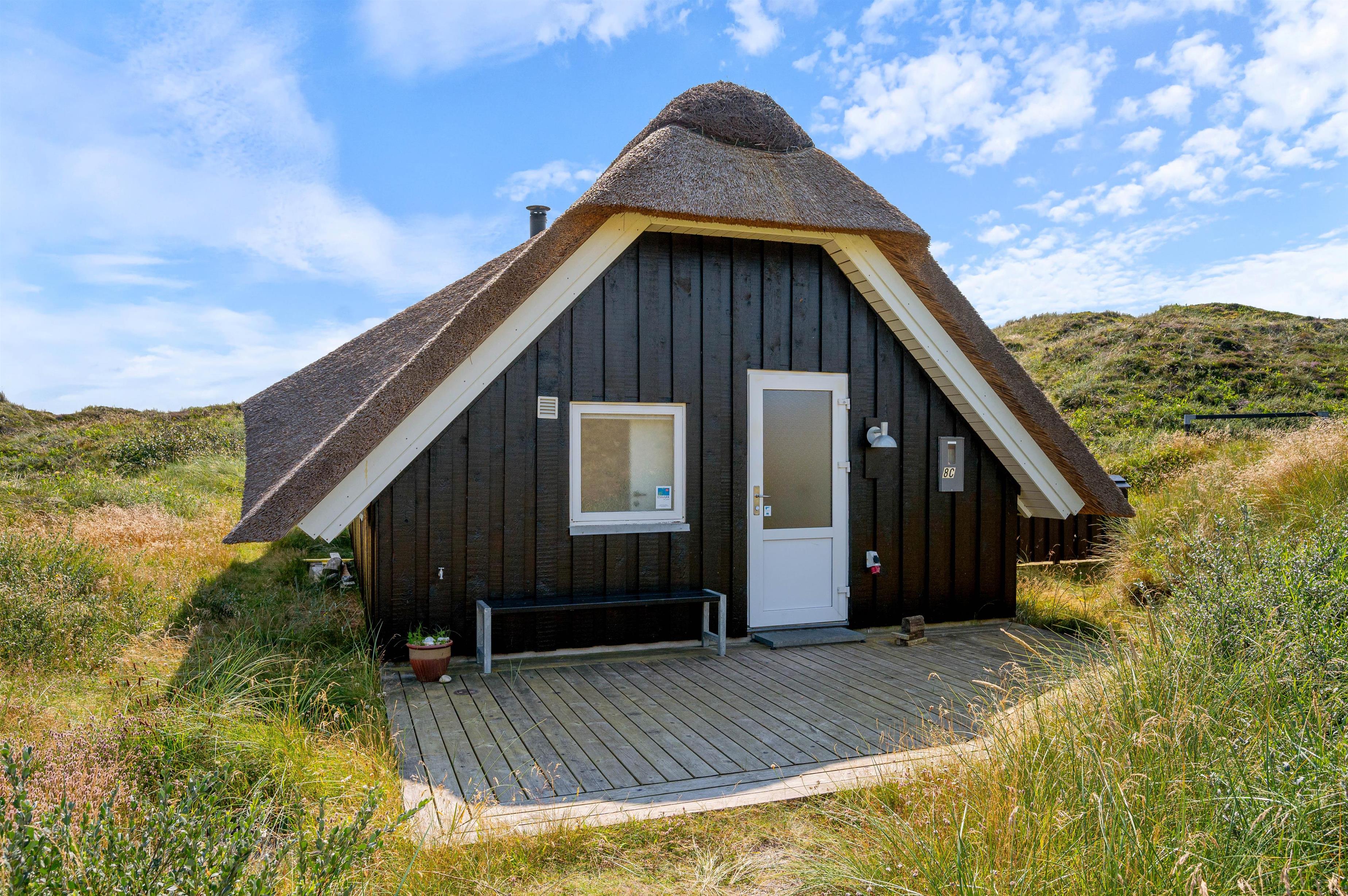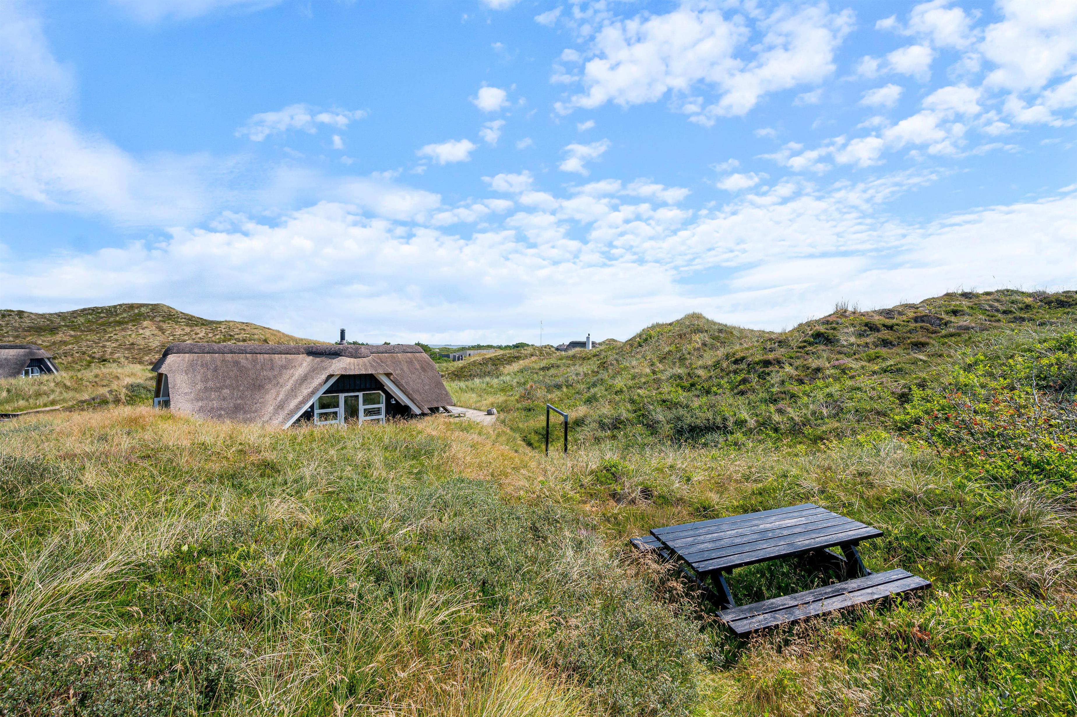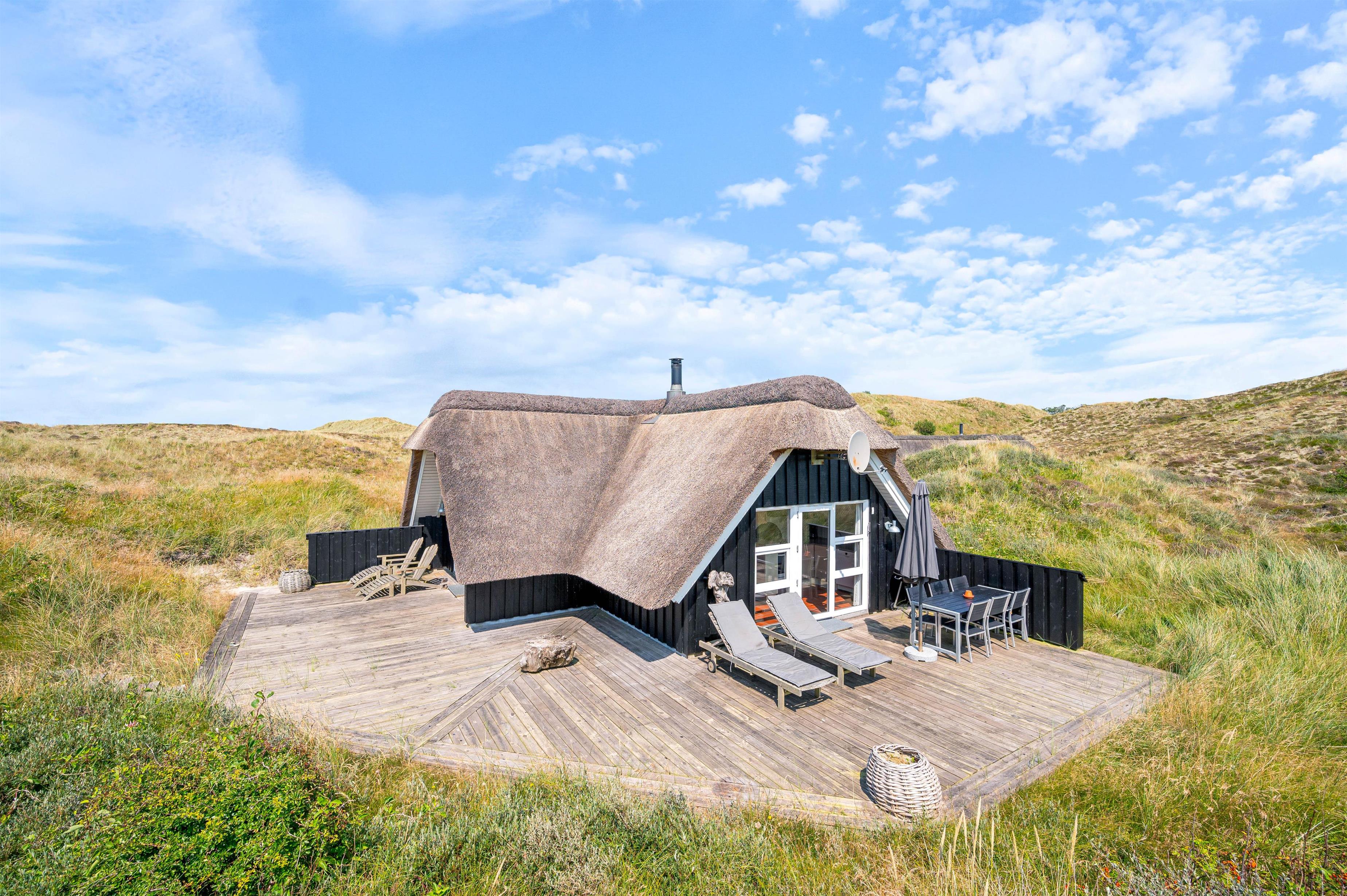 Feriehuset har en unik beliggenhed på en kuperet klitgrund, hvor omkringliggende klitter sørger for både læ og privatliv. På feriehusets sydvestlige side er der anlagt en stor terrasse med flere lækroge. På denne måde kan I sidde ude og nyde morgenkaffen, de smukke omgivelser eller de solrige dage, hvor liggestolen kalder. Også her kan I nyde skønne grillaftner med familie og venner.