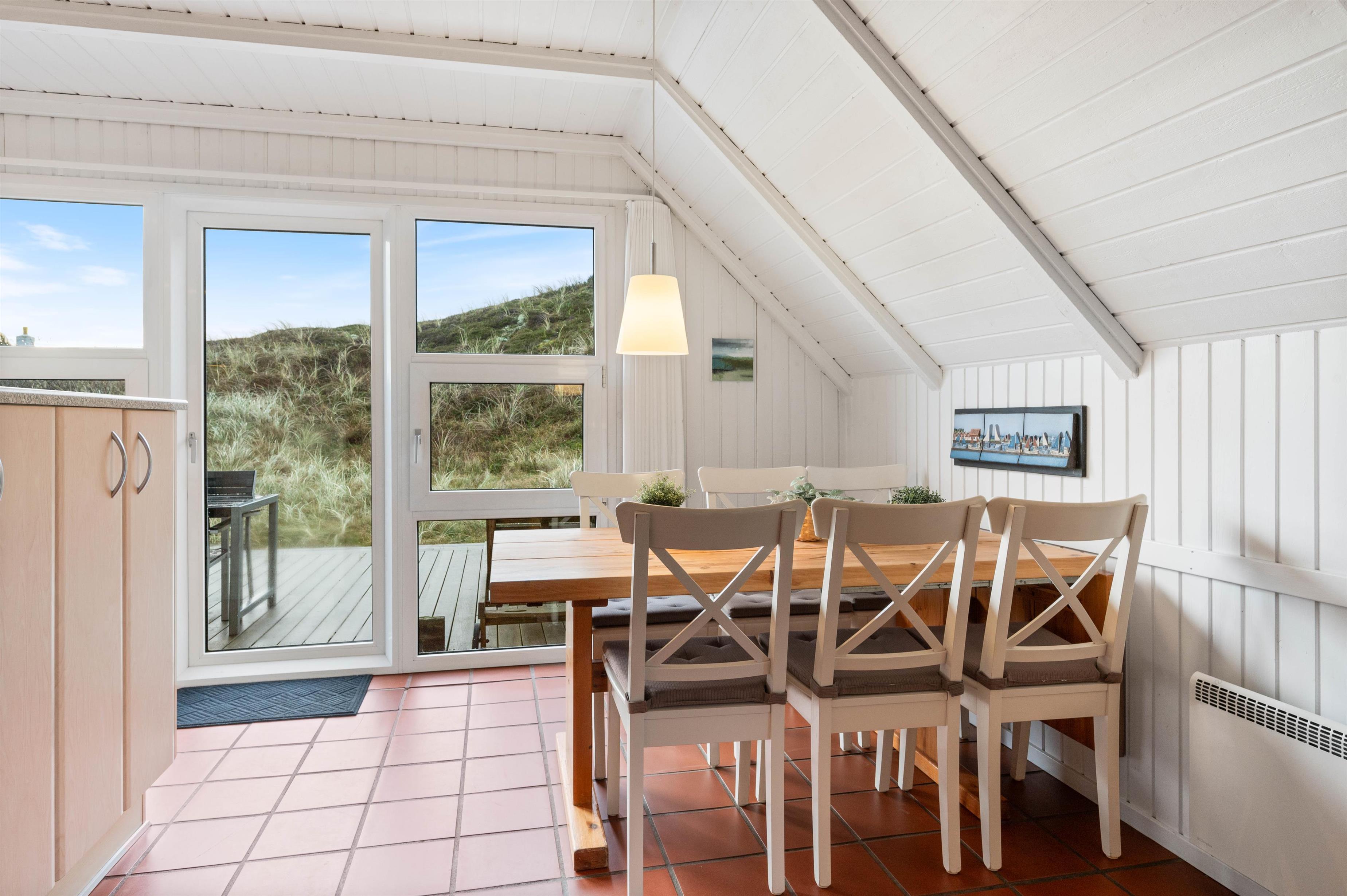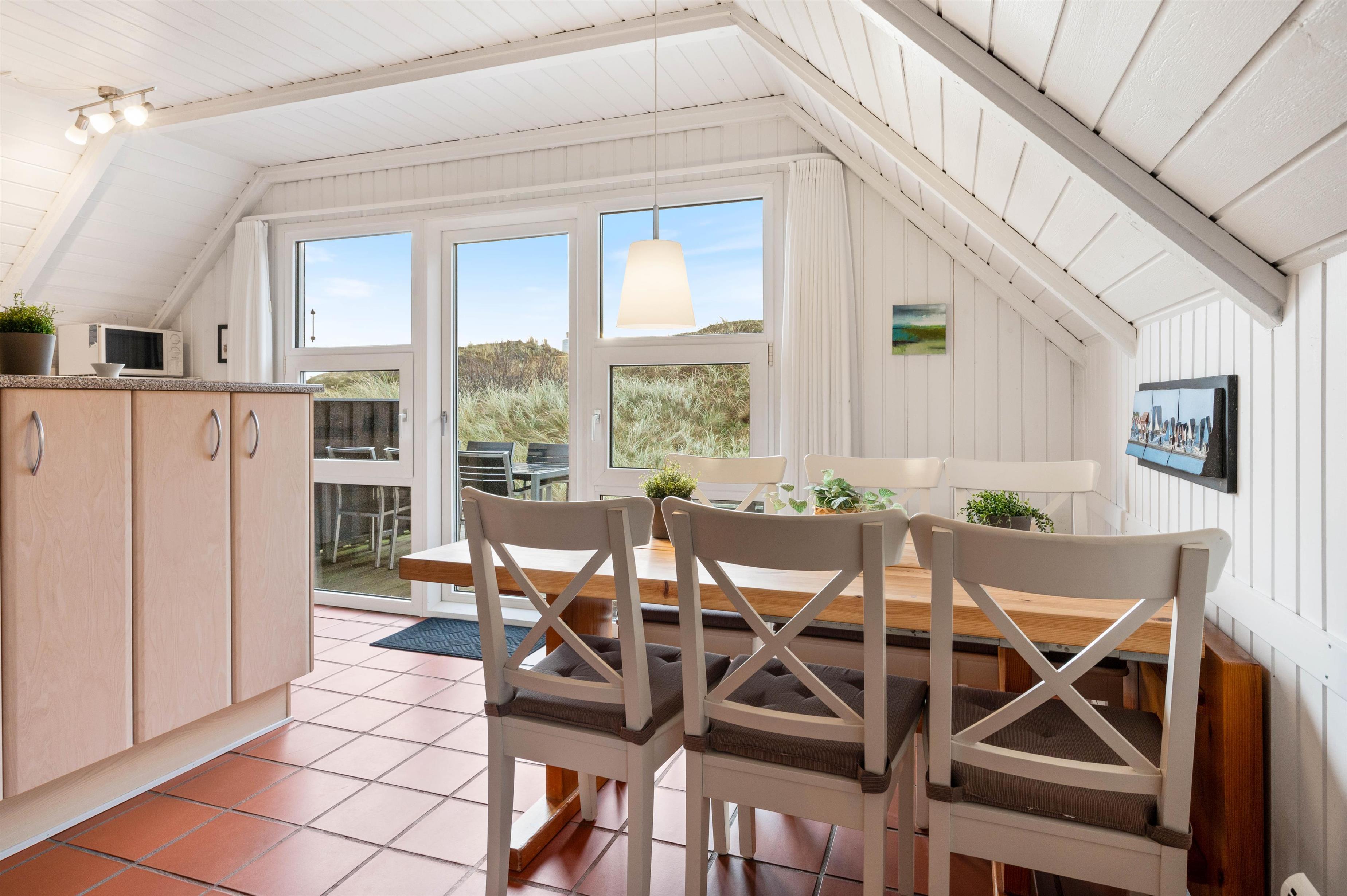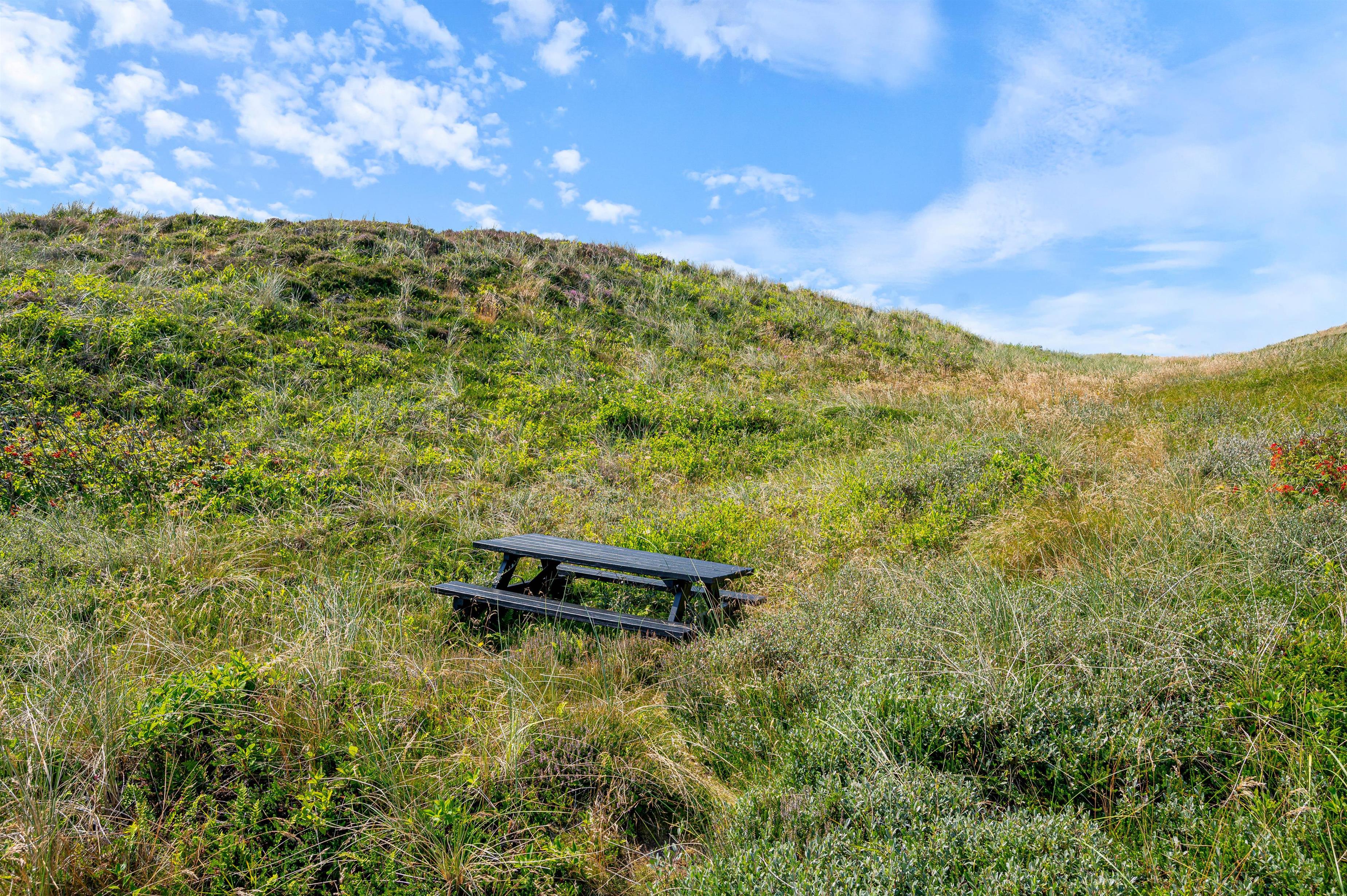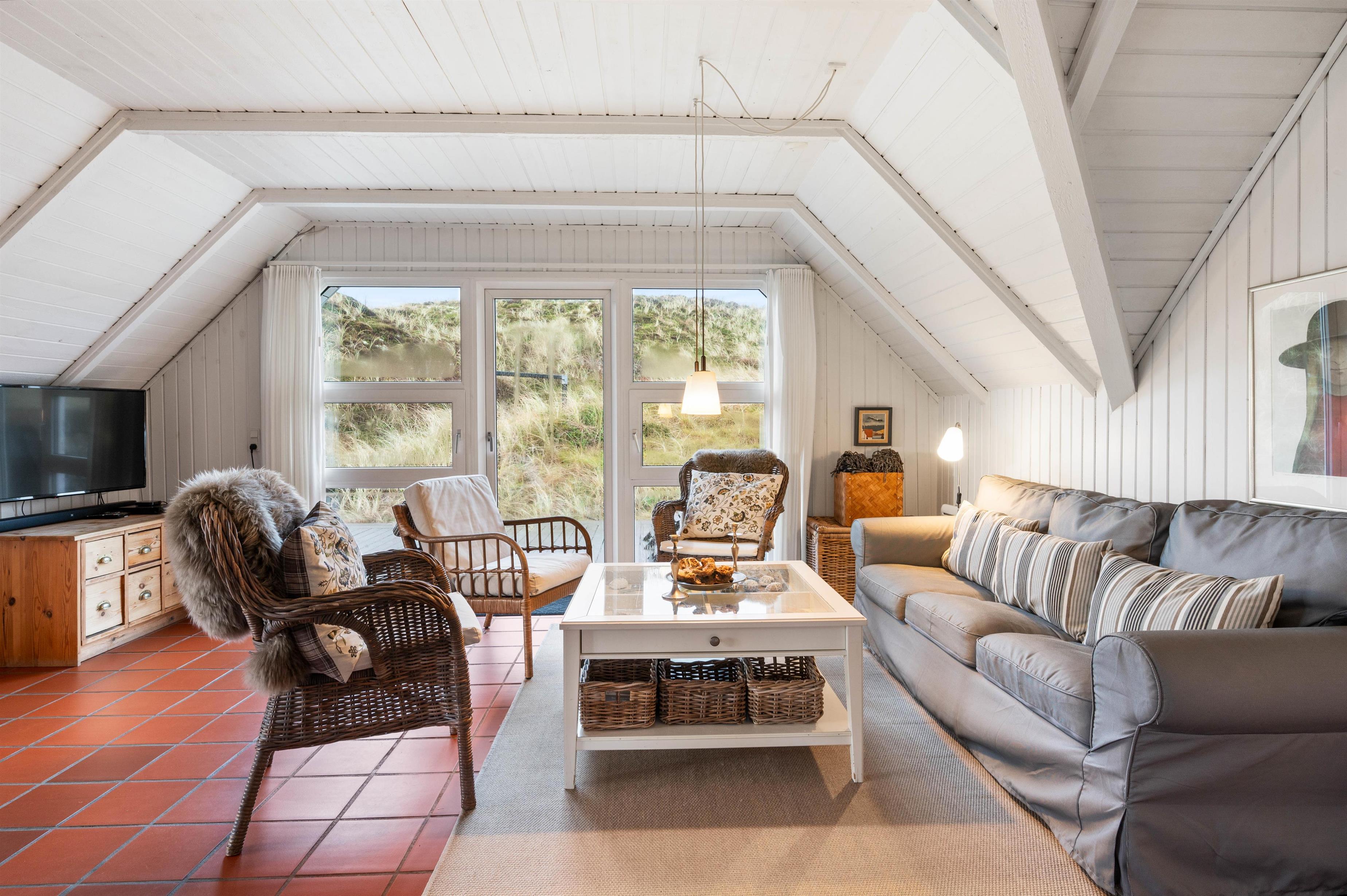 Feriehuset har en unik beliggenhed på en kuperet klitgrund, hvor omkringliggende klitter sørger for både læ og privatliv. På feriehusets sydvestlige side er der anlagt en stor terrasse med flere lækroge. På denne måde kan I sidde ude og nyde morgenkaffen, de smukke omgivelser eller de solrige dage, hvor liggestolen kalder. Også her kan I nyde skønne grillaftner med familie og venner.