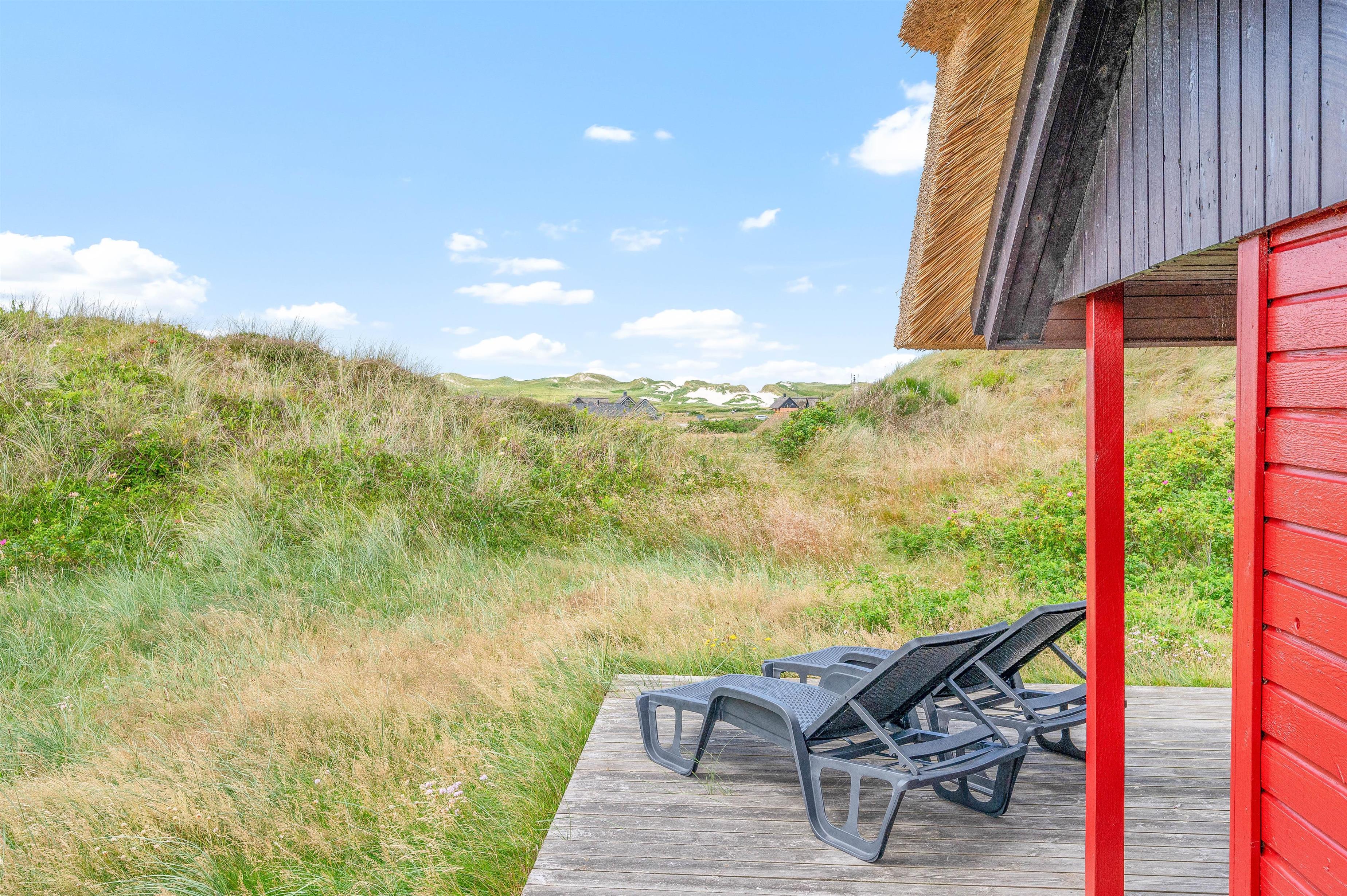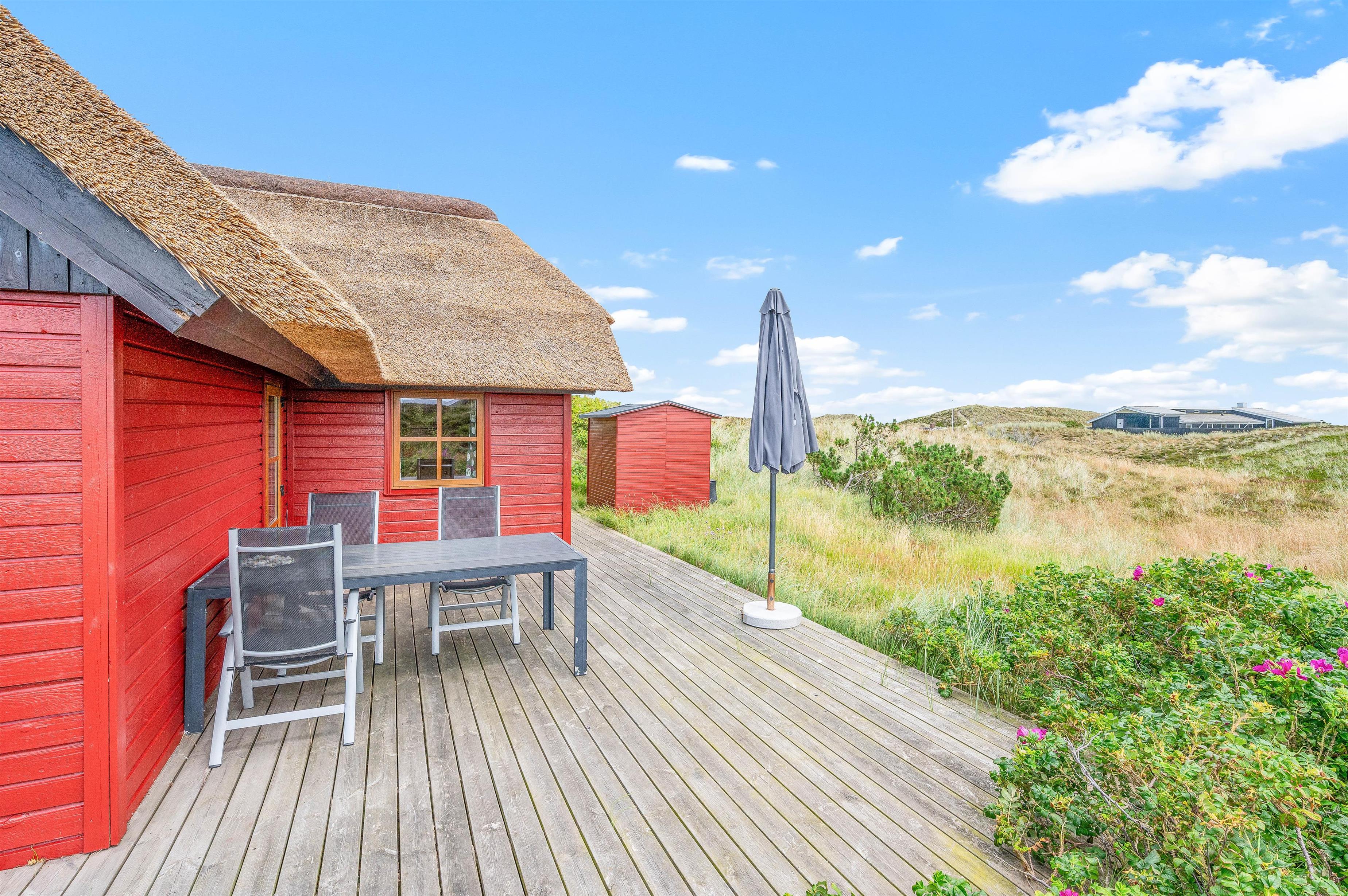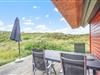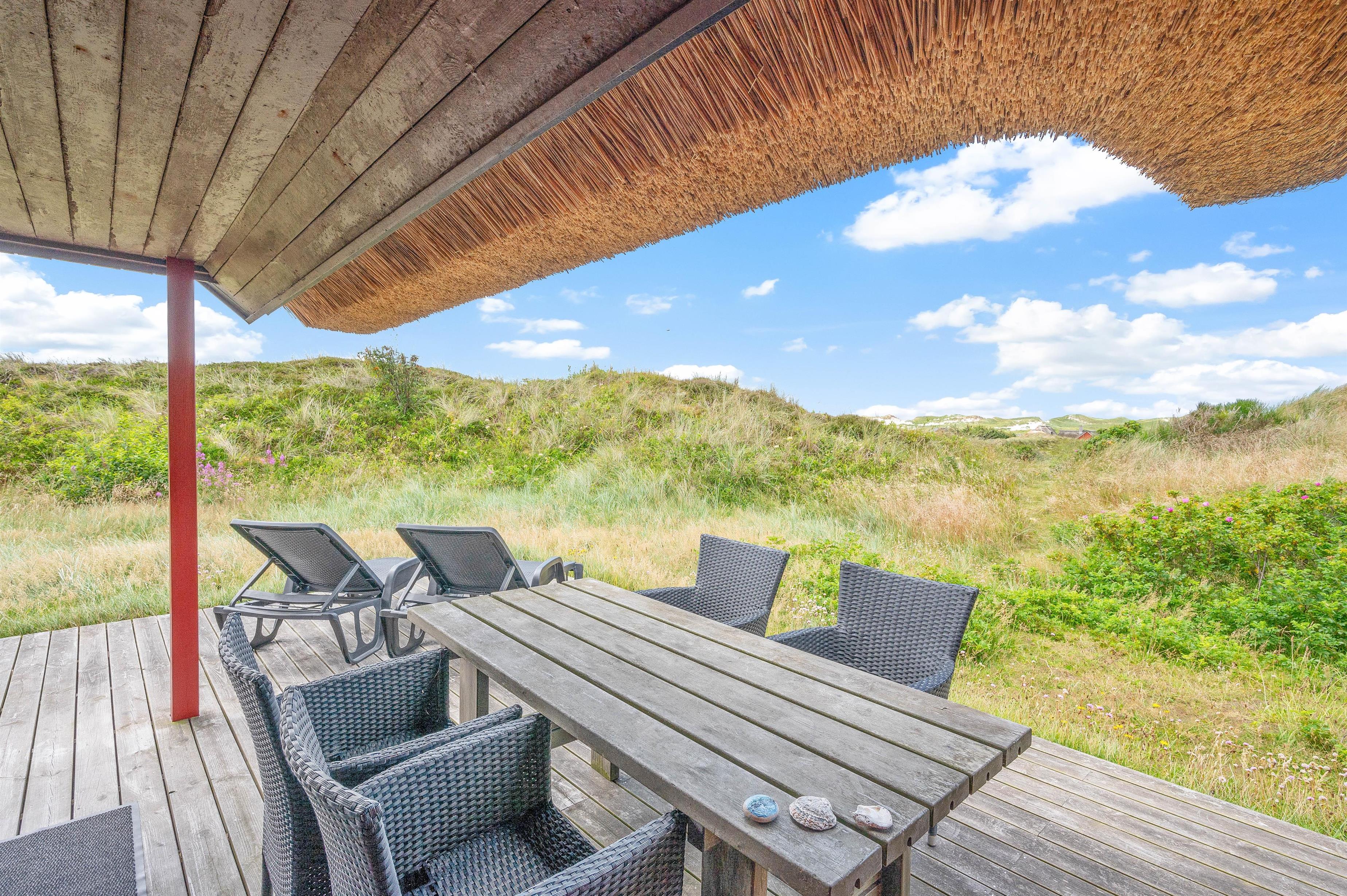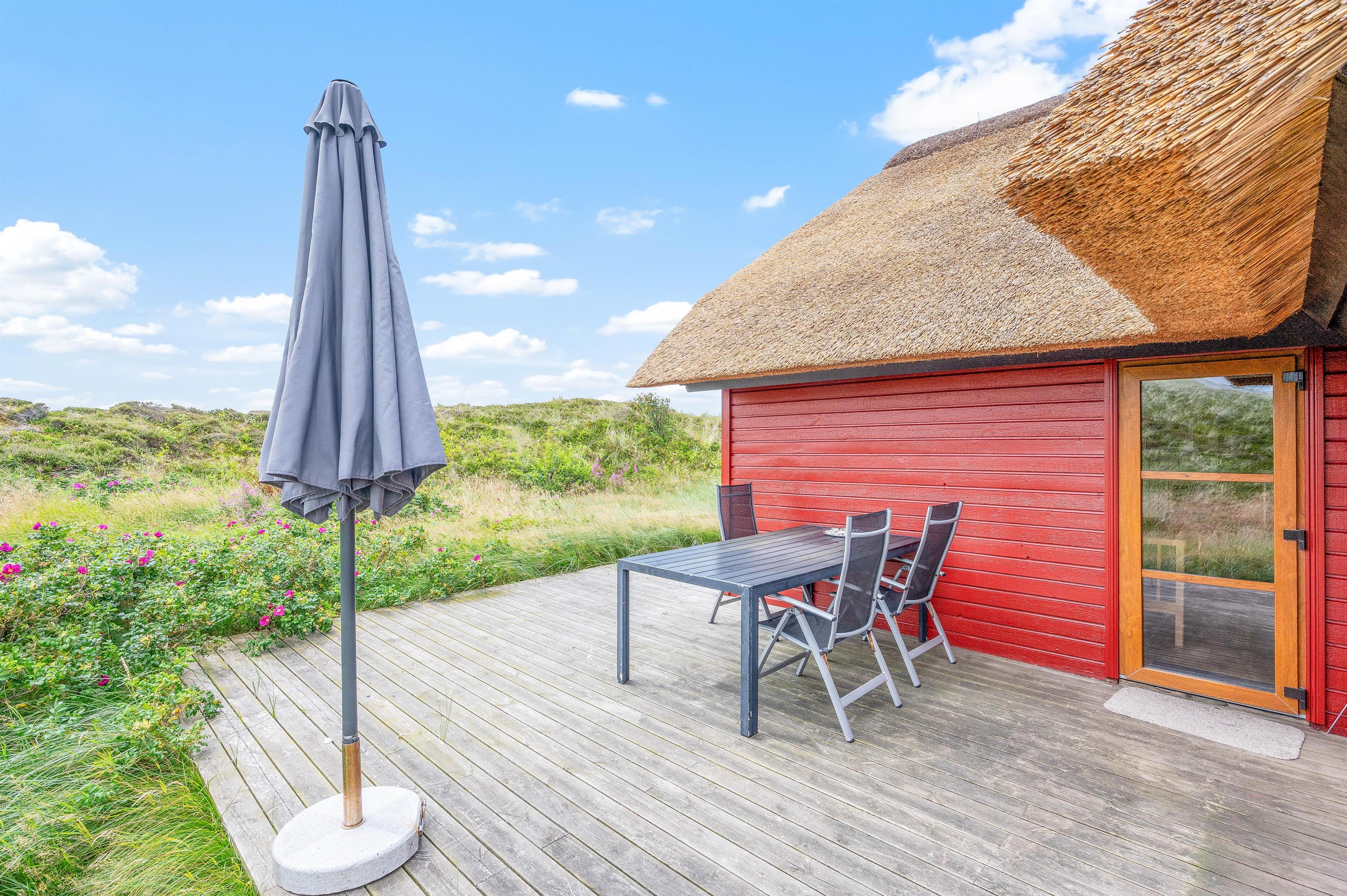 Fra stuen er der adgang til en dejlig, åben terrasse med udsigt over klitlandskabet. Her venter havemøblerne på jer, så I kan slappe af og nyde solens varme. Har I brug for at sidde i skyggen, er terrassen delvist overdækket – også her kan I med fordel nyde morgenkaffen eller aftensmaden, der er tilberedt på grillen. Afslut dagen med en gåtur med familien og hundene på stranden.