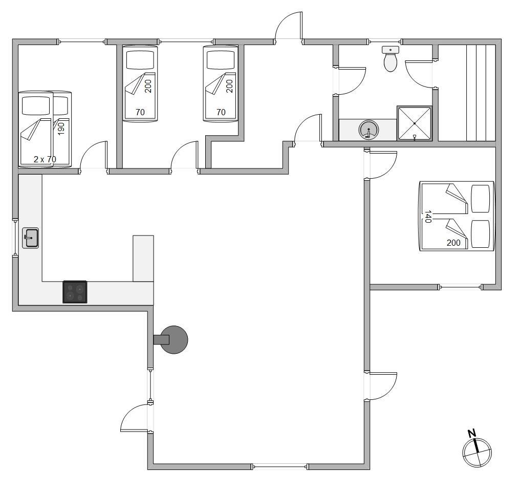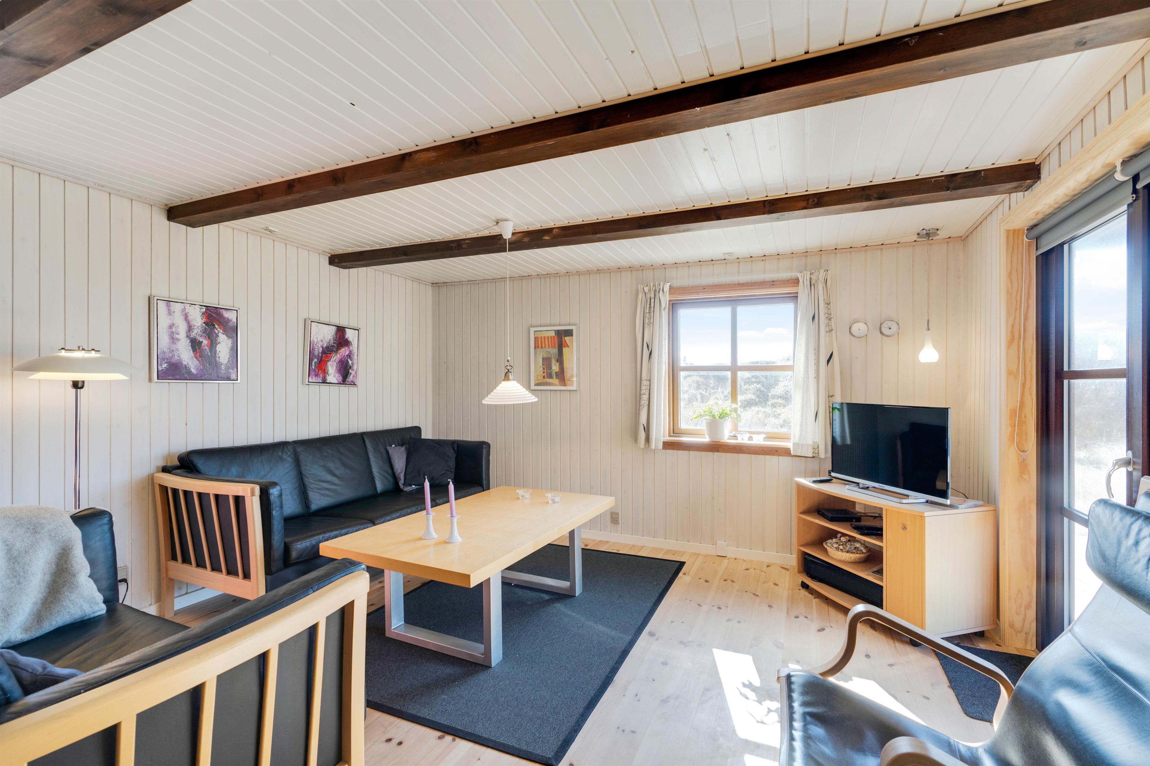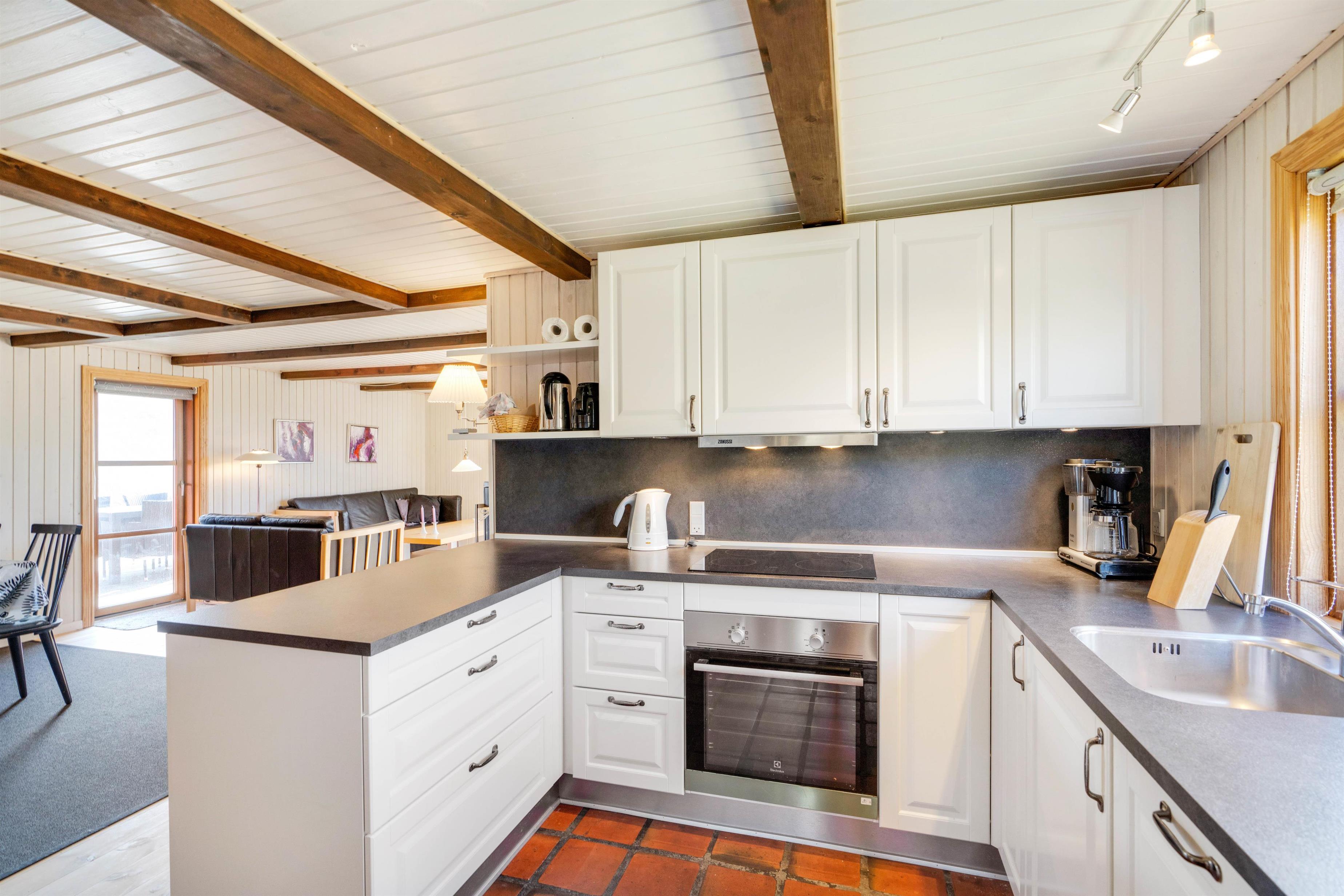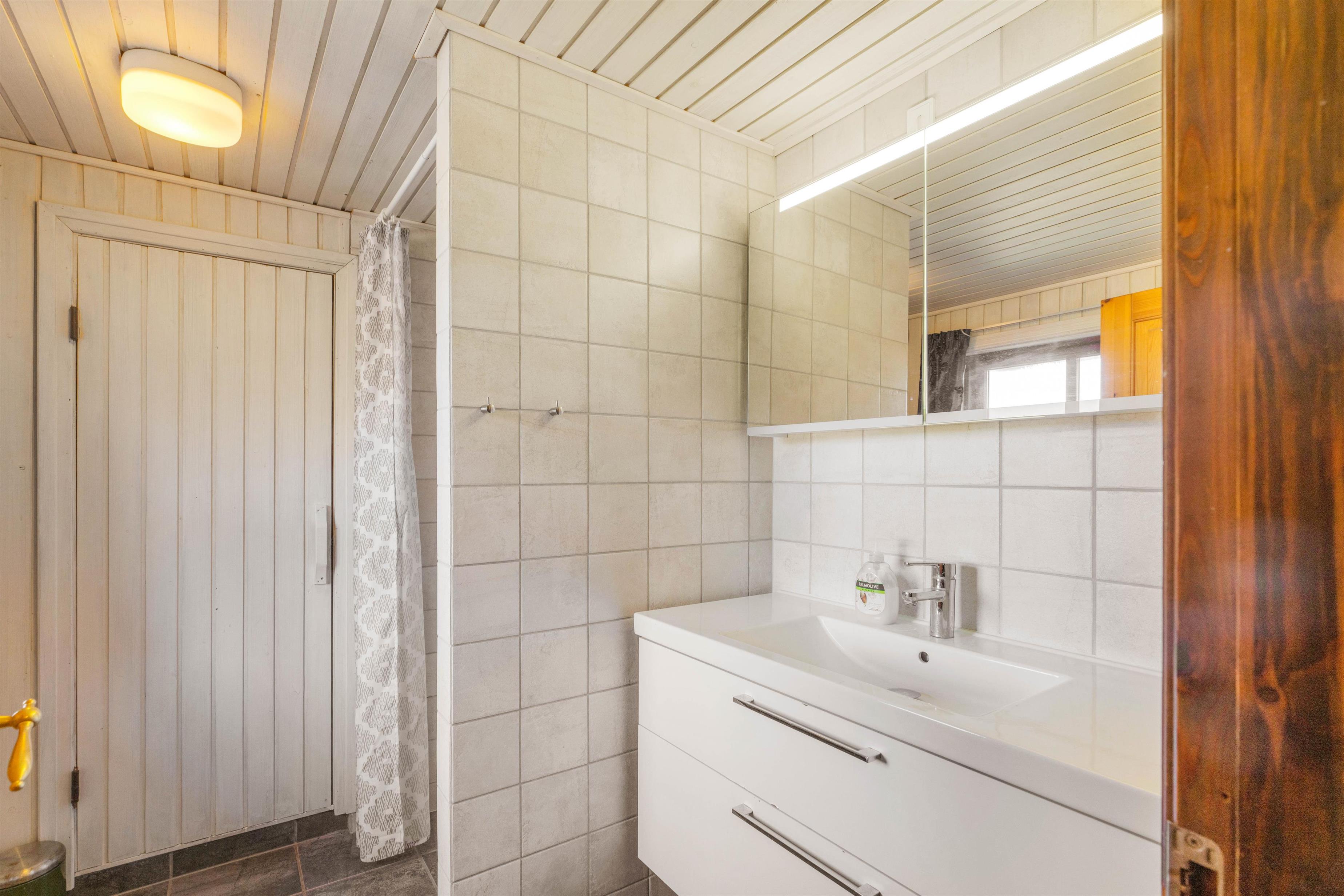 Her er 3 soverum med gulvtæppe. Det første har et stort skab med opbevaringsplads og en dobbeltseng, 140x200, det andet har 2 enkeltsenge, 70x200, mens det sidste værelse er perfekt til børnene. Her er nemlig en køjeseng, 70x190, som helt sikkert vil blive et hit. På badeværelset er der gulvvarme, så I ikke fryser tæerne om morgenen samt adgang til saunaen, hvor I kan få løsnet muskler og led op.