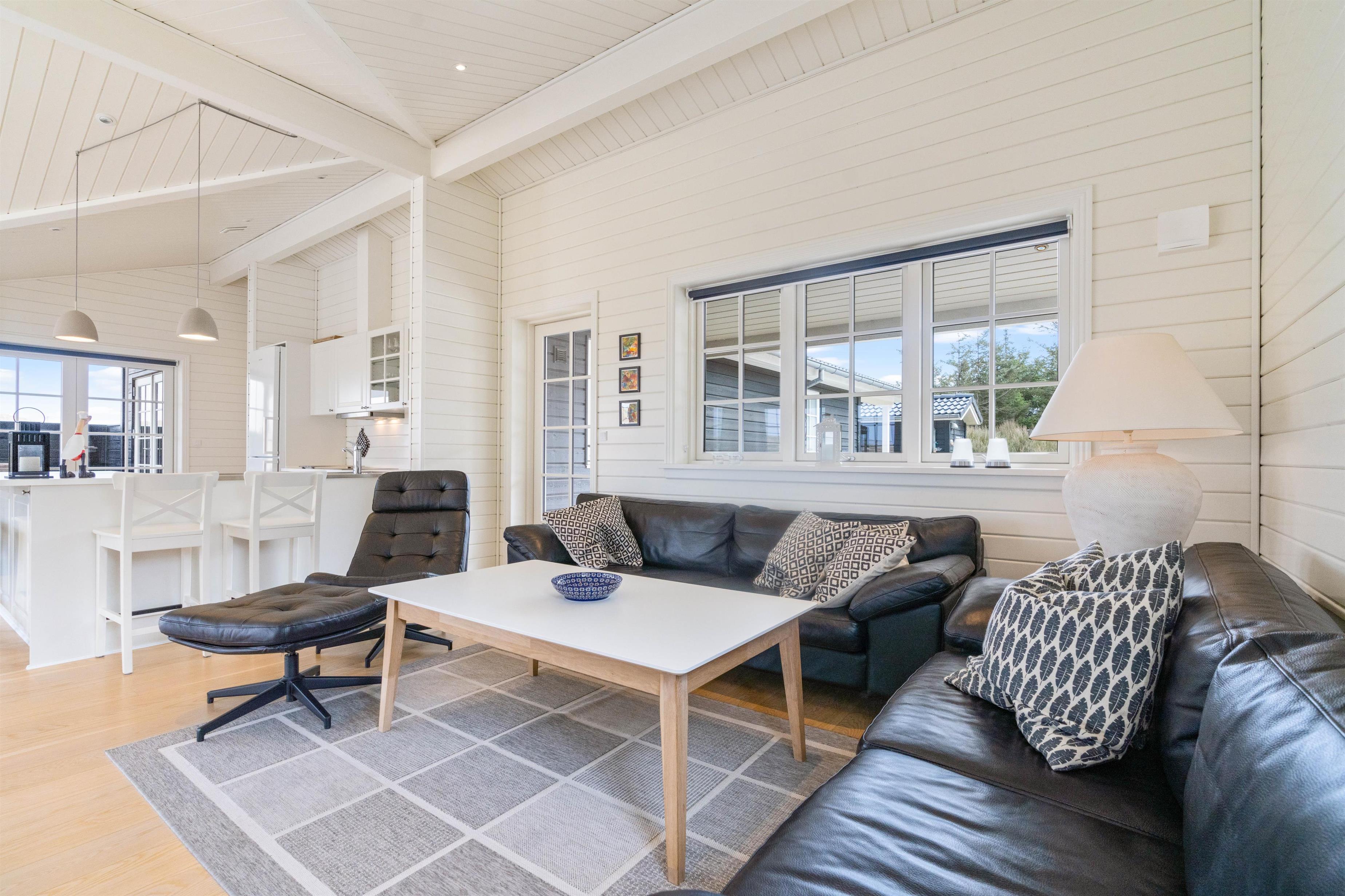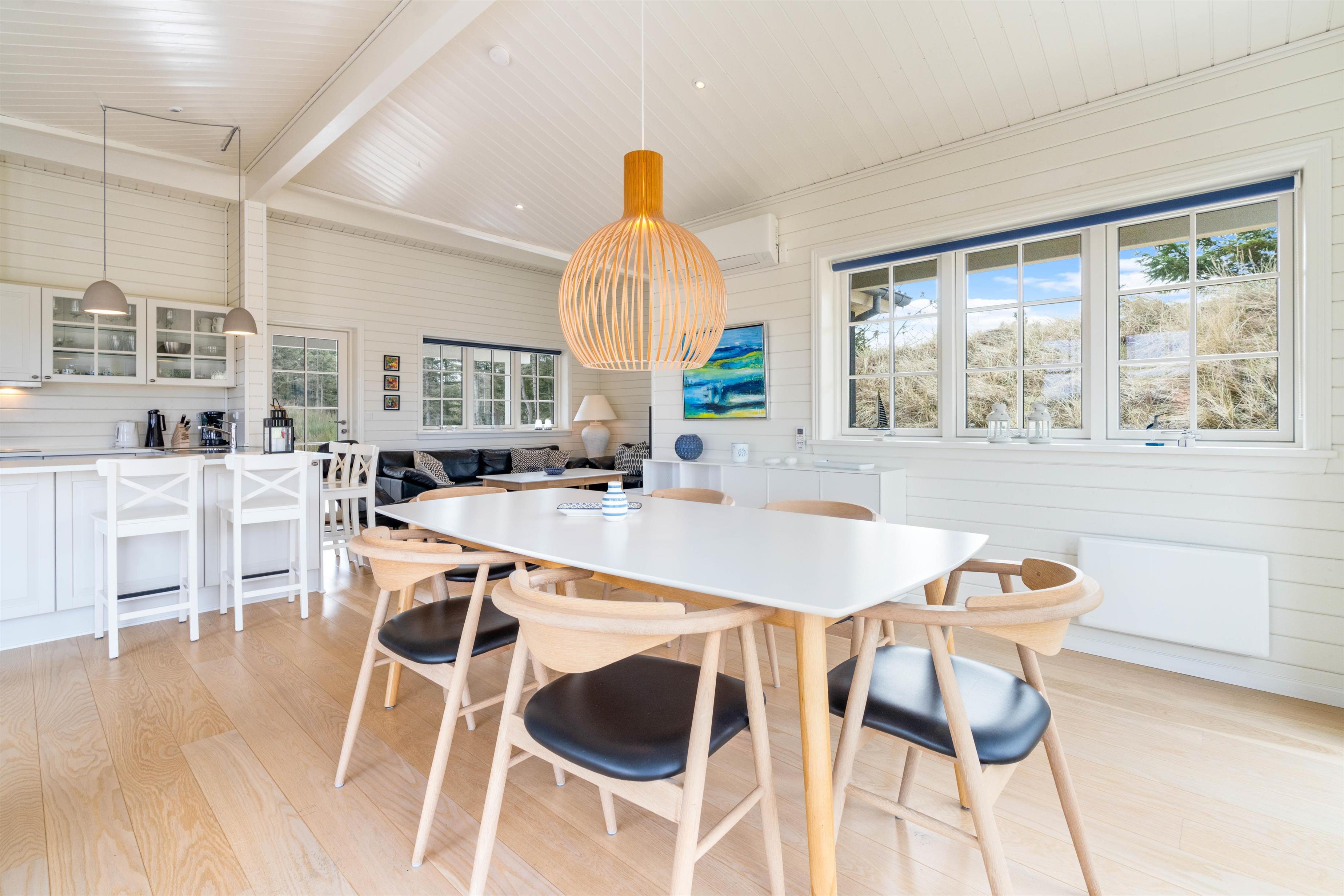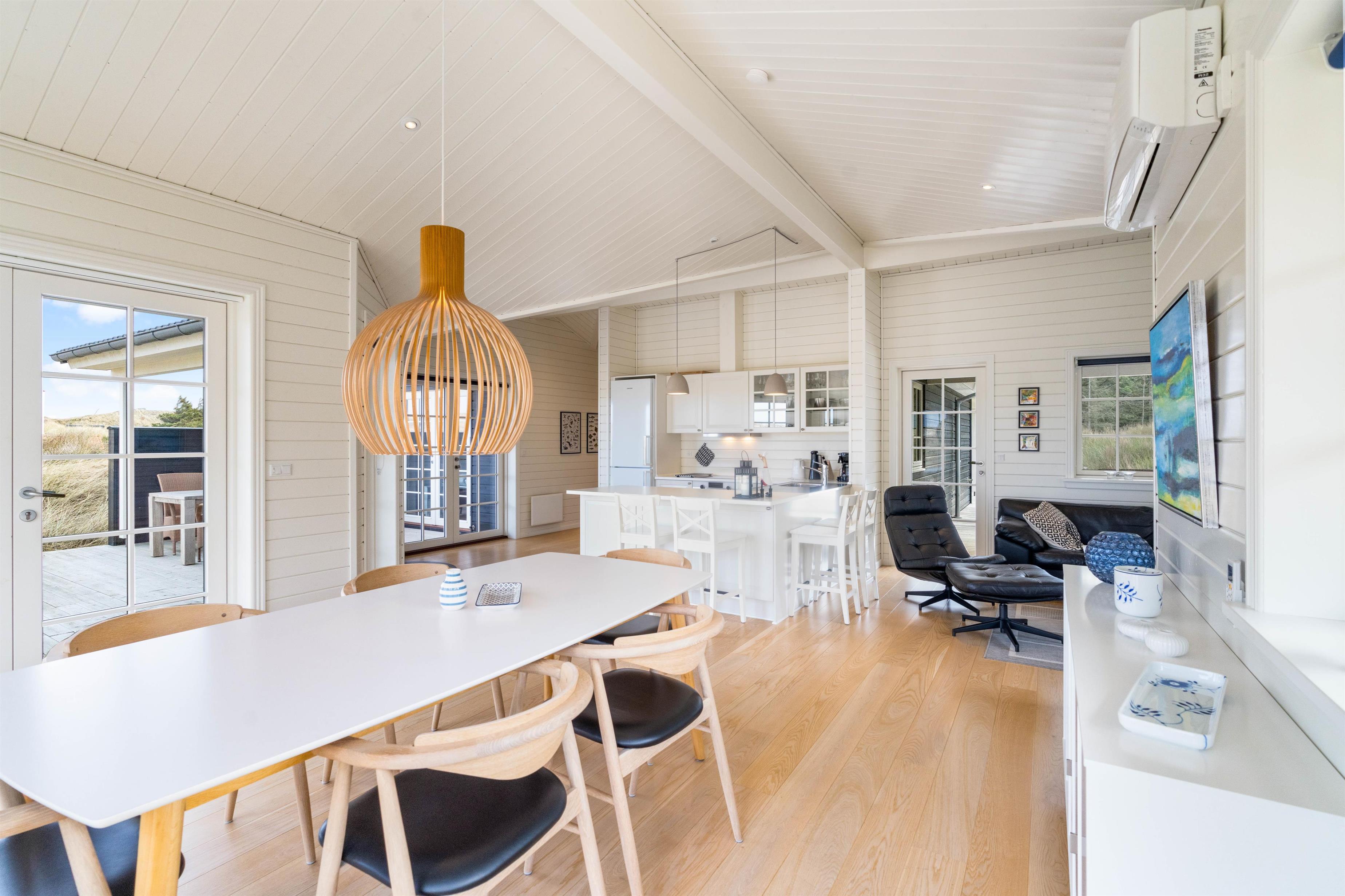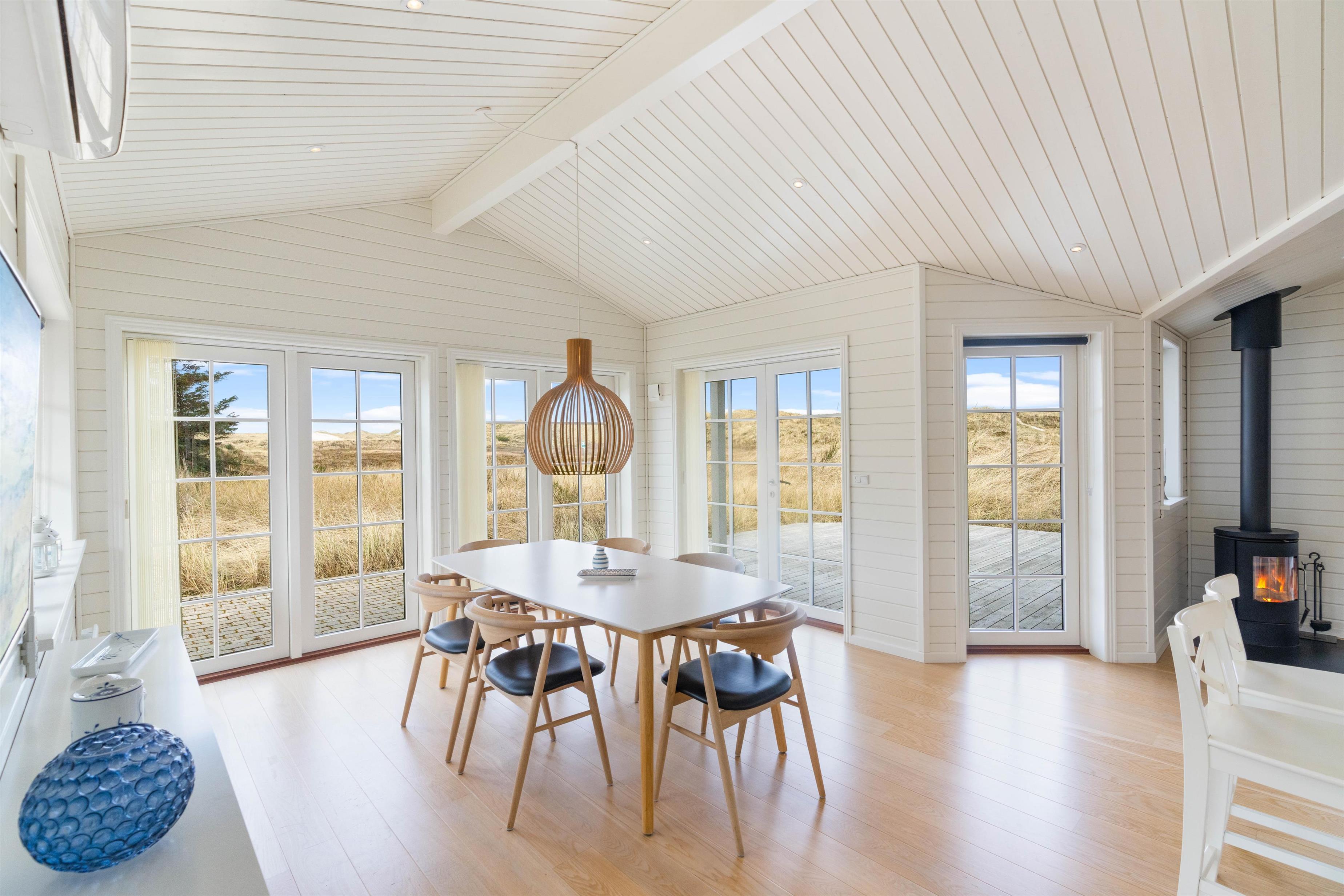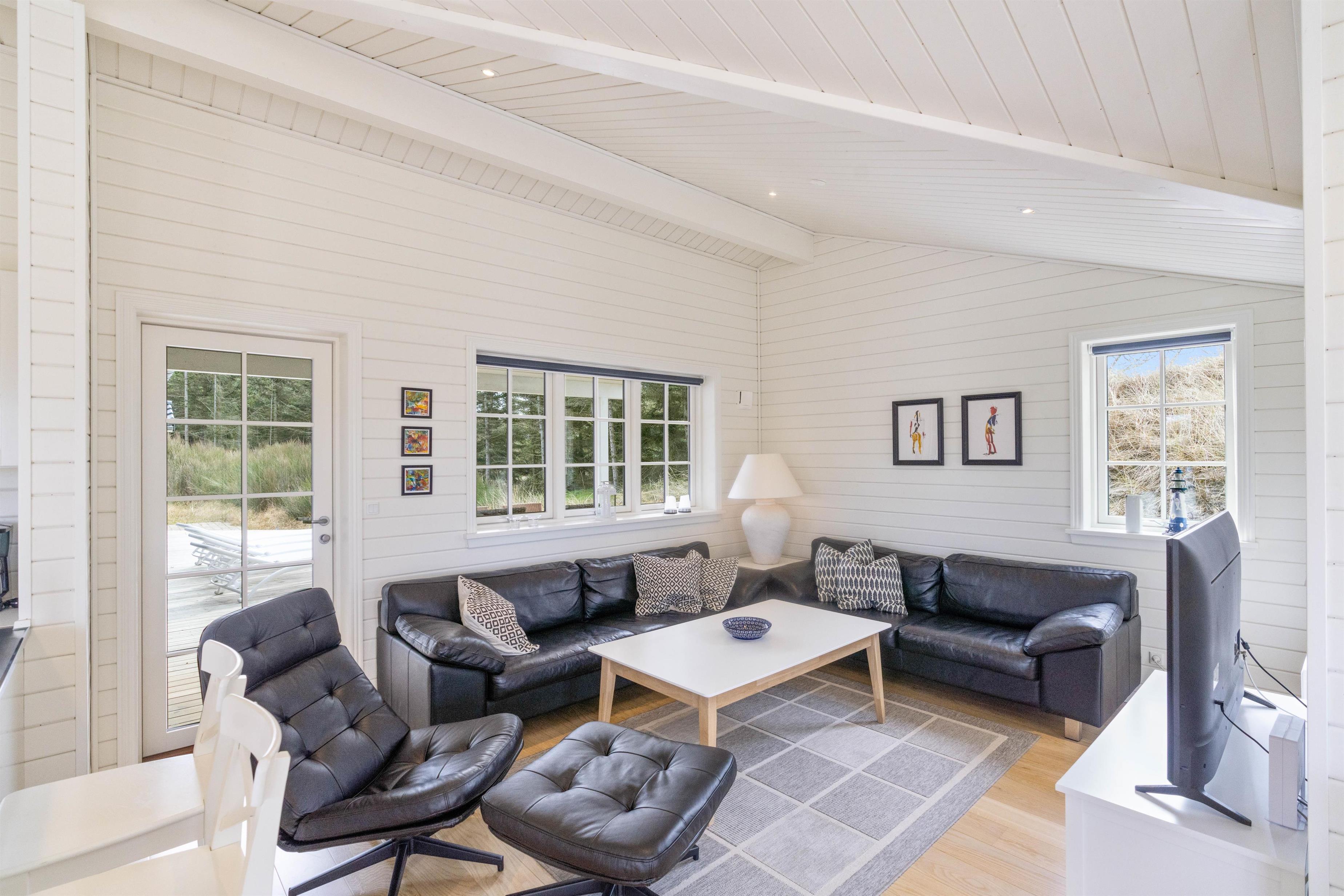 Centrum i huset er det lyse og godt indrettede opholdsrum med stue, køkken og spisestue i ét. Fra den praktiske og velindrettede køkkenafdeling med bl.a. opvaskemaskine, kan man således også følge med i livet i stuen. Opholdsstuen er rigtig hyggelig – og efter en lang tur langs stranden, kan man her nyde den knitrende ild i brændeovnen – eventuel med en god kop kaffe og en god bog, - og ikke mindst med udsigten til det storslåede klit-landskab, som på alle årstider er fantastisk fascinerende.
