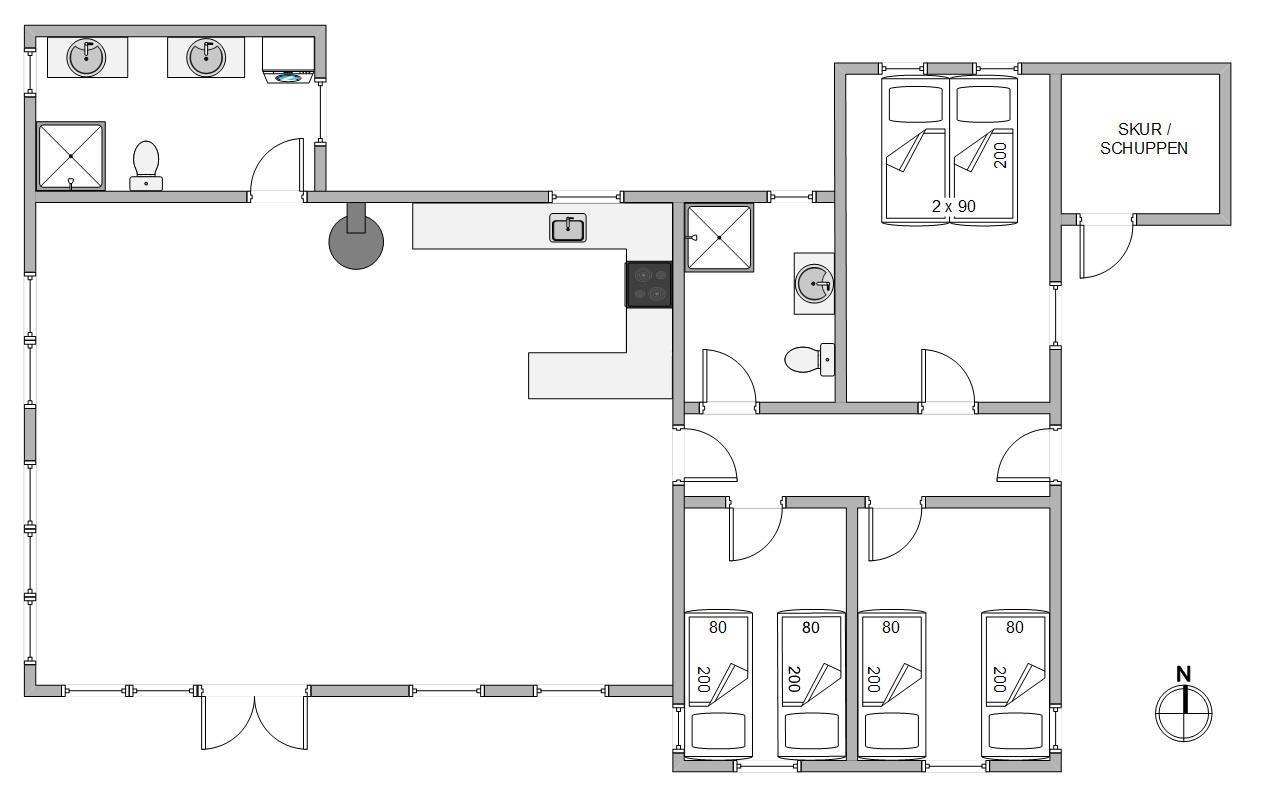 Der er 3 soveværelser i sommerhuset, som alle har en dobbeltseng. På badeværelset er der gulvvarme, så I ikke fryser om tæerne.
