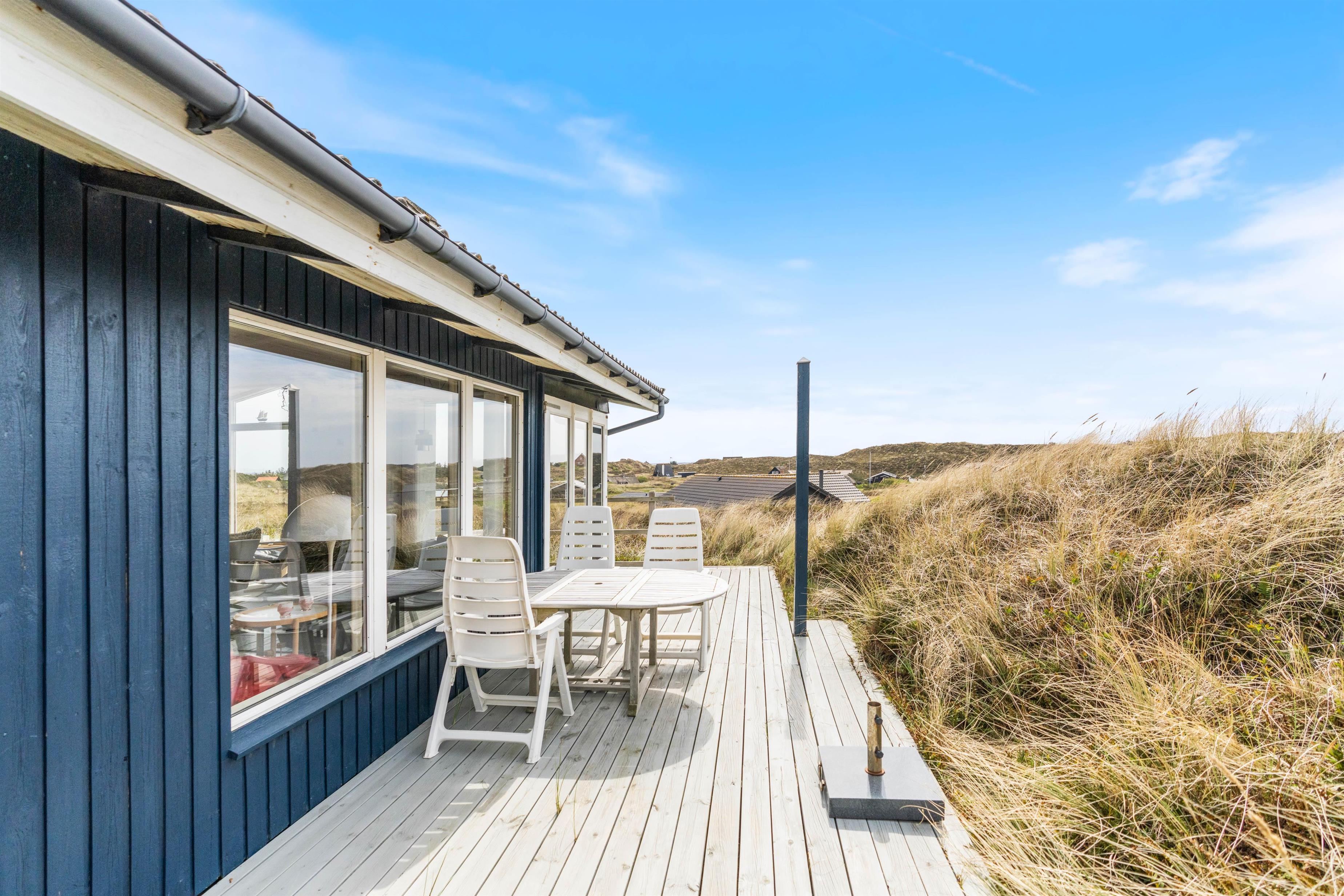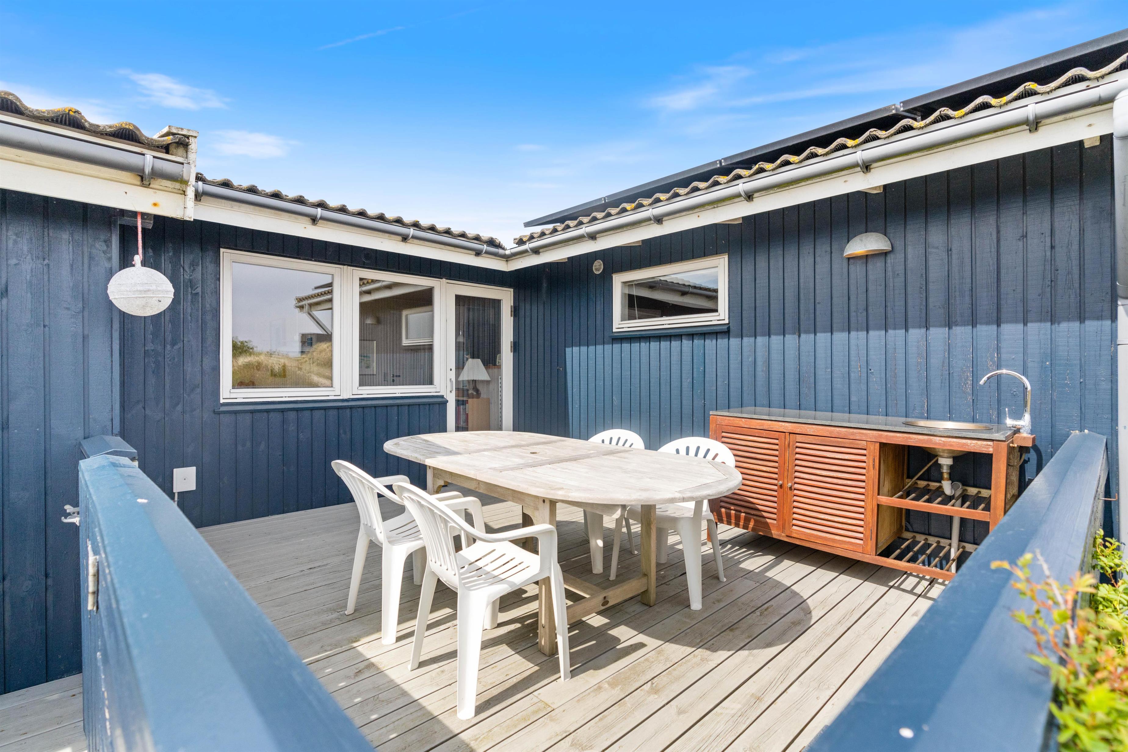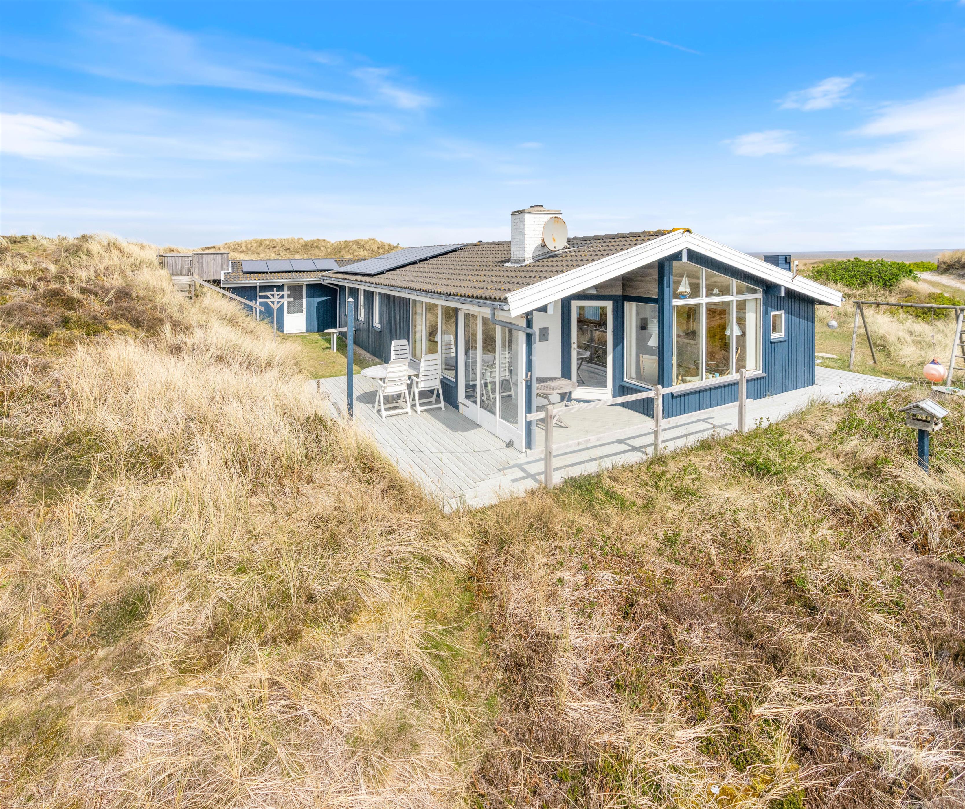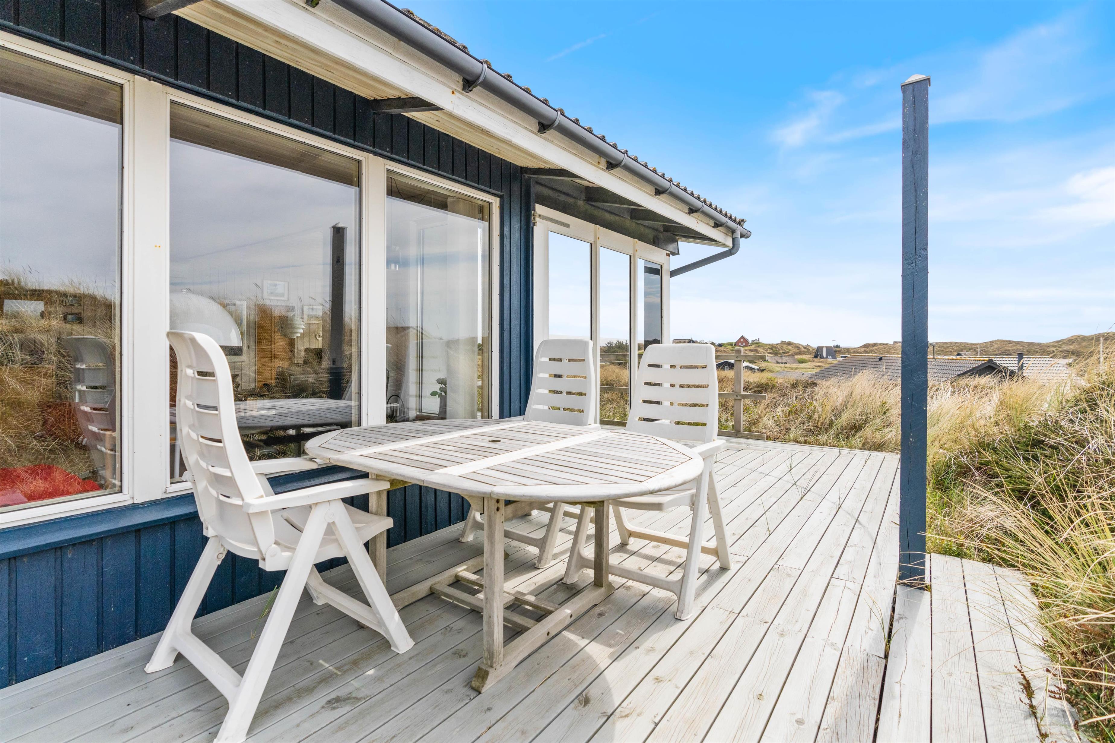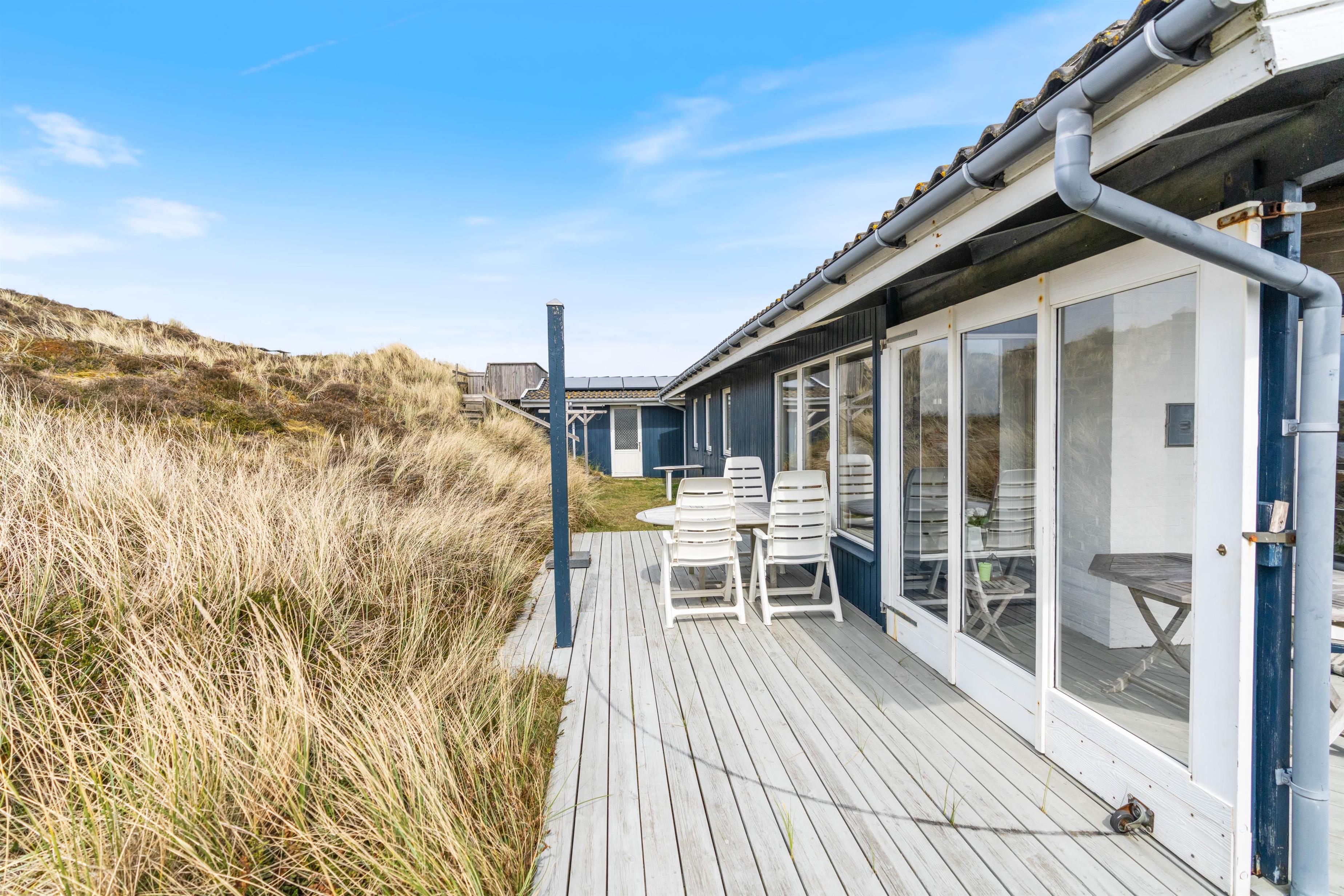 Skønt feriehus på Sønder Klitvej 182 med flere gode terrasser, så du har god mulighed for at sidde ude og nyde solen, den friske luft og ikke mindst den smukke udsigt over fjorden. Der er desuden garage og et udekøkken, som er helt perfekt til grillaftenerne og rensning af friskfangede fisk.