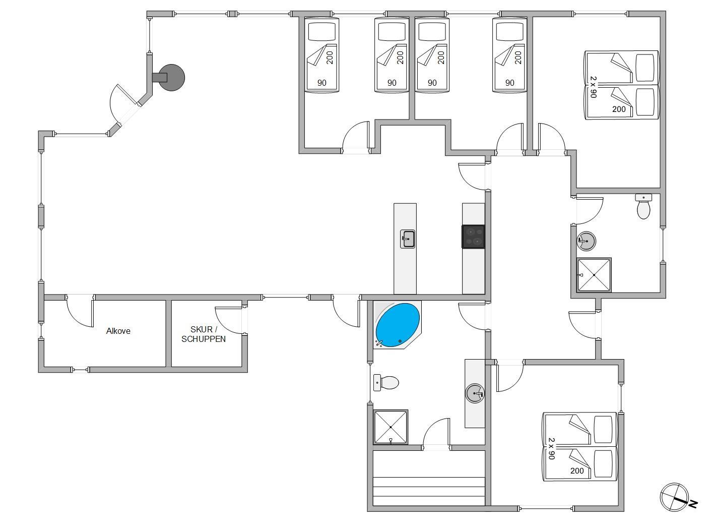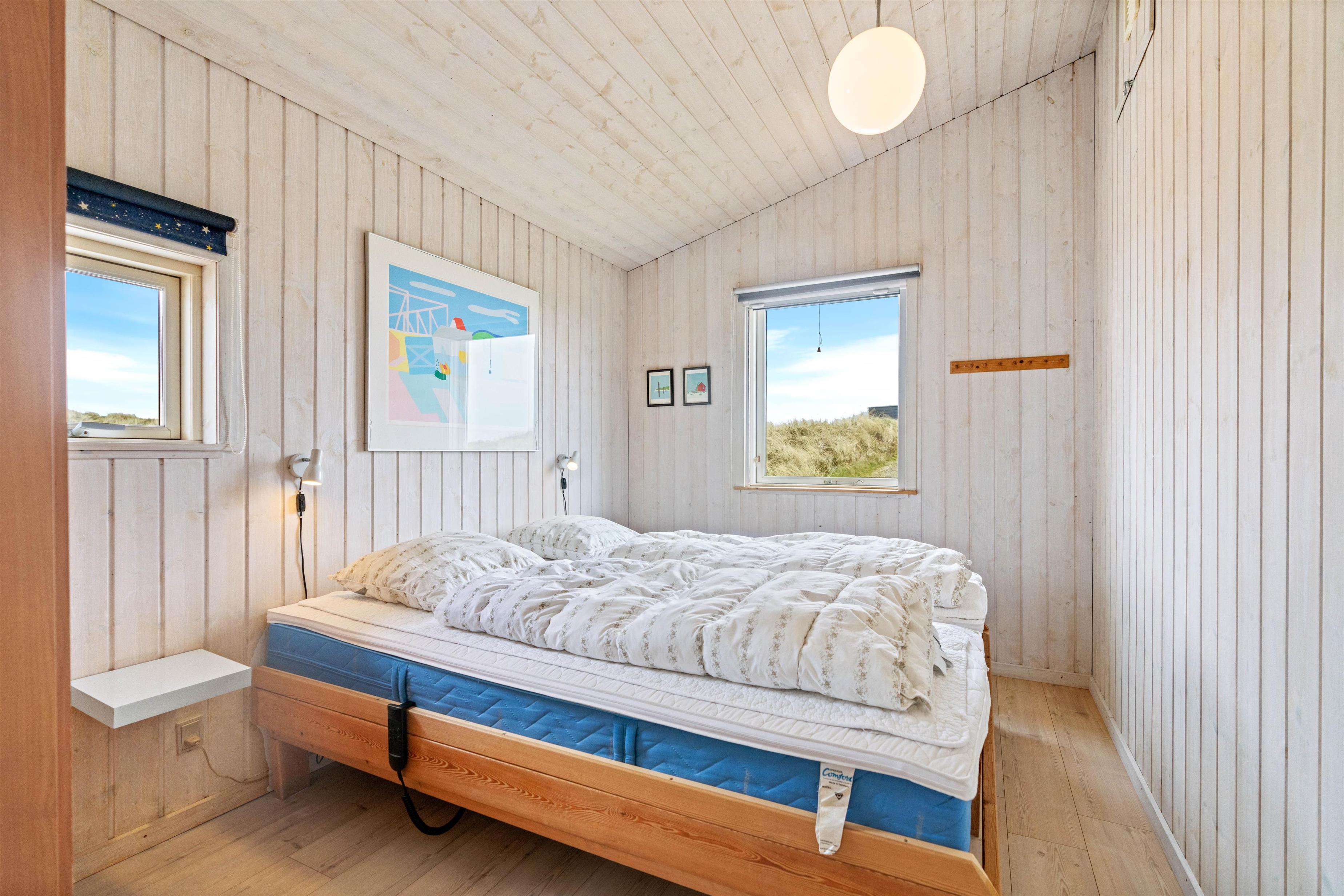 De gode soverum har indbyggede klædeskabe, så der er opbevaringsplads, og på det ene badeværelse er der både sauna og spabad, hvor du kan nyde et par afslappende stunder.