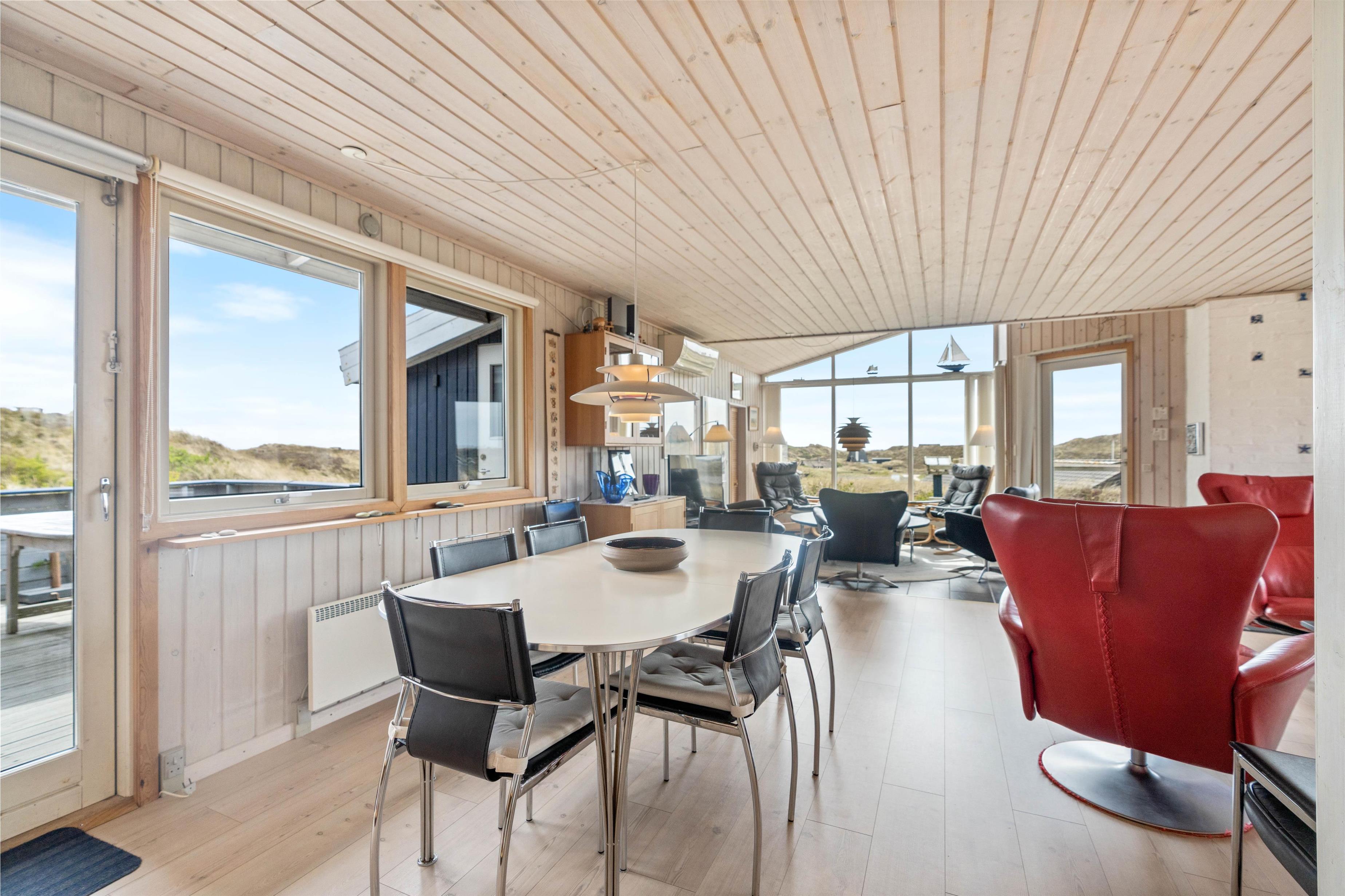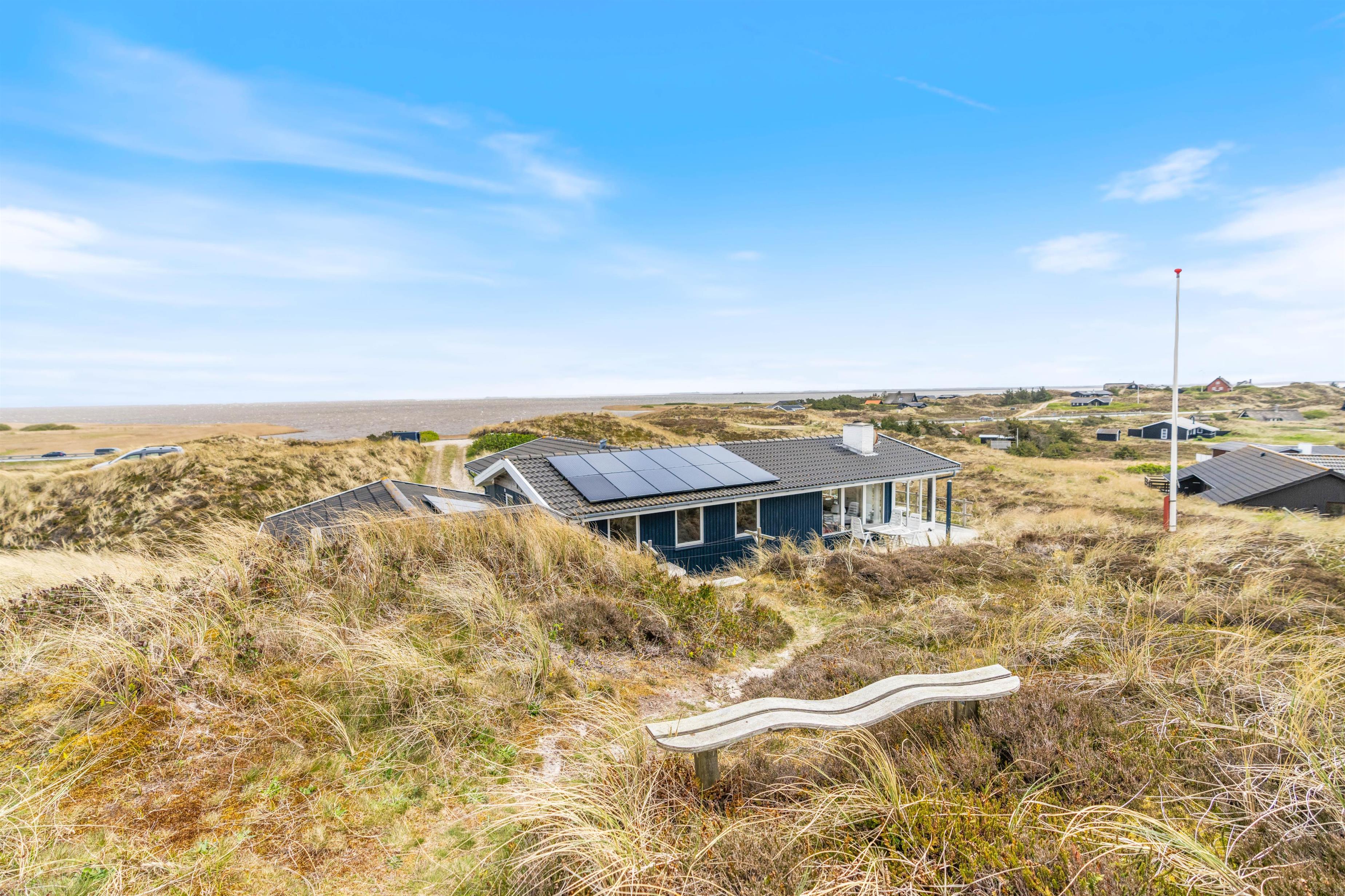 Feriehuset har en dejlig beliggenhed tæt på Ringkøbing Fjord, så både indefra huset og fra nogle af dets terrasser har du en utrolig smuk udsigt – bedre baggrund for morgenkaffe på terrassen eller grillhygge om aftenen findes ikke.